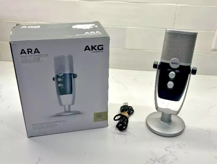 This AKG ARA C22-USB Dual Mode Condenser Microphone is perfect for home recording, podcasting, and gaming. With its plug and play feature, you can easily connect it to your USB port and start recording or podcasting right away. The microphone also has a mute switch and is mountable, making it easy to use for extended periods of time.Additionally, the AKG ARA C22-USB microphone has a silver color and is a condenser type transducer. It is suitable for home recording and falls under the categories of Microphones & Wireless Systems, Pro Audio Equipment, and Musical Instruments & Gear. The microphone comes with a stand and is perfect for those who want to start recording or podcasting without any hassle.