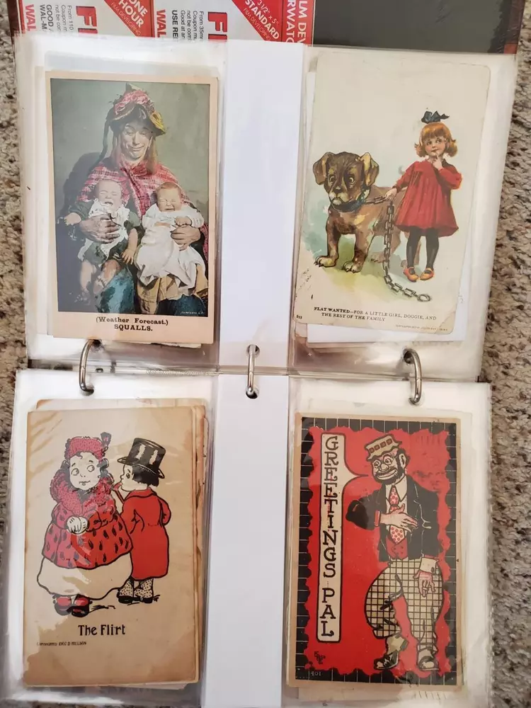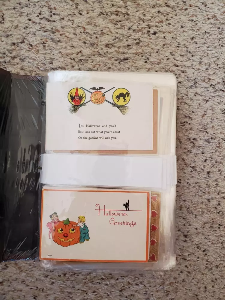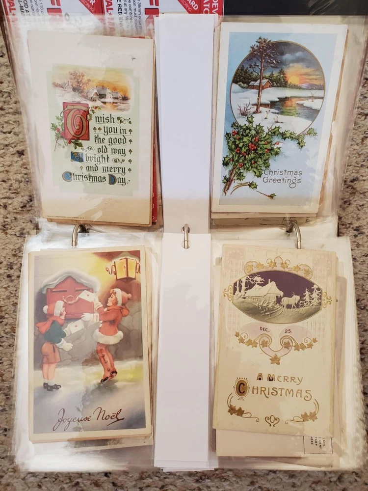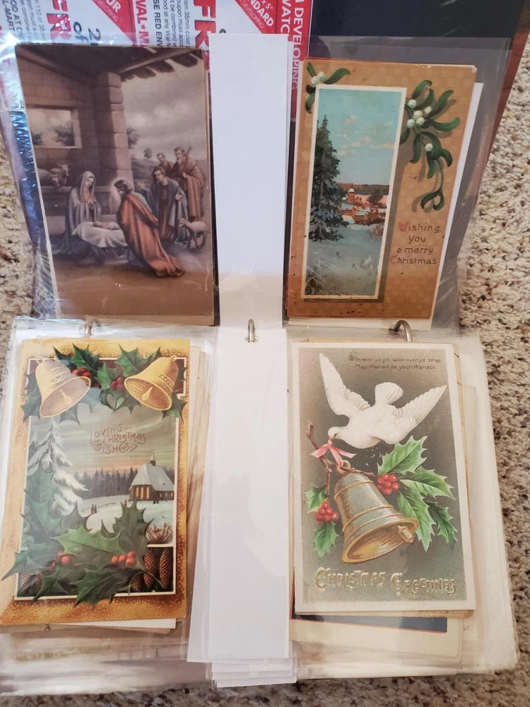 Up for bid is a wonderful 3-ring binder postcard album. The album itself was used to store and display vintage postcards by it's previous owner. The estimated age of the postcards it contains goes back to the 1910's to early 1920's. The 49 4-pocket acid-free plastic pages of this nearly-new album are filled with antique postcards on the front and back of each page, for a total of about 192 of them. There's is a mix of vintage quality holiday postcards including Halloween postcards and several Santa postcards. You'll also find some St. Patrick's Day, Valentine's Day, New Year, Christmas, Patriotic, Easter, Birthday, Friendship and Thanksgiving cards. There are some comic and romance postcards included as well. In addition, you'll find some fine view postcards from various locations, and some of them are real photo postcards. (see the supersized images that show a sampling of what comes with this auction). After looking over the pictures I've included I'm sure you'll agree that these postcards and the album are worth your bid. Here's a great find for the dealer or the collector. Some lucky bidder will walk away with it...will it be you? ALBUM & COLLECTION Of 190 Vintage POSTCARDS--HALLOWEEN, SANTAS, HOLIDAY, MORE ALBUM & COLLECTION Of 190 Vintage POSTCARDS--HALLOWEEN, SANTAS, HOLIDAY, MORE Click images to enlarge Description CHRYSTAL CITY CARDS PAPER ANTIQUES & COLLECTIBLES “Where Memories Are Chrystal Clear” rlaguardia, ebay member since January 2000 We are selling off a large collection of WONDERFUL VINTAGE POSTCARDS. CHECK OUT OUR OTHER AUCTIONS AND STORE ITEMS FOR MORE! Up for bid is a wonderful 3-ring binder postcard album. The album itself was used to store and display vintage postcards by it's previous owner. The estimated age of the postcards it contains goes back to the 1910's to early 1920's. The 49 4-pocket acid-free plastic pages of this album are filled with antique postcards on the front and back of each page, for a total of about 192 of them. There's is a mix of vintage quality holiday postcards including Halloween postcards and several Santa postcards. You'll also find some St. Patrick's Day, Valentine's Day, New Year, Christmas, Patriotic, Easter, Birthday, Friendship and Thanksgiving cards. There are some comic and romance postcards included in as well. In addition, you'll find some fine view postcards from various locations, some of them are real photo postcards. (see the supersized images that show a sampling of what comes with this auction). After looking over the pictures I've included I'm sure you'll agree that these postcards and the album are worth your bid. Here's a great find for the dealer or the collector. Some lucky bidder will walk away with it...will it be you? CONDITION CONDITION : The album itself is in very good condition. The front and back covers show very little wear, and the binding is holding the 49 acid-free plastic pages firmly. The postcards contained in the album are in good-to-very good vintage condition, with a few visible creases, stains and rips, handwriting here and there. This album and it's antique contents are in very good condition and must be seen in person to appreciate. A PICTURE IS WORTH A THOUSAND WORDS! It’s an important part of the item description. Viewing the supersized images is like looking at an item under a magnifying glass. Before you bid, supersize the images and study them carefully . AFTER YOU WIN Expected Payment : Payment to be received within 7 days after close of auction. Buyer pays S&H. Communication : The winner will receive an invoice requesting payment within one business day after the auction ends. After payment has cleared, an Email will be sent to inform the winner that the album has been shipped. A copy of the invoice will accompany the shipment. CAREFUL Packaging : The album will be carefully packed in a sturdy medium-sized USPS priority mail box for maximum protection. FAST Shipping : Items are shipped the next business day, via USPS priority mail, after payment clears. Tracking will be added to domestic shipments. SORRY—NO SHIPMENTS OUTSIDE THE U.S. ON THIS AUCTION. Contact us if you have any questions. Be sure to visit my other auctions and eBay Store where you’ll find a wide variety of vintage postcards. Check my feedback and bid with confidence. Good luck! Images sell! Get Supersized Images & Free Image Hosting Create your brand with Auctiva's Customizable Templates. Attention Sellers - Get Templates Image Hosting, Scheduling at Auctiva.com. Track Page Views With Auctiva's Counter