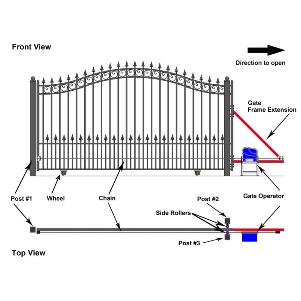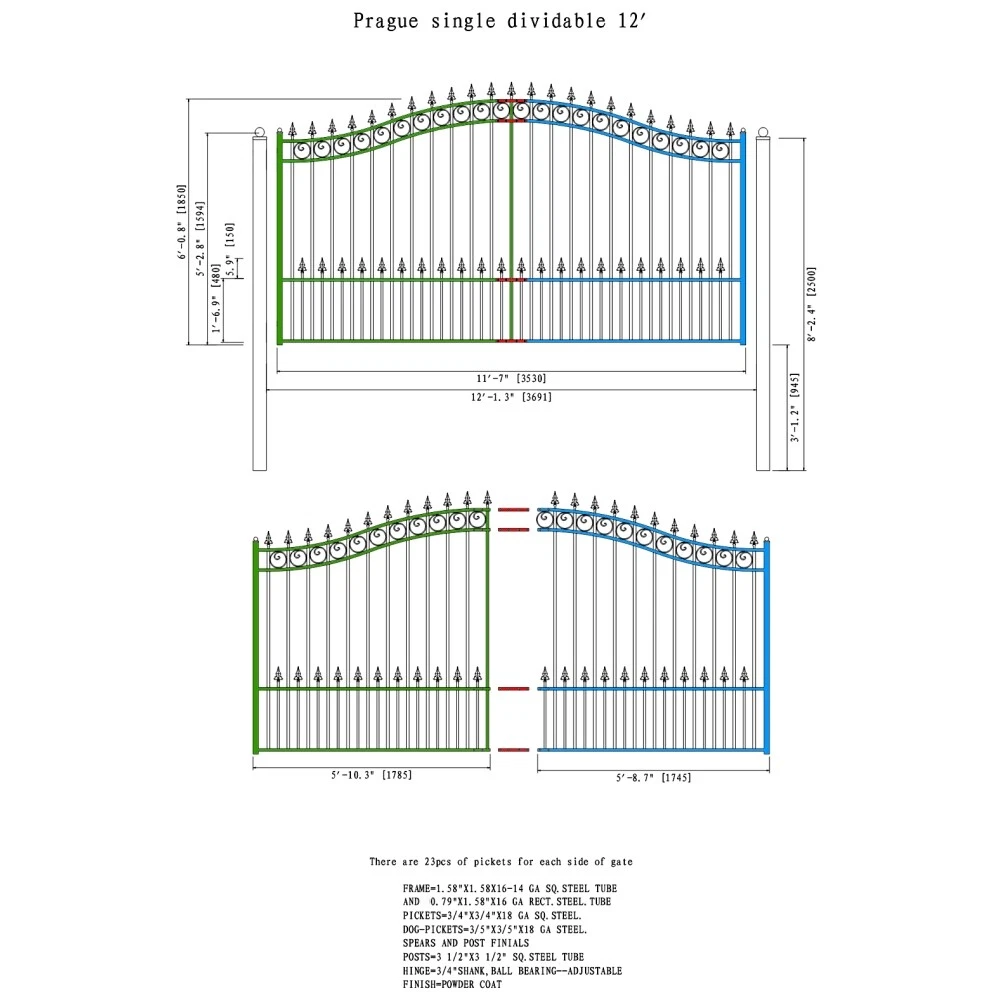 ALEKO Automated Yard Steel Sliding 12' Driveway Gate Prague Style with Operator Gate Specification: ALEKO Sliding Driveway Gate Prague Style with Gate Opener Sliding Gate specially designed for DIY installation Maintenance free, no painting or staining, corrosion resistance Powder-coated finish helps prevent rust, cracking, peeling, and chipping Durable and strong all welded construction Material: Galvanized steel gate with a powder paint coating 10-year Gate warranty and 1-year Gate Opener warranty Post Dimensions: 8' L x 3.5" W x 3.5" H Dimensions: 12 ft x 6 ft No welding required Color: Black Included: 2 Gate panels, 3 Gate Posts, Side Frame Extension Bracket, 2 Side Rollers 12-inch each, 2 V-Groove Gate Wheels (4-inch each), 4 V-Tracks (6 feet each), Electric Operator, Wireless Keypad, Set of Photocell, Wired Push Button, Chain 20 feet, Mounting Metal Base, 2 Remotes, Mounting Hardware, Manual Operator Features: Power supply AC 120V 60Hz/ 3/4 HP equivalent/ Auto-Close Feature Gate moving speed - 32 ft/min, Output torque = 14Nm, Noise <56 dB Motor speed 1680 rpm/ Operating Time: 0 - 44 seconds Remote control distance = 30 m Environmental temp -68°F ~ +122°F Output shaft 58.5 mm/ Output power of motor 750W Pedestrian mode/ Single Phase Motor Manual key release design for emergency purposes Description: ALEKO Kit 12' x 6' Single Sliding Driveway Gate Prague Style with Chain Gate Opener, specially designed for the easiest installation. The gate is fully welded from hot-dipped galvanized steel, and the powder-coated finish helps prevent rust, chipping, and wearing. Galvanized Steel is a process that protects the steel from rust and corrosion. The powder coating actually increases the life of galvanized steel. Unlike conventional paints, powder coated paints will not peel, chip or crack. Make this driveway gate into an automatic gate by installing a Gate Opener that increases home security and enhances the aesthetics of your property. Terms of Sale In order to get a refund item should be returned back to us within 30 days from the date it been received. We do accept returns, customer pays return shipping. Unit has 1 year replacement warranty. In order to get a replacement you should request return authorization form and ship the item you want to replace back to us, include form with the return. Please request form by email. Please note that all returns without the form will not be processed and will be refused. Shipping LTL Shipping - Less Than Truckload Freight Shipping Services For large and oversized products, we use LTL shipping. After your product ships from our warehouse, you will receive an email containing tracking information and details about the freight carrier assigned to your order. Shortly following the shipment, you will be contacted by the carrier to set up a delivery date. CUSTOMERS MUST BE PRESENT FOR THE DELIVERY OR FEES FROM THE FREIGHT COMPANY WILL INCUR. Transit times vary depending on your delivery area. Curbside Delivery only We do our best to process your order as soon as possible. We process 80% of our sales online. We ship our products within 24-48 hours. Please note due to the Holiday time packages could be delayed! Please note that freight shipment processing time is longer and for some cases can take up to 5 business days. Buyer is responsible for all charges and payments of all customs clearance fees, duties and taxes, if any. We provide free shipping to US continental only. For US territory additional shipping will apply, please contact us for a shipping quote. Please note that we do not ship to US Protectorate, APO/FPO, PO Box by FedEx, they have to choose USPS. There is no free shipping for US Protectorate, APO/FPO, PO Box