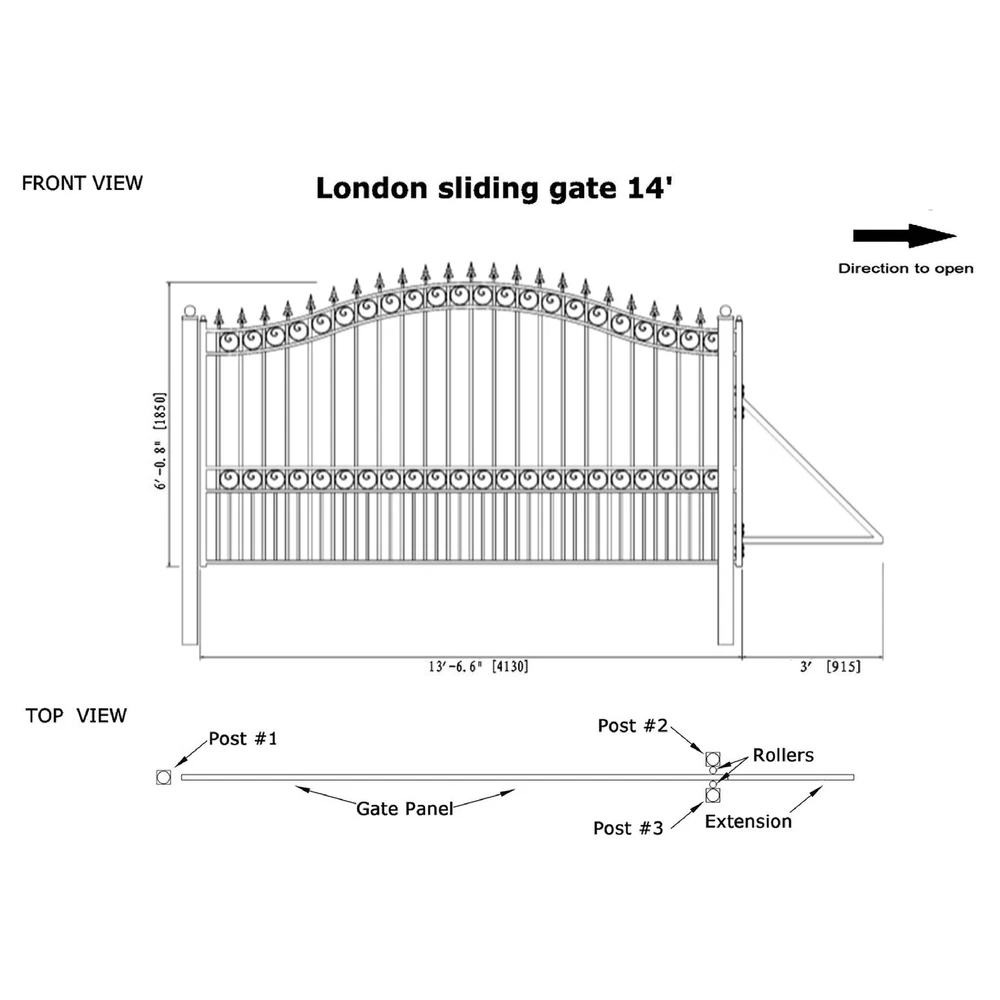 ALEKO Automated Yard Steel Sliding 14' Driveway Gate London Style with Opener Gate Specification: ALEKO Sliding Driveway Gate London Style with Gate Opener Sliding Gate specially designed for DIY installation Maintenance free, no painting or staining, corrosion resistance Powder-coated finish helps prevent rust, cracking, peeling, and chipping Durable and strong all welded construction Material: Galvanized steel gate with a powder paint coating 10-year Gate warranty and 1-year Gate Opener warranty Post Dimensions: 8' L x 3.5" W x 3.5" H Dimensions: 14 ft x 6 ft No welding required Color: Black Included: 2 Gate panels, 3 Gate Posts, Side Frame Extension Bracket, 2 Side Rollers 12-inch each, 2 V-Groove Gate Wheels (4-inch each), 4 V-Tracks (6 feet each), Electric Operator, Wireless Keypad, Set of Photocell, Wired Push Button, Chain 20 feet, Mounting Metal Base, 2 Remotes, Mounting Hardware, Manual Operator Features: Power supply AC 120V 60Hz/ 3/4 HP equivalent/ Auto-Close Feature Gate moving speed - 32 ft/min, Output torque = 14Nm, Noise <56 dB Motor speed 1680 rpm/ Operating Time: 0 - 44 seconds Remote control distance = 30 m Environmental temp -68°F ~ +122°F Output shaft 58.5 mm/ Output power of motor 750W Pedestrian mode/ Single Phase Motor Manual key release design for emergency purposes Description: ALEKO Kit 14' x 6' Single Sliding Driveway Gate London Style with Chain Gate Opener, specially designed for the easiest installation. The gate is fully welded from hot-dipped galvanized steel, and the powder-coated finish helps prevent rust, chipping, and wearing. Galvanized Steel is a process that protects the steel from rust and corrosion. The powder coating actually increases the life of galvanized steel. Unlike conventional paints, powder coated paints will not peel, chip or crack. Make this driveway gate into an automatic gate by installing a Gate Opener that increases home security and enhances the aesthetics of your property. Terms of Sale In order to get a refund item should be returned back to us within 30 days from the date it been received. We do accept returns, customer pays return shipping. Unit has 1 year replacement warranty. In order to get a replacement you should request return authorization form and ship the item you want to replace back to us, include form with the return. Please request form by email. Please note that all returns without the form will not be processed and will be refused. Shipping LTL Shipping - Less Than Truckload Freight Shipping Services For large and oversized products, we use LTL shipping. After your product ships from our warehouse, you will receive an email containing tracking information and details about the freight carrier assigned to your order. Shortly following the shipment, you will be contacted by the carrier to set up a delivery date. CUSTOMERS MUST BE PRESENT FOR THE DELIVERY OR FEES FROM THE FREIGHT COMPANY WILL INCUR. Transit times vary depending on your delivery area. Curbside Delivery only We do our best to process your order as soon as possible. We process 80% of our sales online. We ship our products within 24-48 hours. Please note due to the Holiday time packages could be delayed! Please note that freight shipment processing time is longer and for some cases can take up to 5 business days. Buyer is responsible for all charges and payments of all customs clearance fees, duties and taxes, if any. We provide free shipping to US continental only. For US territory additional shipping will apply, please contact us for a shipping quote. Please note that we do not ship to US Protectorate, APO/FPO, PO Box by FedEx, they have to choose USPS. There is no free shipping for US Protectorate, APO/FPO, PO Box