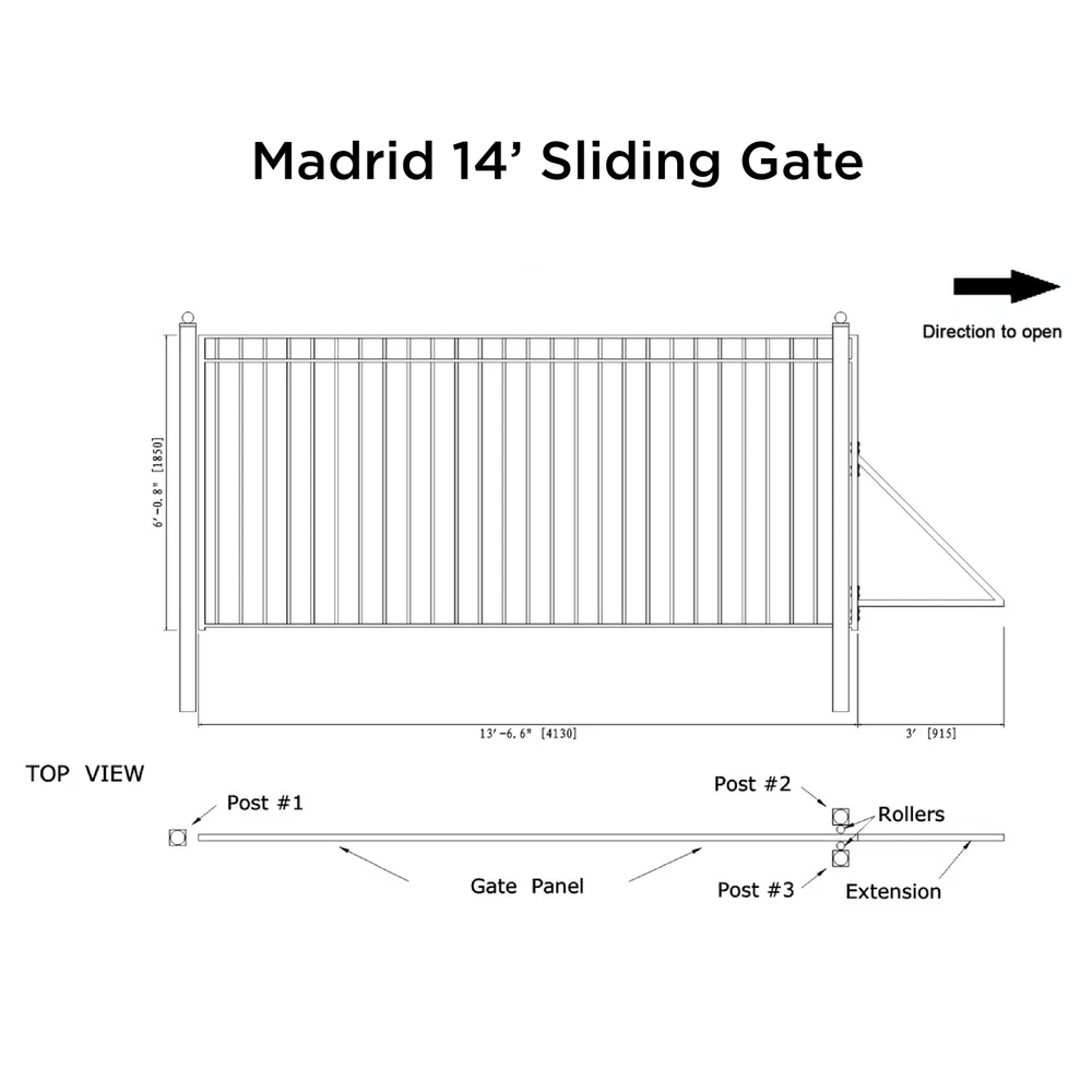 ______________________________________________________________________________________________________________________________________________________________________________________________ Visit Our Store - ALEKO_PRODUCTS ALEKO Automated Yard Steel Sliding 14' Driveway Gate Madrid Style with Opener Description: ALEKO Kit 14' x 6' Single Sliding Driveway Gate Madrid Style with Chain Gate Opener, specially designed for the easiest installation. The gate is fully welded from hot-dipped galvanized steel, and the powder-coated finish helps prevent rust, chipping, and wearing. Galvanized Steel is a process that protects the steel from rust and corrosion. The powder coating actually increases the life of galvanized steel. Unlike conventional paints, powder coated paints will not peel, chip or crack. Make this driveway gate into an automatic gate by installing a Gate Opener that increases home security and enhances the aesthetics of your property. Gate Specification: ALEKO Sliding Driveway Gate Madrid Style with Gate Opener Sliding Gate specially designed for DIY installation Maintenance free, no painting or staining, corrosion resistance Powder-coated finish helps prevent rust, cracking, peeling, and chipping Durable and strong all welded construction Material: Galvanized steel gate with a powder paint coating 10-year Gate warranty and 1-year Gate Opener warranty Post Dimensions: 9' L x 3.5" W x 3.5" H Dimensions: 14 ft x 6 ft No welding required Color: Black Included: 2 Gate panels, 3 Gate Posts, Side Frame Extension Bracket, 2 Side Rollers 12-inch each, 2 V-Groove Gate Wheels (4-inch each), 4 V-Tracks (6 feet each), Electric Operator, Wireless Keypad, Set of Photocell, Wired Push Button, Chain 20 feet, Mounting Metal Base, 2 Remotes, Mounting Hardware, Manual Operator Features: Power supply AC 120V 60Hz/ 3/4 HP equivalent/ Auto-Close Feature Gate moving speed - 32 ft/min, Output torque = 14Nm, Noise <56 dB Motor speed 1680 rpm/ Operating Time: 0 - 44 seconds Remote control distance = 30 m Environmental temp -68°F ~ +122°F Output shaft 58.5 mm/ Output power of motor 750W Pedestrian mode/ Single Phase Motor Manual key release design for emergency purposes Different Models and Sizes Visit Our Store- ALEKO_PRODUCTS Terms of Sale We accept Pay pal and credit card payments. Payment should be completed within 4 (Four) days of auction closing. Or unpaid dispute will be filed for closing auction. Sales Tax of 9.5% will be applied for orders shipped within the state of Washington. We will leave a positive feedback immediately after payment is received. We appreciate a positive feedback as much as you do. If for some reason there is any issue with the purchase, please contact us prior to leaving feedback, and we will be glad to work with you to have it resolved. Shipping LTL Shipping - Less Than Truckload Freight Shipping Services For large and oversized products, we use LTL shipping. After your product ships from our warehouse, you will receive an email containing tracking information and details about the freight carrier assigned to your order. Shortly following the shipment, you will be contacted by the carrier to set up a delivery date. CUSTOMERS MUST BE PRESENT FOR THE DELIVERY OR FEES FROM THE FREIGHT COMPANY WILL INCUR. Transit times vary depending on your delivery area. Curbside Delivery only We provide free shipping to US continental only. Please note that we do not ship to US Protectorate, APO/FPO, PO Box by Fedex, they have to choose USPS. There is no free shipping for US Protectorate, APO/FPO, PO Box. We do our best to process your order as soon as possible. All products and all orders from our web site are shipped from our Seattle WA warehouse within 1-2 business days by FedEx, UPS, US Postal Service carriers. Buyer is responsible for all charges and payments of all customs clearance fees, duties and taxes, if any. Our products include: Driveway Gates, Iron Fence, Pedestrian gates, Sliding Gate Openers, Swing Gate Openers, Solar Gate Openers, Solar Panel Electric Locks, gate Parts and Accessories. Location: We are located in the state of Washington. We process 80% of our sales online. Local pick-up is welcome. Please note that freight shipment processing time is longer and for some cases can take up to 5 business days.