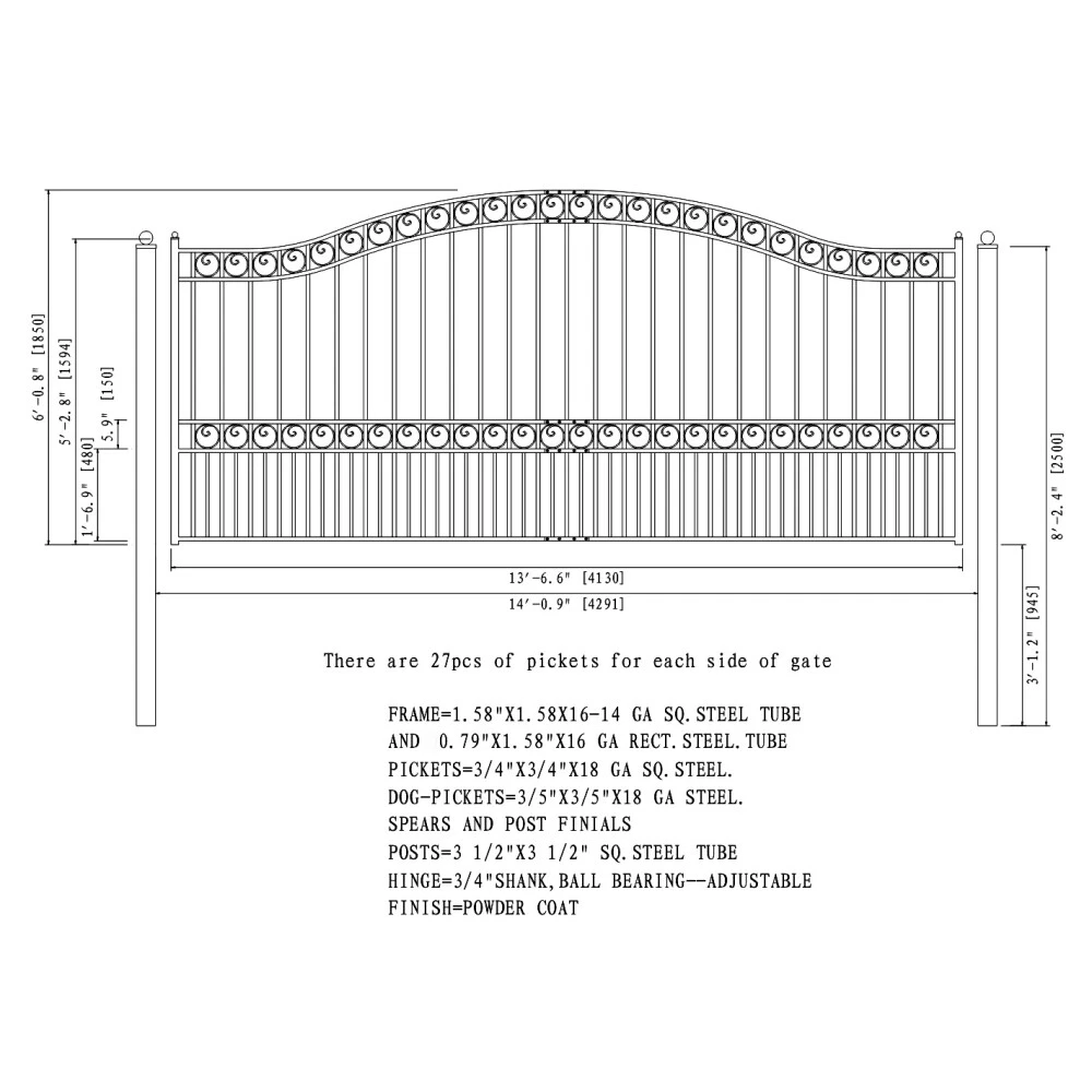 ALEKO Automated Yard Steel Sliding 14' Driveway Gate Paris Style with Opener Gate Specification: ALEKO Sliding Driveway Gate Paris Style with Gate Opener Sliding Gate specially designed for DIY installation Maintenance free, no painting or staining, corrosion resistance Powder-coated finish helps prevent rust, cracking, peeling, and chipping Durable and strong all welded construction Material: Galvanized steel gate with a powder paint coating 10-year Gate warranty and 1-year Gate Opener warranty Post Dimensions: 8' L x 3.5" W x 3.5" H Dimensions: 14 ft x 6 ft No welding required Color: Black Included: 2 Gate panels, 3 Gate Posts, Side Frame Extension Bracket, 2 Side Rollers 12-inch each, 2 V-Groove Gate Wheels (4-inch each), 4 V-Tracks (6 feet each), Electric Operator, Wireless Keypad, Set of Photocell, Wired Push Button, Chain 20 feet, Mounting Metal Base, 2 Remotes, Mounting Hardware, Manual Operator Features: Power supply AC 120V 60Hz/ 3/4 HP equivalent/ Auto-Close Feature Gate moving speed - 32 ft/min, Output torque = 14Nm, Noise <56 dB Motor speed 1680 rpm/ Operating Time: 0 - 44 seconds Remote control distance = 30 m Environmental temp -68°F ~ +122°F Output shaft 58.5 mm/ Output power of motor 750W Pedestrian mode/ Single Phase Motor Manual key release design for emergency purposes Description: ALEKO Kit 14' x 6' Single Sliding Driveway Gate Paris Style with Chain Gate Opener, specially designed for the easiest installation. The gate is fully welded from hot-dipped galvanized steel, and the powder-coated finish helps prevent rust, chipping, and wearing. Galvanized Steel is a process that protects the steel from rust and corrosion. The powder coating actually increases the life of galvanized steel. Unlike conventional paints, powder coated paints will not peel, chip or crack. Make this driveway gate into an automatic gate by installing a Gate Opener that increases home security and enhances the aesthetics of your property. Terms of Sale In order to get a refund item should be returned back to us within 30 days from the date it been received. We do accept returns, customer pays return shipping. Unit has 1 year replacement warranty. In order to get a replacement you should request return authorization form and ship the item you want to replace back to us, include form with the return. Please request form by email. Please note that all returns without the form will not be processed and will be refused. Shipping LTL Shipping - Less Than Truckload Freight Shipping Services For large and oversized products, we use LTL shipping. After your product ships from our warehouse, you will receive an email containing tracking information and details about the freight carrier assigned to your order. Shortly following the shipment, you will be contacted by the carrier to set up a delivery date. CUSTOMERS MUST BE PRESENT FOR THE DELIVERY OR FEES FROM THE FREIGHT COMPANY WILL INCUR. Transit times vary depending on your delivery area. Curbside Delivery only We do our best to process your order as soon as possible. We process 80% of our sales online. We ship our products within 24-48 hours. Please note due to the Holiday time packages could be delayed! Please note that freight shipment processing time is longer and for some cases can take up to 5 business days. Buyer is responsible for all charges and payments of all customs clearance fees, duties and taxes, if any. We provide free shipping to US continental only. For US territory additional shipping will apply, please contact us for a shipping quote. Please note that we do not ship to US Protectorate, APO/FPO, PO Box by FedEx, they have to choose USPS. There is no free shipping for US Protectorate, APO/FPO, PO Box