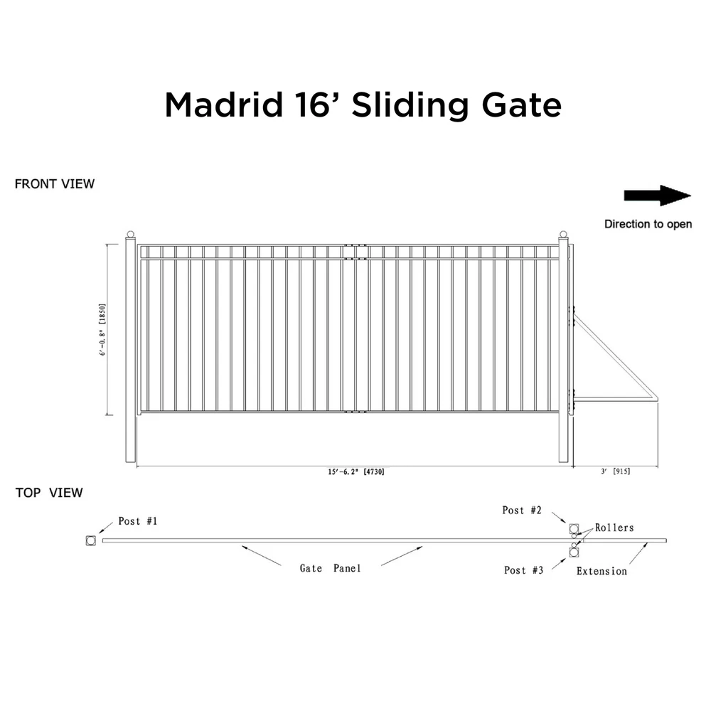 ALEKO Automated Yard Steel Sliding 16' Driveway Gate Madrid Style with Opener Description: ALEKO Kit 16' x 6' Single Sliding Driveway Gate Madrid Style with Chain Gate Opener, specially designed for the easiest installation. The gate is fully welded from hot-dipped galvanized steel, and the powder-coated finish helps prevent rust, chipping, and wearing. Galvanized Steel is a process that protects the steel from rust and corrosion. The powder coating actually increases the life of galvanized steel. Unlike conventional paints, powder coated paints will not peel, chip or crack. Make this driveway gate into an automatic gate by installing a Gate Opener that increases home security and enhances the aesthetics of your property ALEKO Gates - YouTube Video will open in a new window Gate Specification: ALEKO Sliding Driveway Gate Madrid Style with Gate Opener Sliding Gate specially designed for DIY installation Maintenance free, no painting or staining, corrosion resistance Powder-coated finish helps prevent rust, cracking, peeling, and chipping Durable and strong all welded construction Material: Galvanized steel gate with a powder paint coating 10-year Gate warranty and 1-year Gate Opener warranty Post Dimensions: 9' L x 3.5" W x 3.5" H Dimensions: 16 ft x 6 ft No welding required Color: Black Included: 2 Gate panels, 3 Gate Posts, Side Frame Extension Bracket, 2 Side Rollers 12-inch each, 2 V-Groove Gate Wheels (4-inch each), 6 V-Tracks (6 feet each), Electric Operator, Wireless Keypad, Set of Photocell, Wired Push Button, Chain 20 feet, Mounting Metal Base, 2 Remotes, Mounting Hardware, Manual Operator Features: Power supply AC 120V 60Hz/ 3/4 HP equivalent/ Auto-Close Feature Gate moving speed - 32 ft/min, Output torque = 14Nm, Noise <56 dB Motor speed 1680 rpm/ Operating Time: 0 - 44 seconds Remote control distance = 30 m Environmental temp -68°F ~ +122°F Output shaft 58.5 mm/ Output power of motor 750W Pedestrian mode/ Single Phase Motor Manual key release design for emergency purposes Terms of Sale We accept Pay pal and credit card payments. Payment should be completed within 4 (Four) days of auction closing. Or unpaid dispute will be filed for closing auction. Sales Tax of 9.5% will be applied for orders shipped within the state of Washington. We will leave a positive feedback immediately after payment is received. We appreciate a positive feedback as much as you do. If for some reason there is any issue with the purchase, please contact us prior to leaving feedback, and we will be glad to work with you to have it resolved. Shipping Information LTL Shipping - Less Than Truckload Freight Shipping Services For large and oversized products, we use LTL shipping. After your product ships from our warehouse, you will receive an email containing tracking information and details about the freight carrier assigned to your order. Shortly following the shipment, you will be contacted by the carrier to set up a delivery date. CUSTOMERS MUST BE PRESENT FOR THE DELIVERY OR FEES FROM THE FREIGHT COMPANY WILL INCUR. Transit times vary depending on your delivery area. Curbside Delivery only We provide free shipping to US continental only. Please note that we do not ship to US Protectorate, APO/FPO, PO Box by FedEx, they have to choose USPS. There is no free shipping for US Protectorate, APO/FPO, PO Box. We do our best to process your order as soon as possible. All products and all orders from our web site are shipped from our Seattle WA warehouse within 1-2 business days by FedEx, UPS, US Postal Service carriers. Buyer is responsible for all charges and payments of all customs clearance fees, duties and taxes, if any. Our products include: Driveway Gates, Iron Fence, Pedestrian gates, Sliding Gate Openers, Swing Gate Openers, Solar Gate Openers, Solar Panel Electric Locks, gate Parts and Accessories. Location: We are located in the state of Washington. We process 80% of our sales online. Local pick-up is welcome. Please note that freight shipment processing time is longer and for some cases can take up to 5 business days. Warranty 30 Day Money back guarantee! If you should decide within 30 days to return your item, just ship it back and we will refund your full payment! Returns are accepted only with Return Authorization Number. Return MUST include all original packaging, inserts, and the complete unit with any accessories in order to receive a full credit. Buyer pays returning shipping cost. Contact us first to get Return Authorization Number. Product has 1-year warranty from the manufacturer from the date of the purchase.
