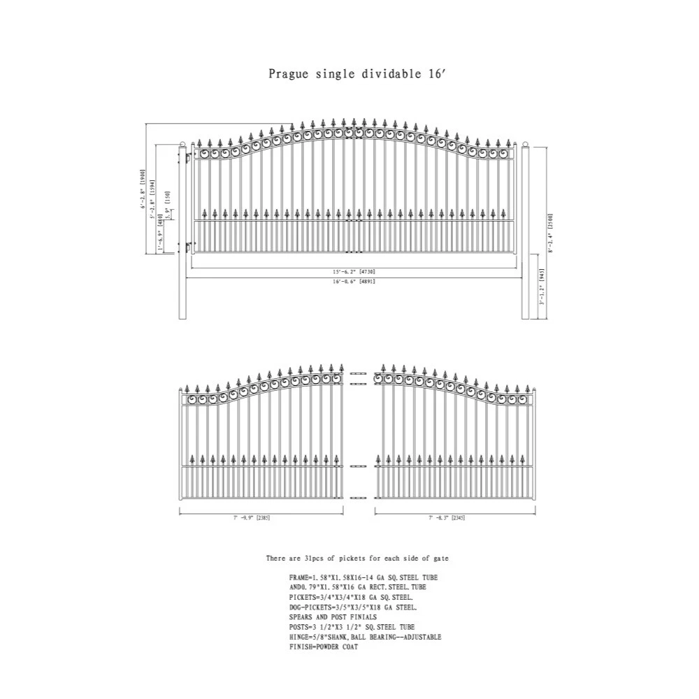 ______________________________________________________________________________________________________________________________________________________________________________________________ Visit Our Store - ALEKO_PRODUCTS ALEKO Automated Yard Steel Sliding 16' Driveway Gate Prague Style with Opener Description: ALEKO Kit 16' x 6' Single Sliding Driveway Gate Prague Style with Chain Gate Opener, specially designed for the easiest installation. The gate is fully welded from hot-dipped galvanized steel, and the powder-coated finish helps prevent rust, chipping, and wearing. Galvanized Steel is a process that protects the steel from rust and corrosion. The powder coating actually increases the life of galvanized steel. Unlike conventional paints, powder coated paints will not peel, chip or crack. Make this driveway gate into an automatic gate by installing a Gate Opener that increases home security and enhances the aesthetics of your property ALEKO Gates - YouTube Video will open in a new window Gate Specification: ALEKO Sliding Driveway Gate Prague Style with Gate Opener Sliding Gate specially designed for DIY installation Maintenance free, no painting or staining, corrosion resistance Powder-coated finish helps prevent rust, cracking, peeling, and chipping Durable and strong all welded construction Material: Galvanized steel gate with a powder paint coating 10-year Gate warranty and 1-year Gate Opener warranty Post Dimensions: 8' L x 3.5" W x 3.5" H Dimensions: 16 ft x 6 ft No welding required Color: Black Included: 2 Gate panels, 3 Gate Posts, Side Frame Extension Bracket, 2 Side Rollers 12-inch each, 2 V-Groove Gate Wheels (4-inch each), 6 V-Tracks (6 feet each), Electric Operator, Wireless Keypad, Set of Photocell, Wired Push Button, Chain 20 feet, Mounting Metal Base, 2 Remotes, Mounting Hardware, Manual Operator Features: Power supply AC 120V 60Hz/ 3/4 HP equivalent/ Auto-Close Feature Gate moving speed - 32 ft/min, Output torque = 14Nm, Noise <56 dB Motor speed 1680 rpm/ Operating Time: 0 - 44 seconds Remote control distance = 30 m Environmental temp -68°F ~ +122°F Output shaft 58.5 mm/ Output power of motor 750W Pedestrian mode/ Single Phase Motor Manual key release design for emergency purposes Different Models and Sizes Visit Our Store- ALEKO_PRODUCTS Terms of Sale We accept Pay pal and credit card payments. Payment should be completed within 4 (Four) days of auction closing. Or unpaid dispute will be filed for closing auction. Sales Tax of 9.5% will be applied for orders shipped within the state of Washington. We will leave a positive feedback immediately after payment is received. We appreciate a positive feedback as much as you do. If for some reason there is any issue with the purchase, please contact us prior to leaving feedback, and we will be glad to work with you to have it resolved. Shipping LTL Shipping - Less Than Truckload Freight Shipping Services For large and oversized products, we use LTL shipping. After your product ships from our warehouse, you will receive an email containing tracking information and details about the freight carrier assigned to your order. Shortly following the shipment, you will be contacted by the carrier to set up a delivery date. CUSTOMERS MUST BE PRESENT FOR THE DELIVERY OR FEES FROM THE FREIGHT COMPANY WILL INCUR. Transit times vary depending on your delivery area. Curbside Delivery only We provide free shipping to US continental only. Please note that we do not ship to US Protectorate, APO/FPO, PO Box by Fedex, they have to choose USPS. There is no free shipping for US Protectorate, APO/FPO, PO Box. We do our best to process your order as soon as possible. All products and all orders from our web site are shipped from our Seattle WA warehouse within 1-2 business days by FedEx, UPS, US Postal Service carriers. Buyer is responsible for all charges and payments of all customs clearance fees, duties and taxes, if any. Our products include: Driveway Gates, Iron Fence, Pedestrian gates, Sliding Gate Openers, Swing Gate Openers, Solar Gate Openers, Solar Panel Electric Locks, gate Parts and Accessories. Location: We are located in the state of Washington. We process 80% of our sales online. Local pick-up is welcome. Please note that freight shipment processing time is longer and for some cases can take up to 5 business days.
