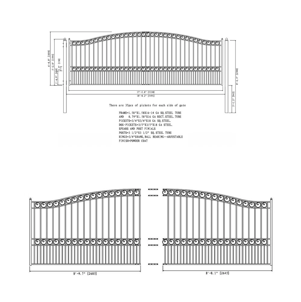 ALEKO Automated Yard Steel Sliding 18' Driveway Gate Paris Style with Opener Gate Specification: ALEKO Sliding Driveway Gate Paris Style with Gate Opener Sliding Gate specially designed for DIY installation Maintenance free, no painting or staining, corrosion resistance Powder-coated finish helps prevent rust, cracking, peeling, and chipping Durable and strong all welded construction Material: Galvanized steel gate with a powder paint coating 10-year Gate warranty and 1-year Gate Opener warranty Post Dimensions: 8' L x 3.5" W x 3.5" H Dimensions: 18 ft x 6 ft No welding required Color: Black Included: 2 Gate panels, 3 Gate Posts, Side Frame Extension Bracket, 2 Side Rollers 12-inch each, 2 V-Groove Gate Wheels (4-inch each), 6 V-Tracks (6 feet each), Electric Operator, Wireless Keypad, Set of Photocell, Wired Push Button, Chain 20 feet, Mounting Metal Base, 2 Remotes, Mounting Hardware, Manual Operator Features: Power supply AC 120V 60Hz/ 3/4 HP equivalent/ Auto-Close Feature Gate moving speed - 32 ft/min, Output torque = 14Nm, Noise <56 dB Motor speed 1680 rpm/ Operating Time: 0 - 44 seconds Remote control distance = 30 m Environmental temp -68°F ~ +122°F Output shaft 58.5 mm/ Output power of motor 750W Pedestrian mode/ Single Phase Motor Manual key release design for emergency purposes Description: ALEKO Kit 18' x 6' Single Sliding Driveway Gate Paris Style with Chain Gate Opener, specially designed for the easiest installation. The gate is fully welded from hot-dipped galvanized steel, and the powder-coated finish helps prevent rust, chipping, and wearing. Galvanized Steel is a process that protects the steel from rust and corrosion. The powder coating actually increases the life of galvanized steel. Unlike conventional paints, powder coated paints will not peel, chip or crack. Make this driveway gate into an automatic gate by installing a Gate Opener that increases home security and enhances the aesthetics of your property Terms of Sale In order to get a refund item should be returned back to us within 30 days from the date it been received. We do accept returns, customer pays return shipping. Unit has 1 year replacement warranty. In order to get a replacement you should request return authorization form and ship the item you want to replace back to us, include form with the return. Please request form by email. Please note that all returns without the form will not be processed and will be refused. Shipping LTL Shipping - Less Than Truckload Freight Shipping Services For large and oversized products, we use LTL shipping. After your product ships from our warehouse, you will receive an email containing tracking information and details about the freight carrier assigned to your order. Shortly following the shipment, you will be contacted by the carrier to set up a delivery date. CUSTOMERS MUST BE PRESENT FOR THE DELIVERY OR FEES FROM THE FREIGHT COMPANY WILL INCUR. Transit times vary depending on your delivery area. Curbside Delivery only We do our best to process your order as soon as possible. We process 80% of our sales online. We ship our products within 24-48 hours. Please note due to the Holiday time packages could be delayed! Please note that freight shipment processing time is longer and for some cases can take up to 5 business days. Buyer is responsible for all charges and payments of all customs clearance fees, duties and taxes, if any. We provide free shipping to US continental only. For US territory additional shipping will apply, please contact us for a shipping quote. Please note that we do not ship to US Protectorate, APO/FPO, PO Box by FedEx, they have to choose USPS. There is no free shipping for US Protectorate, APO/FPO, PO Box