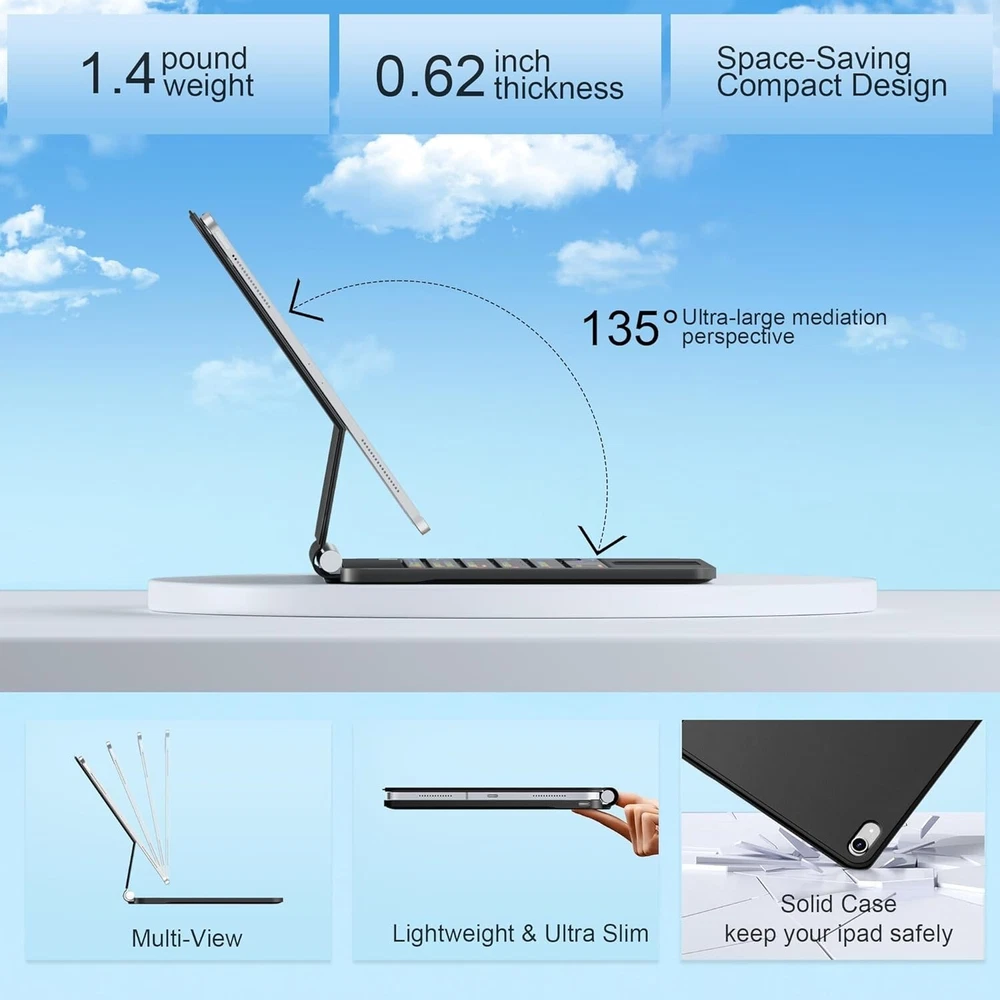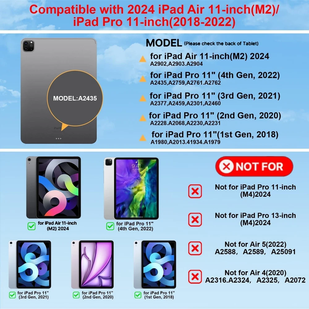 Transform your iPad into a powerful and portable workstation! This ALIWLHOF Keyboard Case is compatible with: iPad Air 11" (M2, 2024) iPad Pro 11" (4th, 3rd, 2nd, 1st Generation) Key Features: Detachable Backlit Keyboard: Comfortable typing in any lighting condition. Multi-Touch Trackpad: Seamless navigation with smooth and responsive gestures. Adjustable Stand: Find the perfect viewing angle for any task. Sturdy Protection: Shields your iPad from bumps and scratches. Precise Fit: Designed specifically for your compatible iPad models. Elevate your iPad experience and boost your productivity! All sales are final. Please refer to the manufacturer's warranty for any product issues. Please double-check compatibility before purchasing. Don't wait! Order your ALIWLHOF Keyboard Case today! #ali
