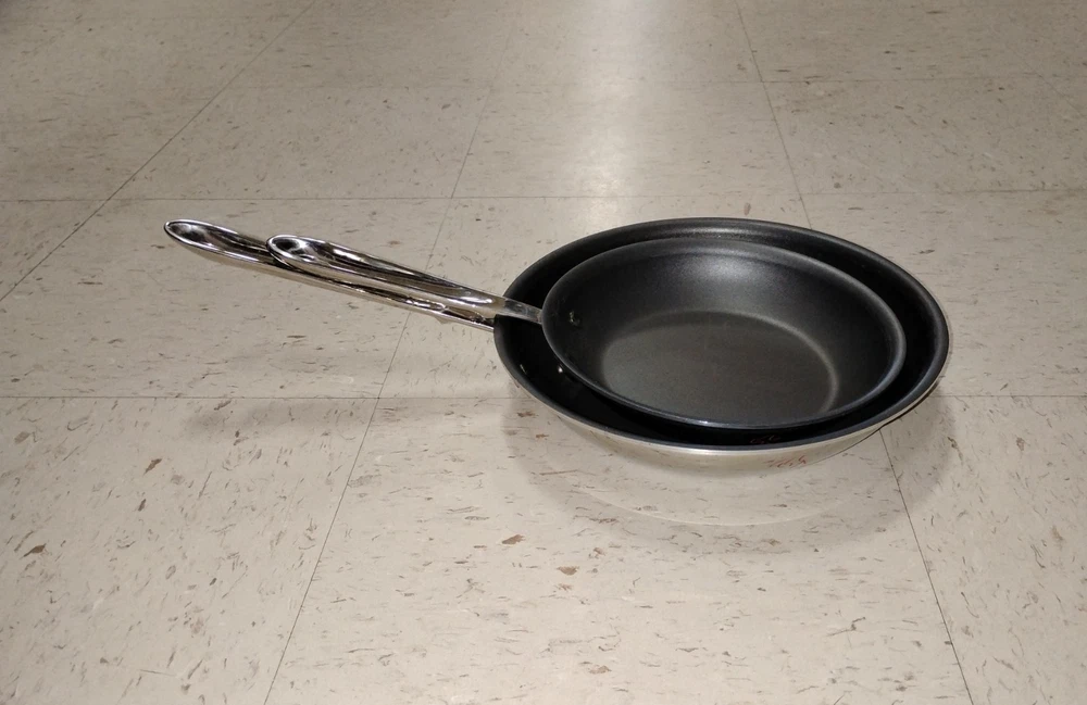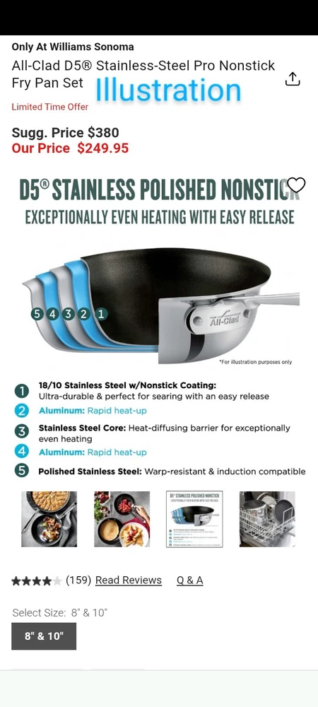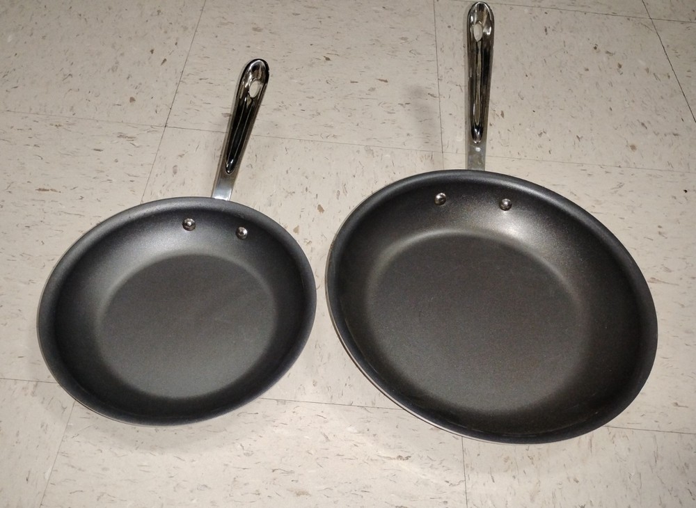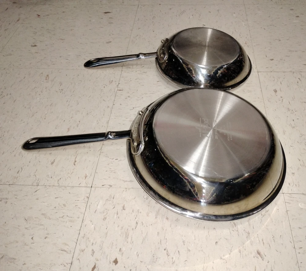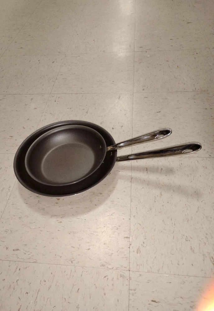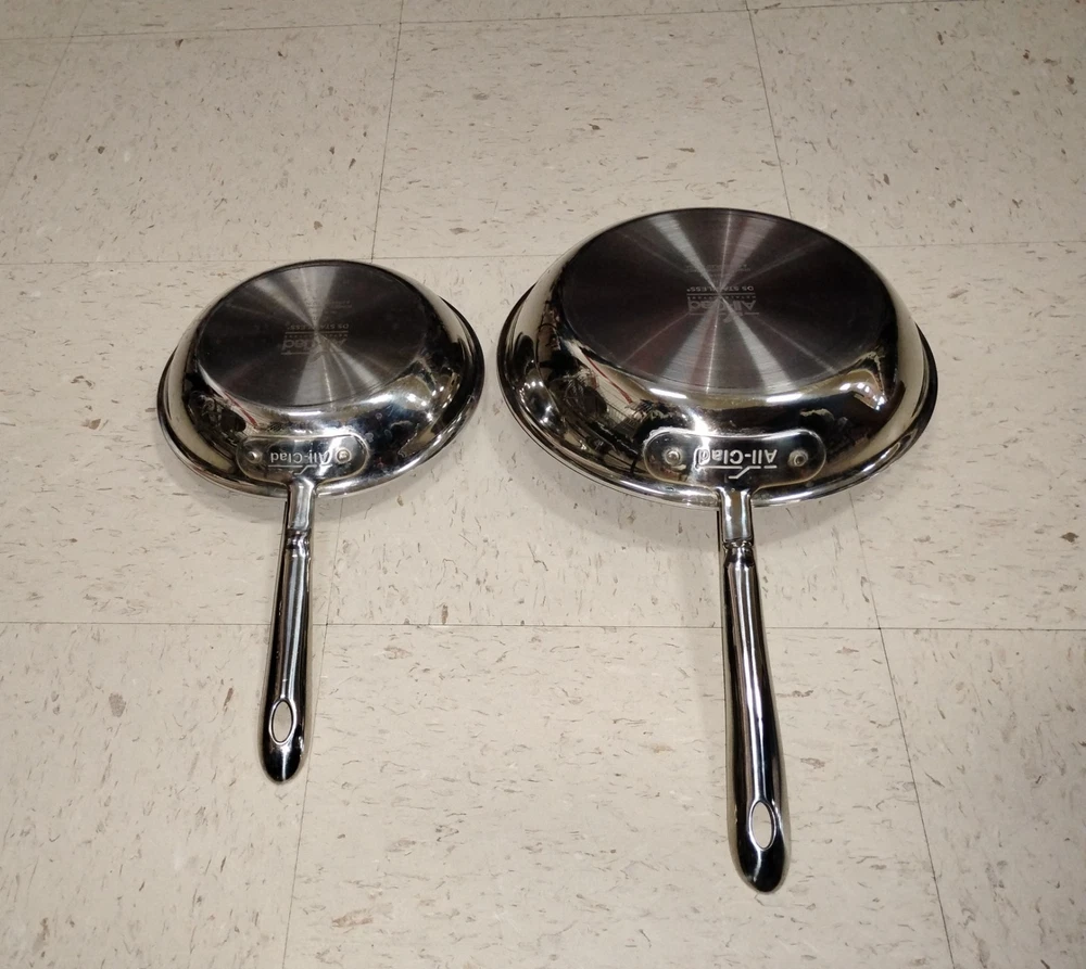 The ALL-CLAD D5 8" & 10" Fry Pans 2 Piece Set is a high-quality cookware set perfect for any kitchen. Made with durable stainless steel with a non-stick coating, these round pans are compatible with induction, electric, and gas stoves. The set includes two pans with diameters of 8" and 10", featuring a sleek silver outer color and a charcoal color interior. With a heat resistance of up to 500°F and a lifetime manufacturer warranty, this set is a reliable and long-lasting addition to your kitchen. It is the premium quality grade bonding with materials offered by All-Clad cookware. Made in the United States by the reputable brand All-Clad, this high-end pro set is a must-have for any home or professional cook. They would retail for around $350 new. They're in excellent pre-owned condition, used only a few times, no major wear, flaws or damage noted. Clean inside and outside. Zoom in. See pics and illustrations. Smoke free, pet free household. Thanks for looking.