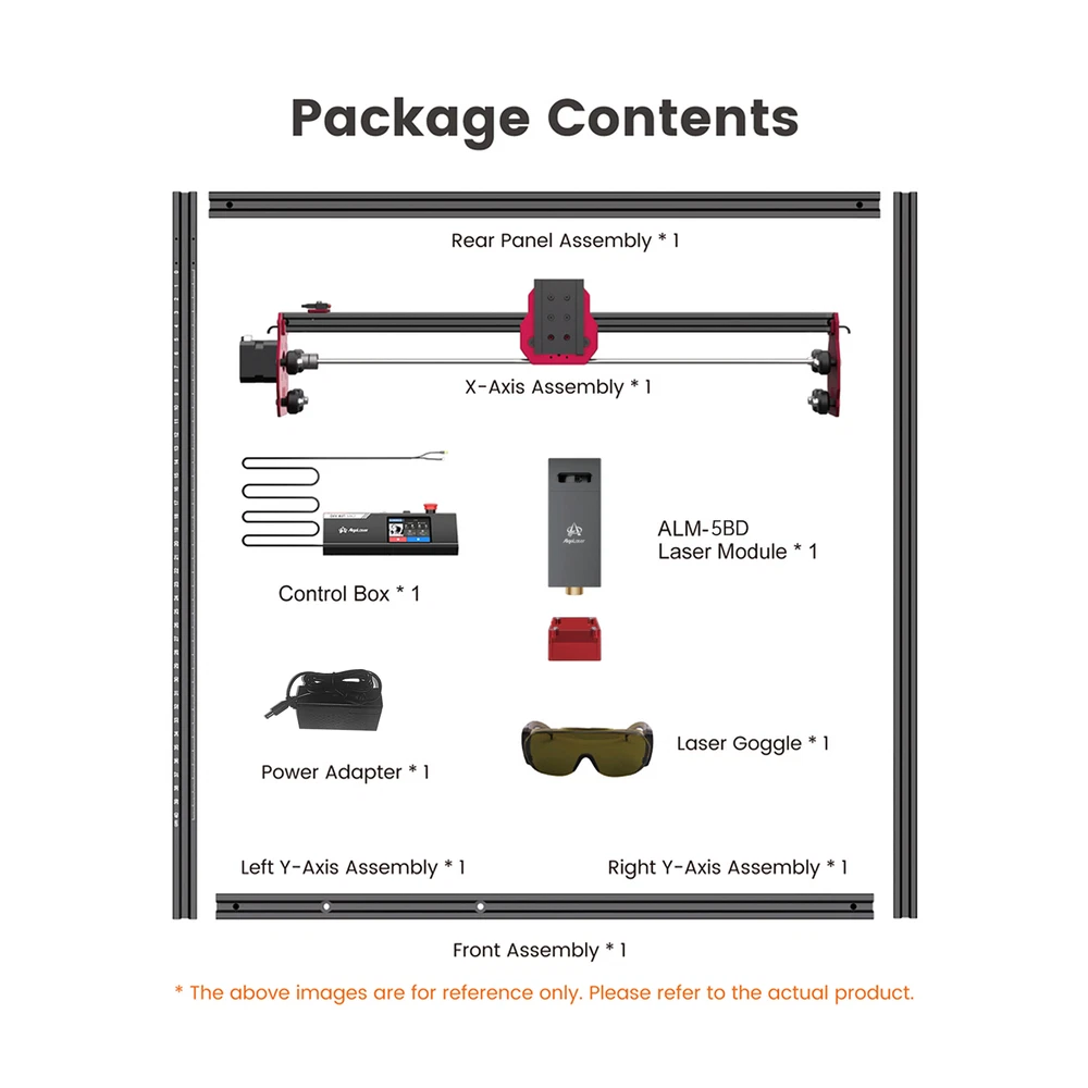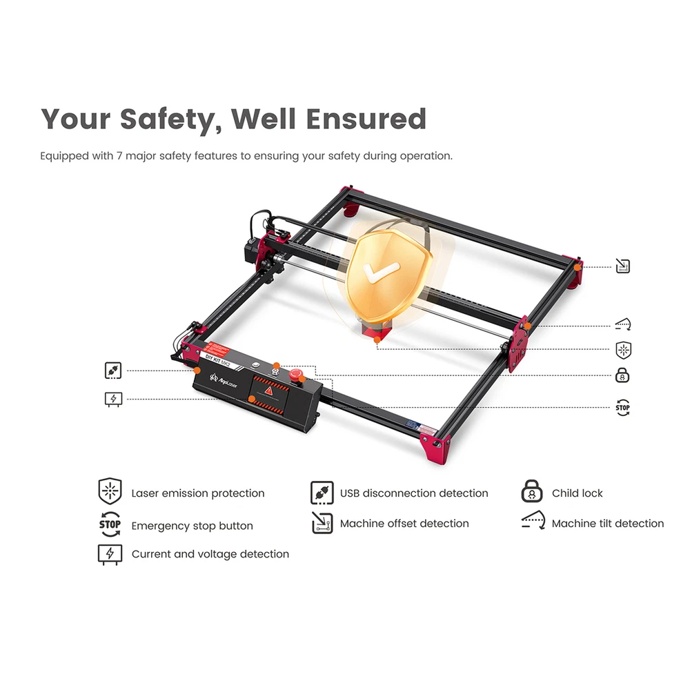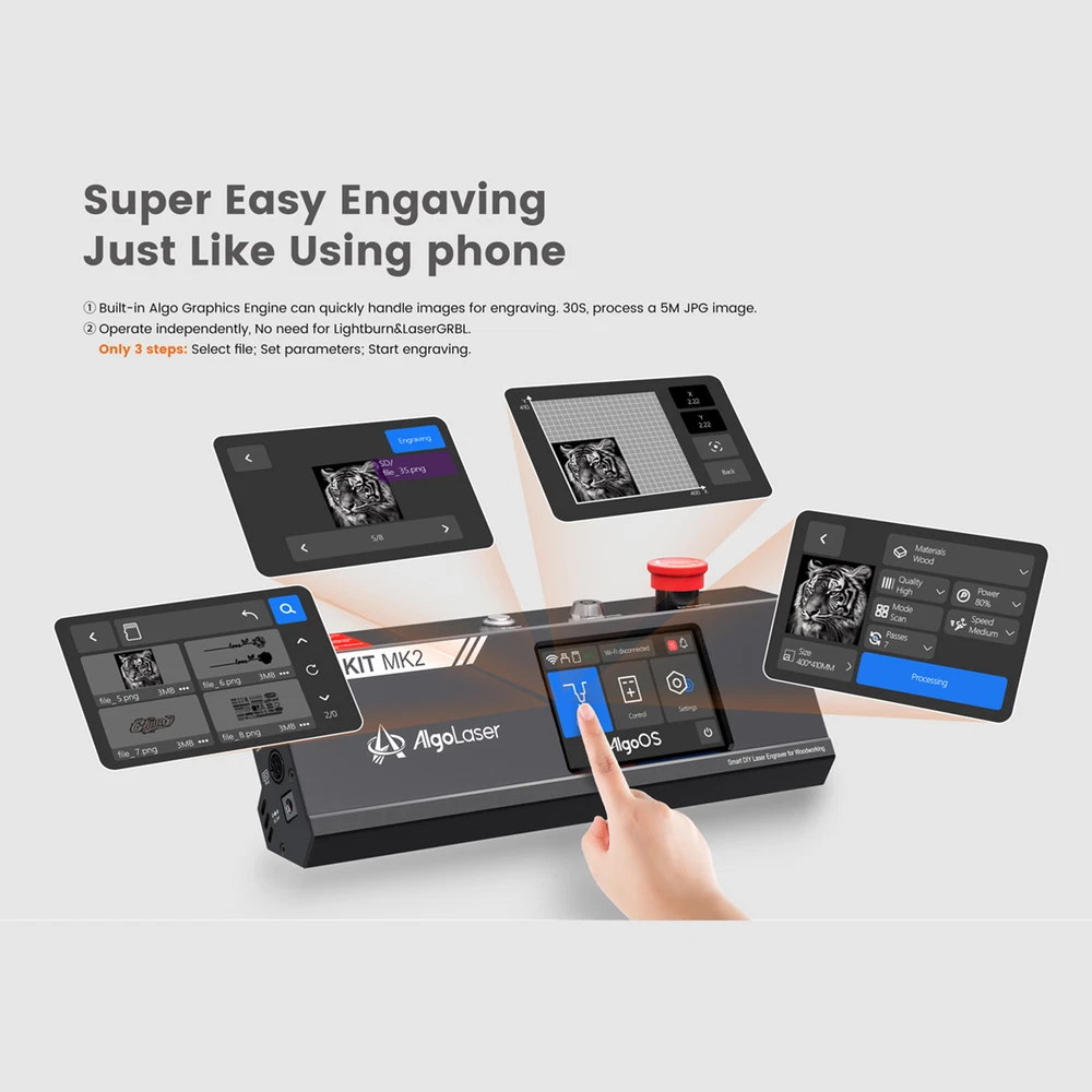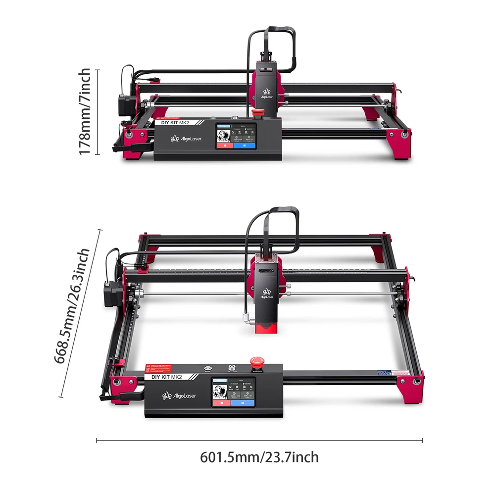 Features: π Ultrafine Laser Point & Powerful Laser Module & Faster Speed: Comes with the latest FAC laser technology for compressed laser point, 0.08*0.1mm Smaller laser spot and ultra-fine lines allow for impeccable details and cutting 4mm Birch Plywood, 5mm Basswood Plywood by one pass. Up to 12000 mm/min speed is and 400*435mm engraving area allows you to product more works at the same time. π Smart Integrated Control: The AlgoOS has built-in Algo Graphics Engine, A 5M JPG image could be processed within 30 seconds, from image to engraving within 1 minute, allowing ordinary users to be free from learning new software. DIY KIT MK2 is compatible with a wide range of Algo smart accessories such as Smart Hub, Heightening Feet, Dustproof Box, Camera or Purifier (purchase separately) for better carving performance. π 3.5'' Colorful Touch Screen: Embedded the screen in the AlgoLaser DIY KIT MK2 laser engraver, it has a friendly user interface and friendly experience. It cut multiple pieces of plywood or images to be engraved without tying up your computer to run it. And support save the Gcode file into TF card and engraving without computer connected. π Safety Protections: Equipped with multiple detections to protect users, which including Emergency Stop Button, Safety Lock, Main Board Overheat Protection, Over-voltage & under-voltage protection; And Laser Goggle and Laser Shield design for enhancing the safety of laser use. π Stable Structure Comes More Powerful Cutting Ability: Following the DIY KIT's design of single motor drive in X and Y directions and 20 profile structure, enabling users to assemble and customize independently. It enhances flexibility and personalization. This lightweight engraver is ideal for DIY enthusiasts and those seeking portability. The machine is well-assembled with 12 screws, no need for complicated belt tightening and other steps to reduce difficulty. π Wide Compatibility: DIY KIT MK2 laser engraver supports offline connection via WiFi-2.4 GHz and TF card (built-in 8G); Supports wired connection via USB Type-A & Type-C; Supports USB stick connection as well. For beginners, AlgoLaser App. LightBurn, and LaserGRBL software provide easy access to offline control and engraving. π Real-Time Detection & Smart Engraving: Adopt "Watchdog" which by monitoring the running status of the CPU and triggering a reset signal when an abnormality is detected, It effectively safeguards the program from getting stuck in an endless loop or running away uncontrollably and improve the stability and reliability of the system. And real-time Light Out Detection, check the status of laser beam, can find and solve problems in time to ensure the engraving quality and equipment stability. Specification: Model: DIY KIT MK2 Machine Size: 668.5*601.5*178mm Product color: black + red Frame material: aluminum alloy Drive mode: X-axis single motor drive, Y-axis single motor drive Engraving stroke: 400*435mm Maximum engraving speed: 12000mm/min Working light power (light source): β₯5000mW(5W) Laser wavelength: 455Β±5nm Focal length: 5mm from the hood Spot size: 0.05*0.1mm Lens material: glass Modulation mode: TTL TTL trigger mode: high-level efficiency (>DC2.0v) Working frequency: <30KHz Ambient temperature: 0β--35β Engraving material: acrylic, rubber board, density board, plywood, etc. Laser head life: >10000 hours Motherboard model: DIYKIT_MK2_V4.3 Touch screen: 3.5-inch IPS screen, capacitive touch TF card: support (built-in 8G) USB port: support (USB Type-A & Type-C) Input: 100-240~, 50/60Hz OUTPUT: 24V4A (6A MAX) Power consumption: 96W Power input: DC 24V/4A Standby power consumption: <2W Supported formats: jpg, svg, png, bmp, G code, dwg, etc. Supported systems: Mobile phones: Android & iOS, computers: Windows & Mac OS Packing List: 1 x DIY KIT MK2 Laser Engraver Kit