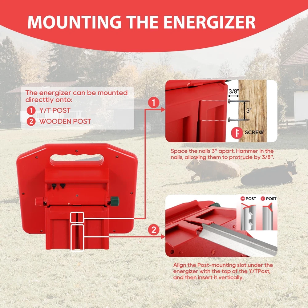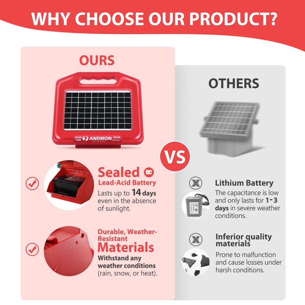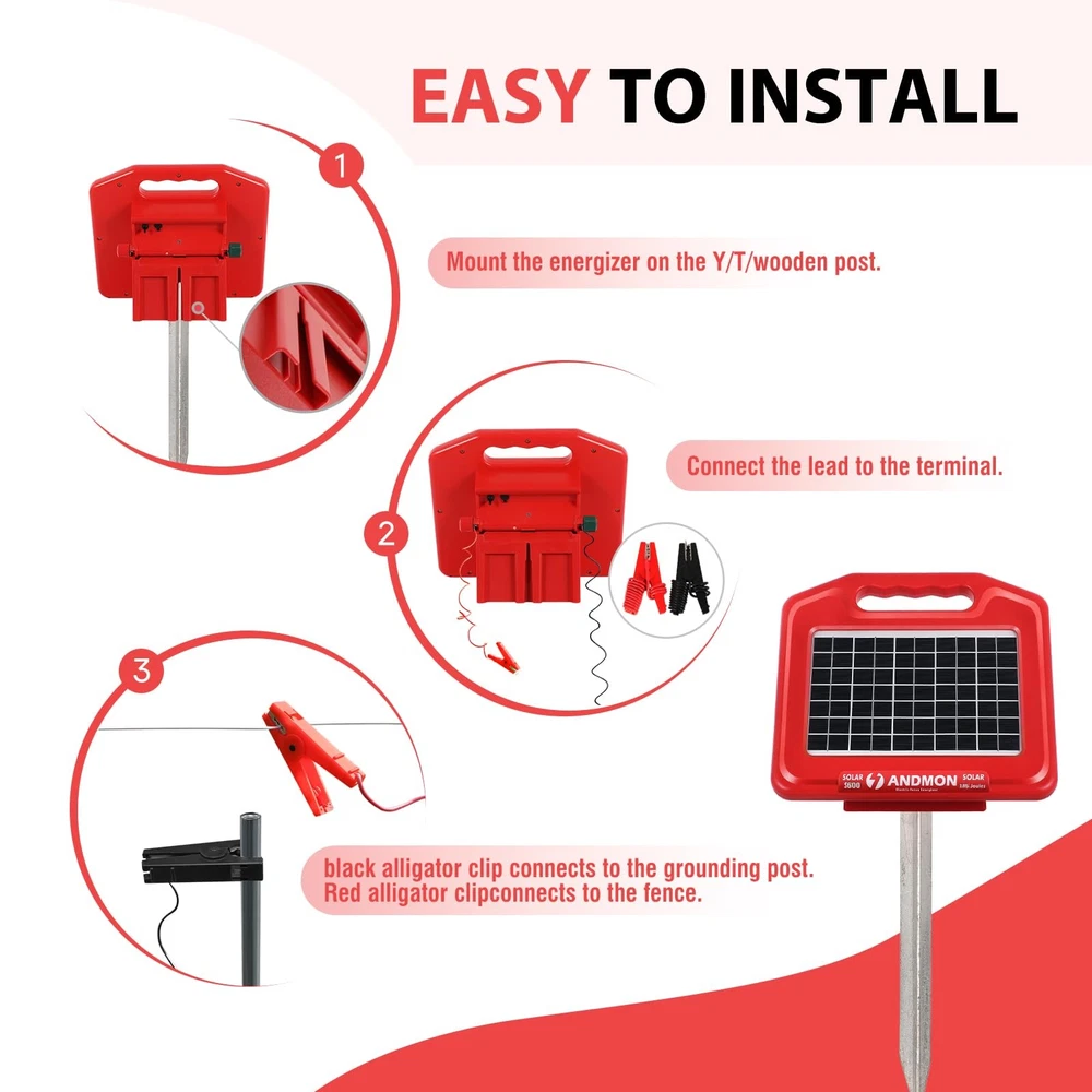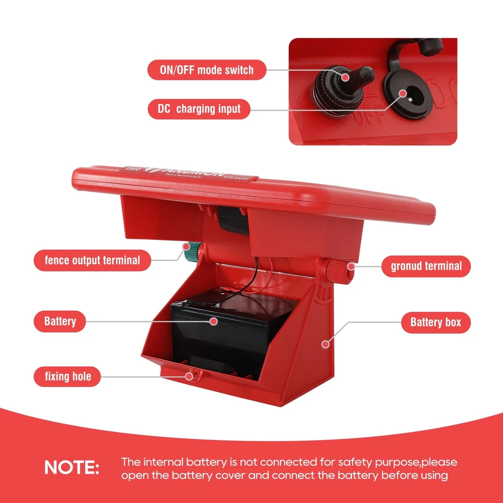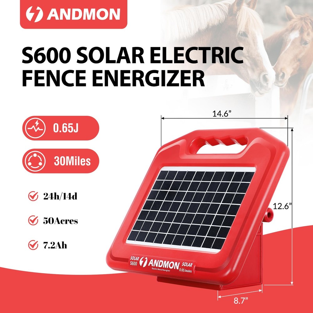 S600 Solar Fence Charger The S600 Solar Electric Fence is a powerful and efficient solution for electric fencing needs, designed for medium to large-scale applications. It delivers a potent 0.53-joule output, making it effective for containing or deterring various animals, including livestock and predators, across up to 35 miles of fence line. This energizer is equipped with a high-quality solar panel that ensures continuous operation, even in remote areas without a reliable power source. It also features dual power options, allowing it to be charged via solar energy or a DC adapter. In cases where sunlight is limited, the S600 can operate for up to 14 days on a fully charged battery, providing peace of mind for consistent fencing protection. Ideal for use in pastures, farms, and rural properties, the S600 Solar Fence Energizer is built with durability in mind, with weather-resistant construction that withstands harsh outdoor conditions. Its easy installation process and reliable performance make it a top choice for maintaining secure and efficient electric fencing systems. S600 PLUS Solar Fence Charger gives you: ♥ 8 Watt Solar Panel for quick charging ♥ 12AH High-Capacity Storage for 21 days of control and protection ♥Powers up to a 30 miles perimeter, livestock owners no longer worry about remote grazing. ♥Quick and easy to install ♥Easy-access terminals ♥LED indicator show the energizer is functioning properly ♥Rugged weatherproof outer casing ♥Reliable livestock control and predator exclusion ♥Suitable for use with electric straps, ropes and wire S600 PLUS Solar Powered Fence Charger Set Includes: 1 × Rugged Solar Energizer 1 × 12V7.5AH Sealed lead acid battery 1 × Line Connection Cable with alligator clip 1 × Earth Connection Cable with alligator clip 1 × Charger 1 × Simple User Manual POWERFUL OUTPUT: Delivers 0.53 joules of solar fence charger, effectively powering up to 35 miles of the solar fence charger. Ideal for protecting livestock such as cattle, horses, and sheep, as well as safeguarding gardens and small farm plots from unwanted intruders. SOLAR-POWERED AND DC CHARGING: Equipped with a high-quality solar panel and a DC charging option, providing sustainable and eco-friendly energy. The built-in 12V/7.2AH battery allows the charger to operate for up to 14 days without sunlight. VERSATILE INSTALLATION: The S600 electric fence can be easily installed on various types of posts including Y-posts, T-posts, and wooden posts, offering flexibility to suit different fencing setups. WEATHER RESISTANT: Designed to withstand harsh weather conditions. The durable casing is waterproof and UV-resistant, ensuring long-lasting performance in any environment. NOTE: The internal battery is not connected for safety purpose, please open the battery cover and connect the battery before using (Red cable connects to the red positive(+) battery terminal, black cable connects to the black negative(-) battery terminal)