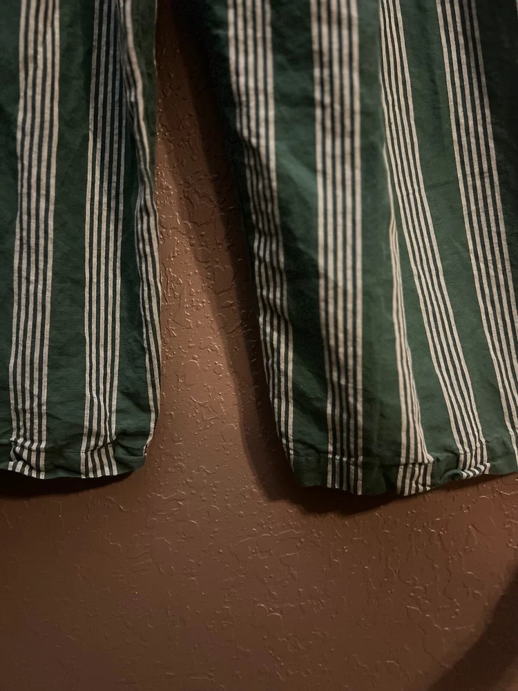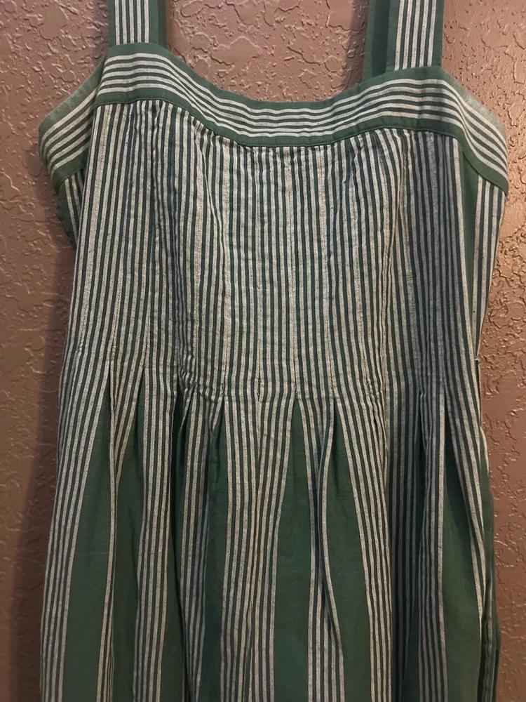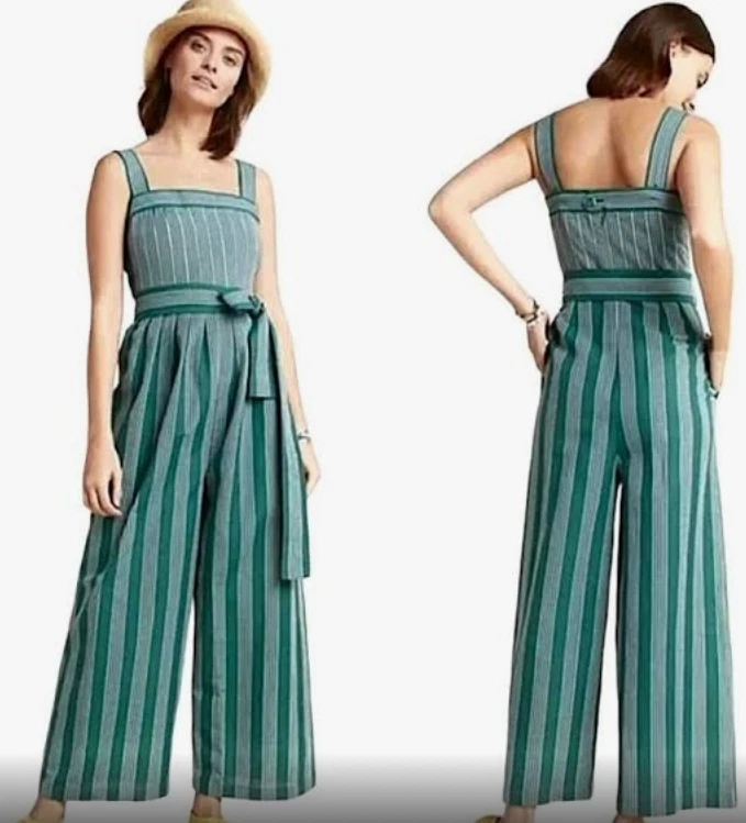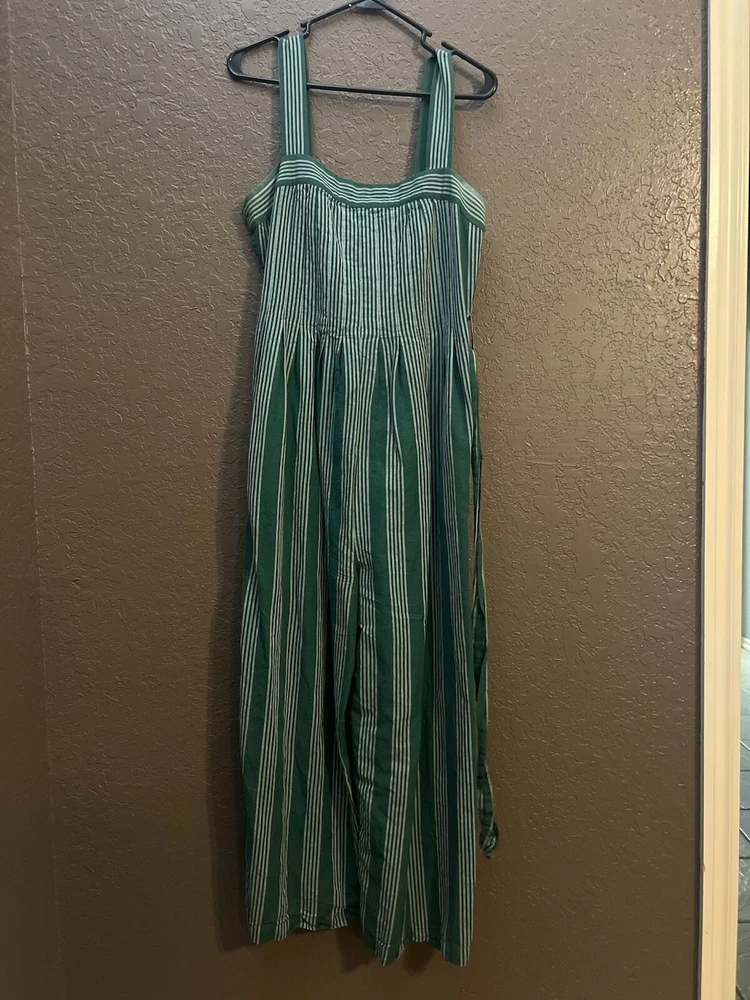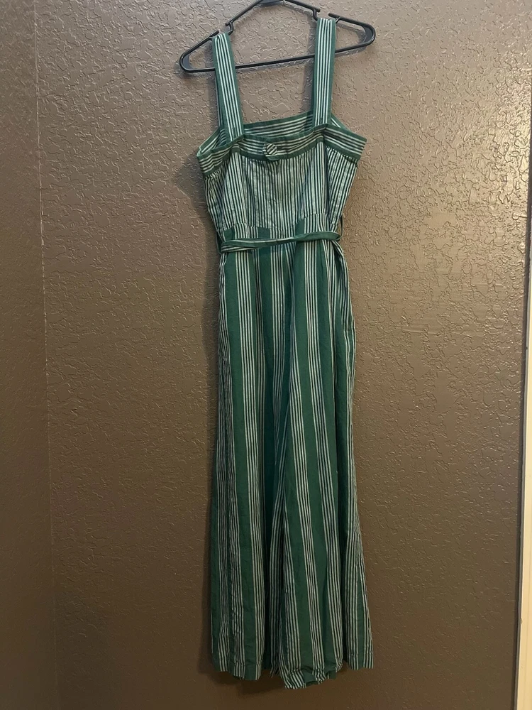 This Anthropologie Payal Pratap Cha Cha jumpsuit is a must-have for any fashion-forward woman. The green striped linen fabric is both breathable and comfortable, making it perfect for summer, fall, and spring. The jumpsuit features a square neckline, adjustable straps, and a zippered closure for easy wear. With its relaxed fit and wide-leg style, this jumpsuit is perfect for any occasion, whether it be casual, party/cocktail, or travel. It also includes several handy features such as pockets and a belt. The jumpsuit is a size 8 and comes in the color green.