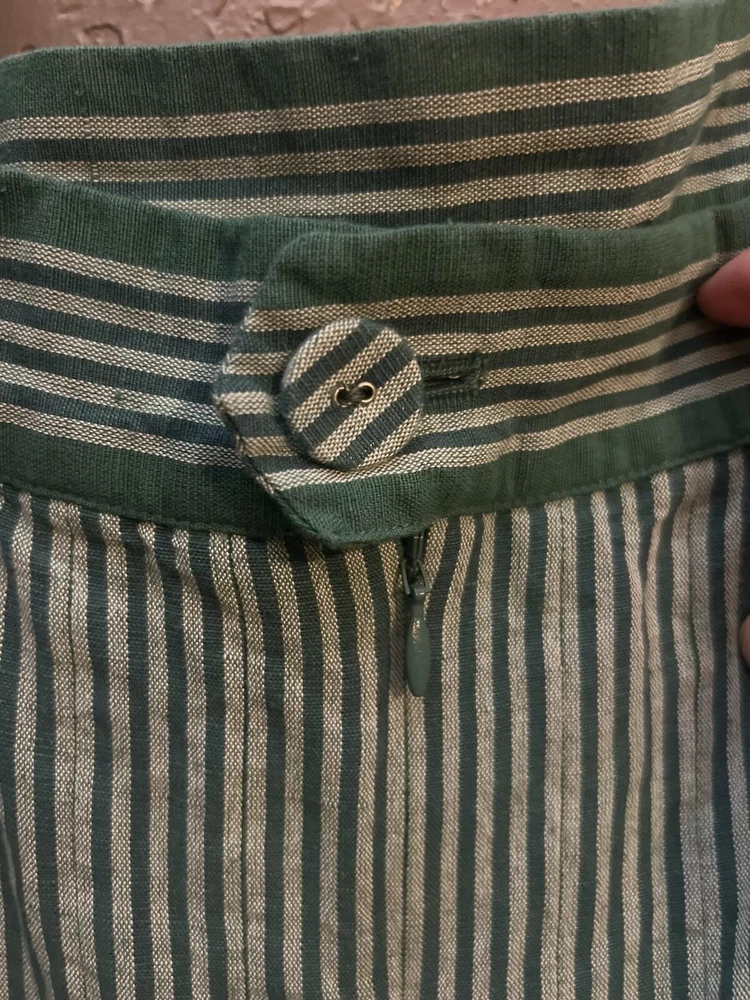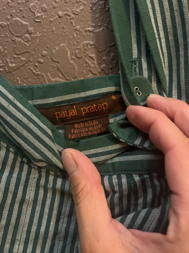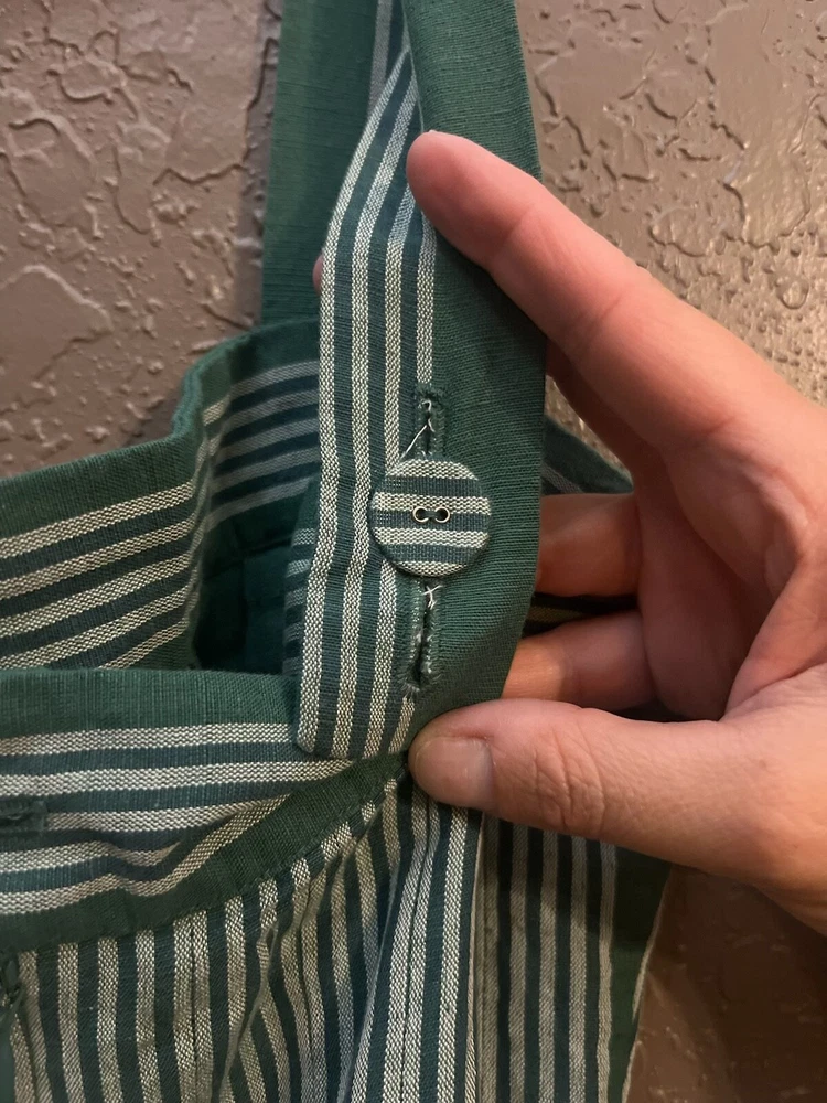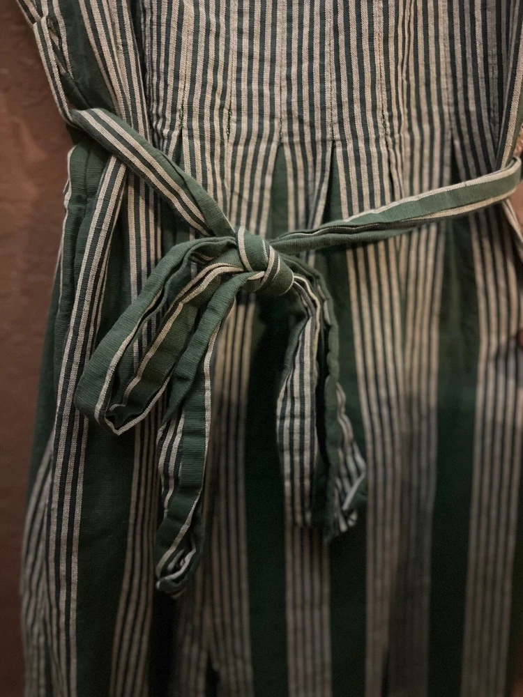 This Anthropologie Payal Pratap Cha Cha jumpsuit is a must-have for any fashion-forward woman. The green striped linen fabric is both breathable and comfortable, making it perfect for summer, fall, and spring. The jumpsuit features a square neckline, adjustable straps, and a zippered closure for easy wear. With its relaxed fit and wide-leg style, this jumpsuit is perfect for any occasion, whether it be casual, party/cocktail, or travel. It also includes several handy features such as pockets and a belt. The jumpsuit is a size 8 and comes in the color green.