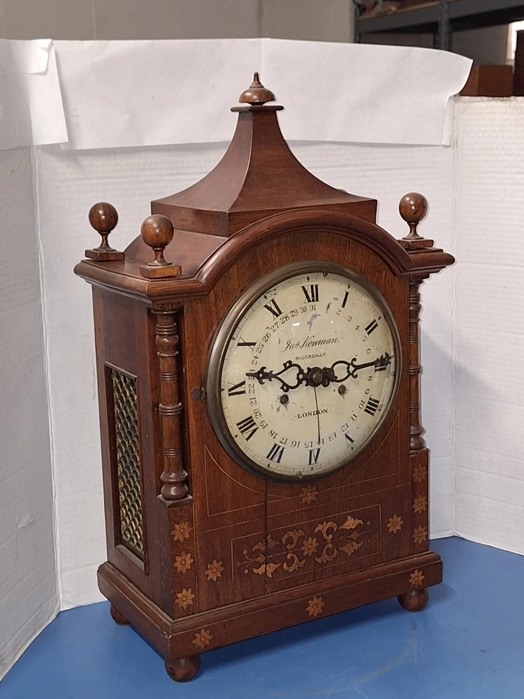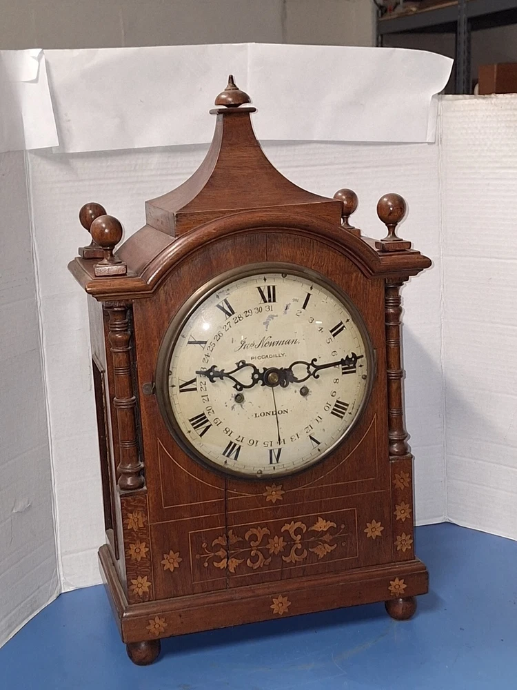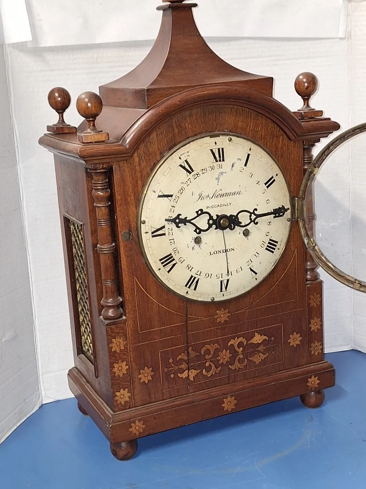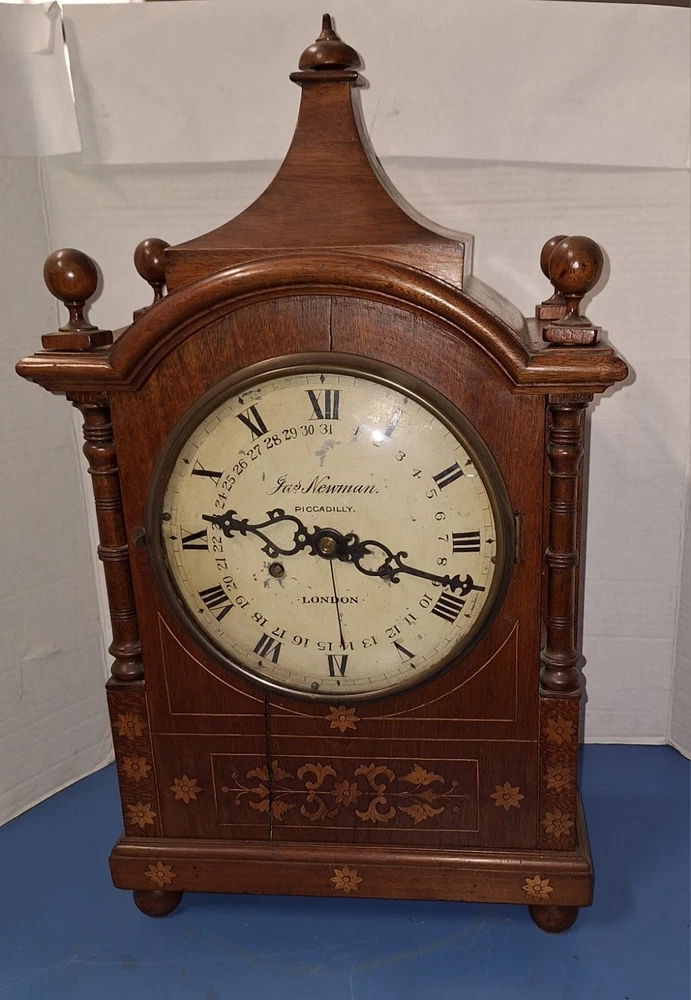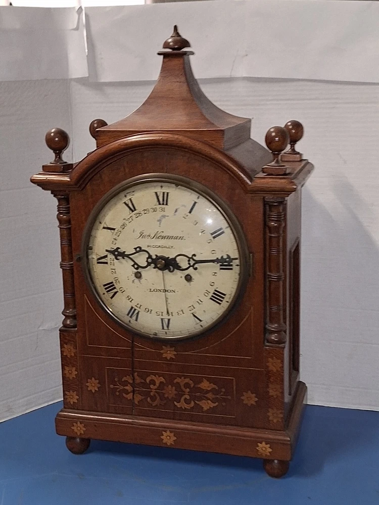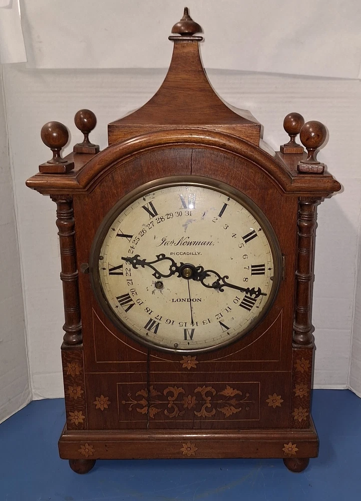 ANTIQUE FUSEE CALENDAR CHIME CLOCK BY JAMES NEWMAN, PICCADILLY, LONDON, ENGLAND WORKING THIS IS A VERY NICE ANTIQUE BRACKET CLOCK, IN WORKING CONDITION. TRADITIONAL CHAIN FUSEE MECHANICAL MOVEMENT. THIS COMES WITH ADJUSTABLE PENDULUM AND WINDING KEY. THIS LARGE CLOCK MEASURES 23 INCHES HIGH, 12 1/2 WIDE, AND 7 DEEP. WORKING CONDITION. CHECK ALL PICTURES!
