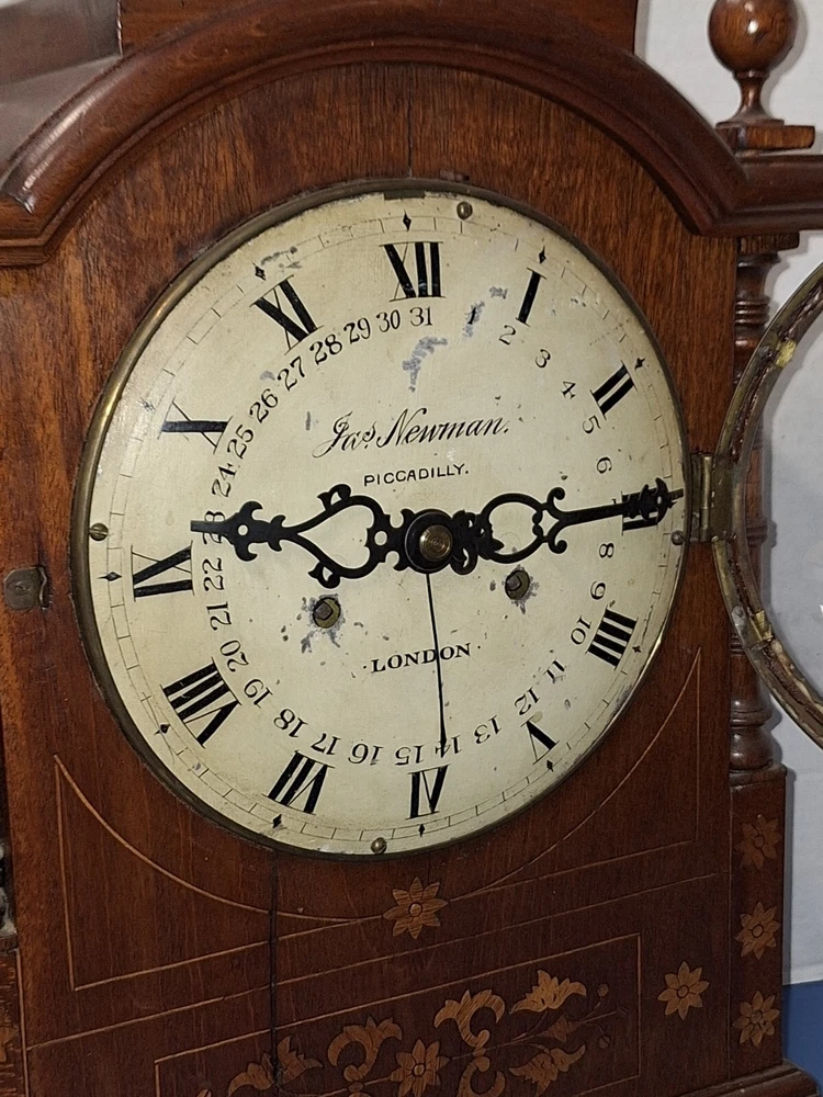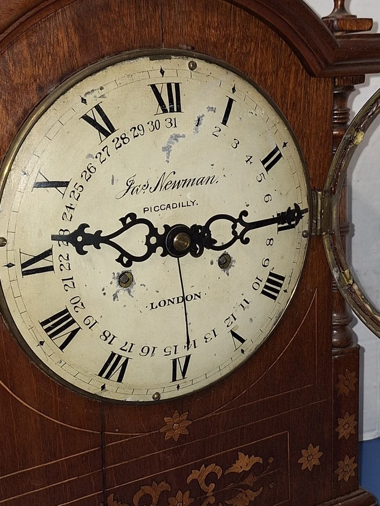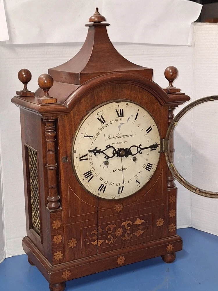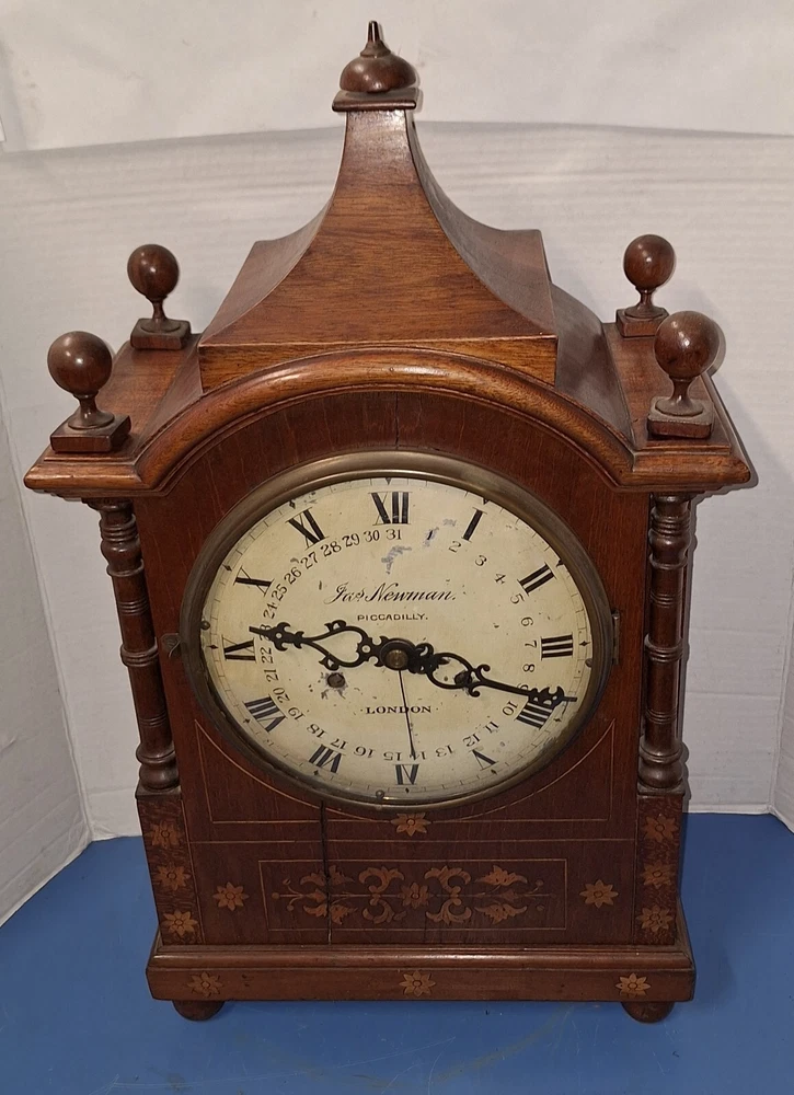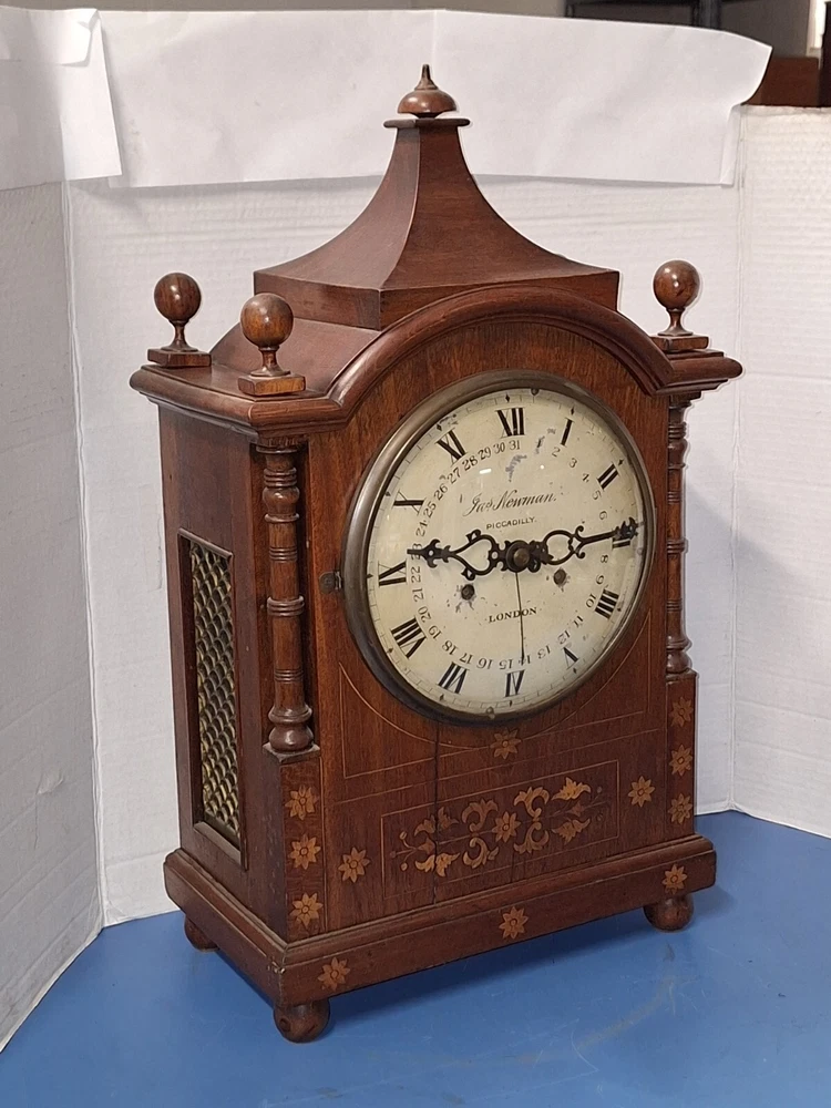 ANTIQUE FUSEE CALENDAR CHIME CLOCK BY JAMES NEWMAN, PICCADILLY, LONDON, ENGLAND WORKING THIS IS A VERY NICE ANTIQUE BRACKET CLOCK, IN WORKING CONDITION. TRADITIONAL CHAIN FUSEE MECHANICAL MOVEMENT. THIS COMES WITH ADJUSTABLE PENDULUM AND WINDING KEY. THIS LARGE CLOCK MEASURES 23 INCHES HIGH, 12 1/2 WIDE, AND 7 DEEP. WORKING CONDITION. CHECK ALL PICTURES!