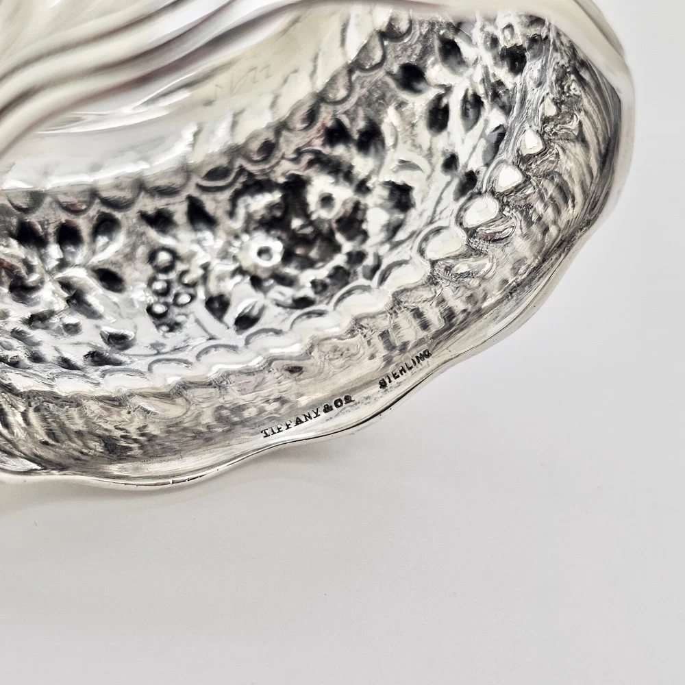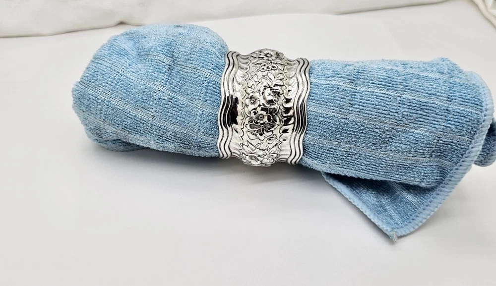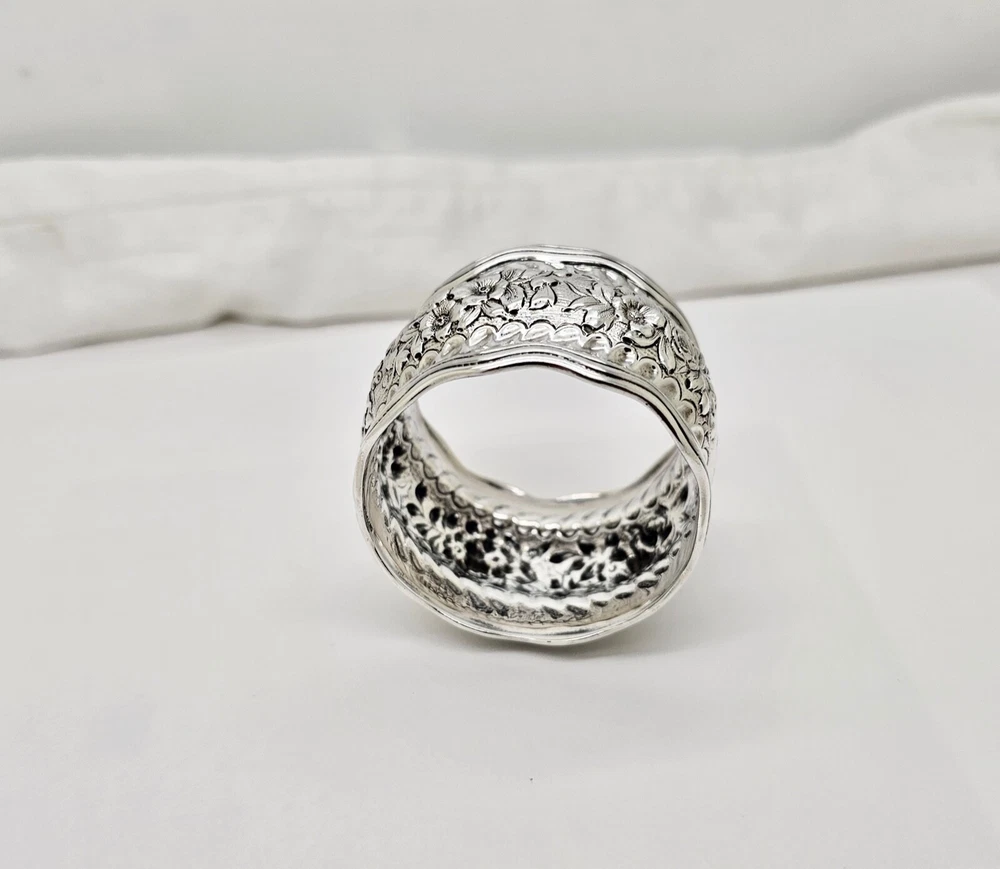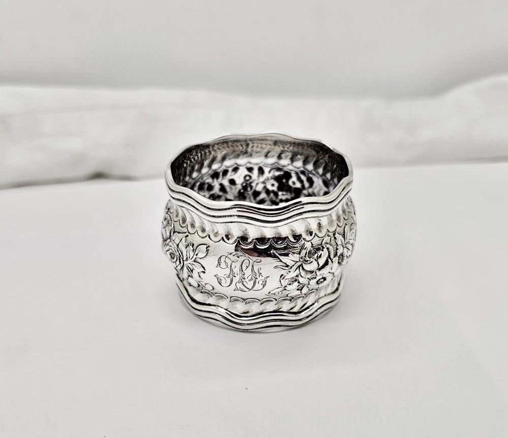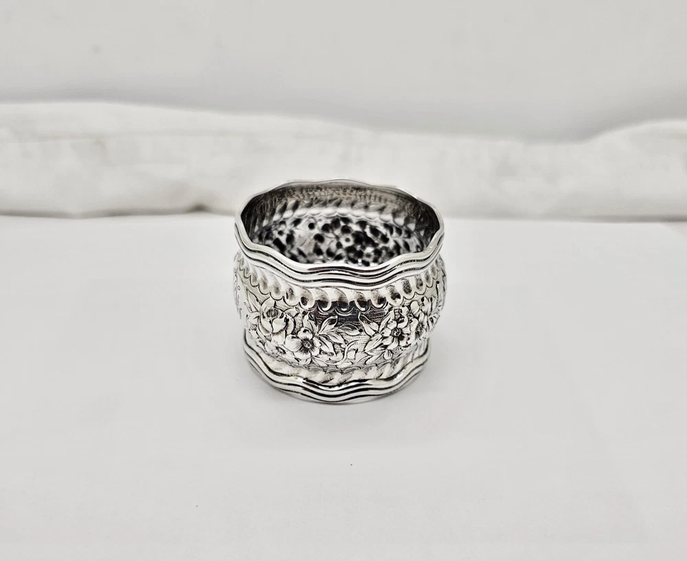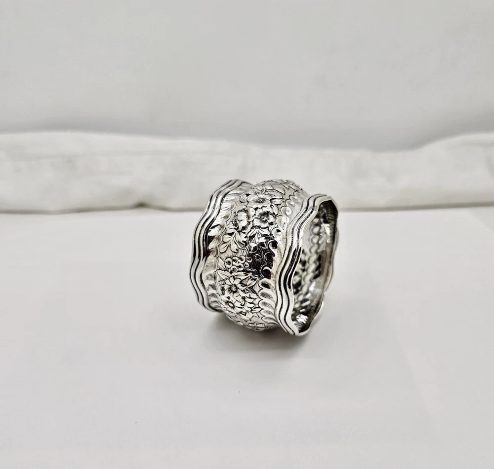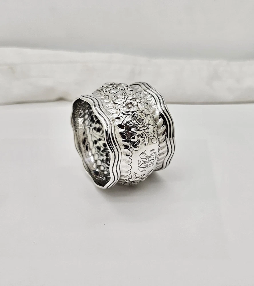 Antique Tiffany & Co. Daisy pattern wide, heavy, wavy edge sterling silver napkin ring. Measures 1 1/2" wide x 2" diameter across the open ends and weighs 44.6 grams. Excellent condition with no dings or dents and only modest, if any, wear. All raised pattern work remains crisp and well defined. One side of the ring shows a small, heavily scripted FCS(?) monogram. Stamped Tiffany & Co. sterling on inside edge. Please enlarge all pics for best details.