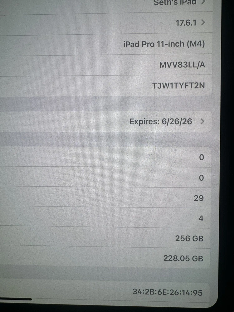 Storage Capacity:256 GBgtin13:Does not applyUPC:Does not applyType:TabletFeatures:BluetoothBrand:AppleColor:Not SpecifiedInternet Connectivity:Wi-FiOperating System:iOSScreen Size:11 inModel:MVV83LL/ASeries:iPad Pro