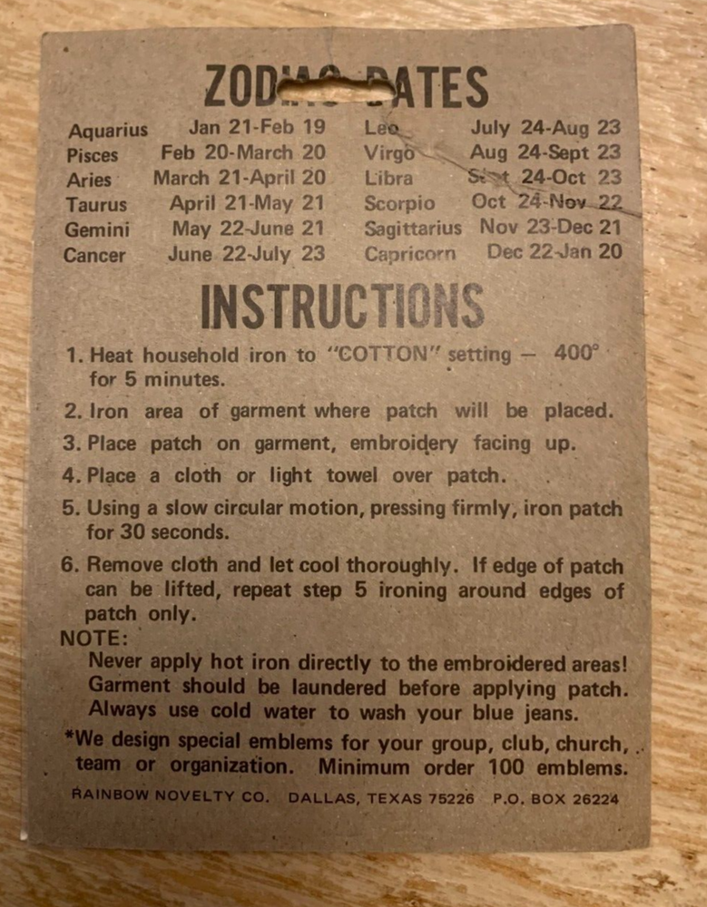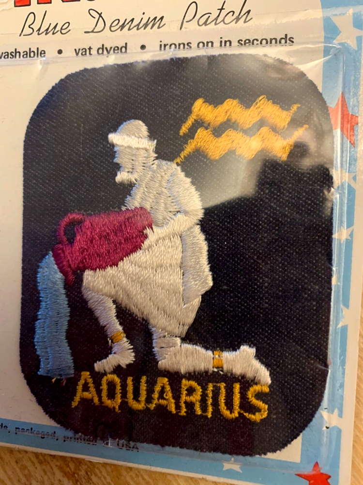 Groovy vintage find! Unopened iron-on patch of Aquarius, The Water Bearer. Made by Rainbow Novelty, Dallas TX. Patch is rectangular with rounded corners. White, gold, purple, light blue on navy denim. Size approx. 3" w x 3 3/4" Fast shipping, quality packed, trackable. Thanks for your consideration.