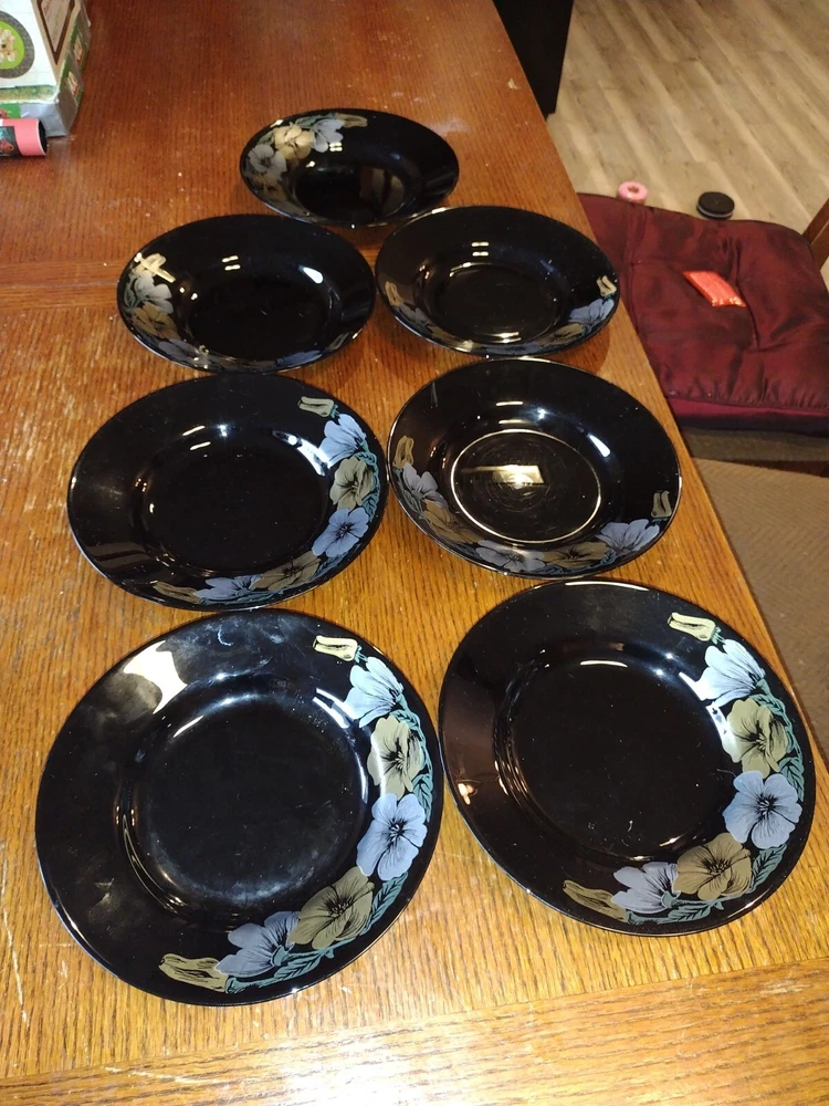 These are vintage ARCOROC Salad Plates from France, featuring a black color with a floral pattern. Made of glass, the set includes salad plates with a printed backstamp. Set of 7