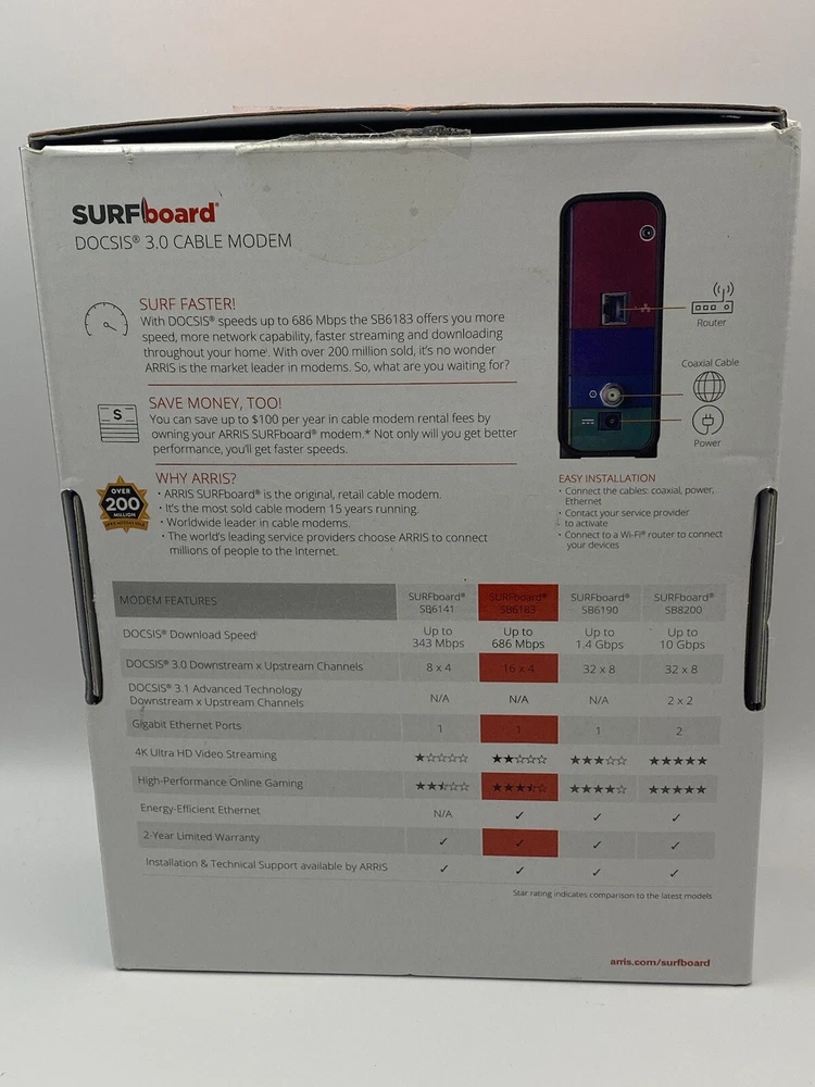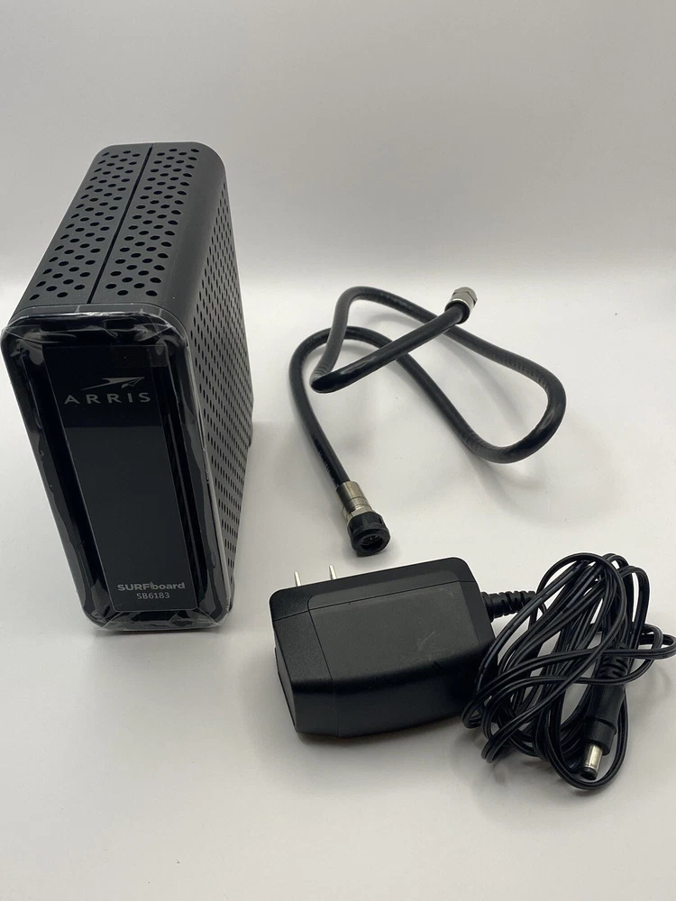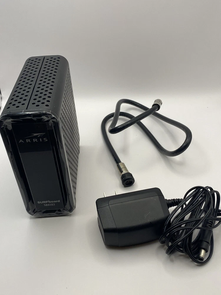 Upgrade your internet with the ARRIS SURFboard DOCSIS 3.0 Cable Modem! This sleek black modem boasts a maximum downstream data rate of 686 Mbps and a maximum LAN data rate of 1000 Mbps, making it perfect for high-speed cable internet. With one LAN port and Ethernet (RJ-45) connectivity, this modem is easy to set up and use. The SB6183 model from ARRIS is a cable modem and router in one, making it a great all-in-one solution for your home networking needs. It is compatible with Spectrum and other major carriers, and its DOCSIS 3.0 standard ensures fast and reliable internet speeds. Order now and enjoy lightning-fast internet speeds without worrying about the condition of the device!