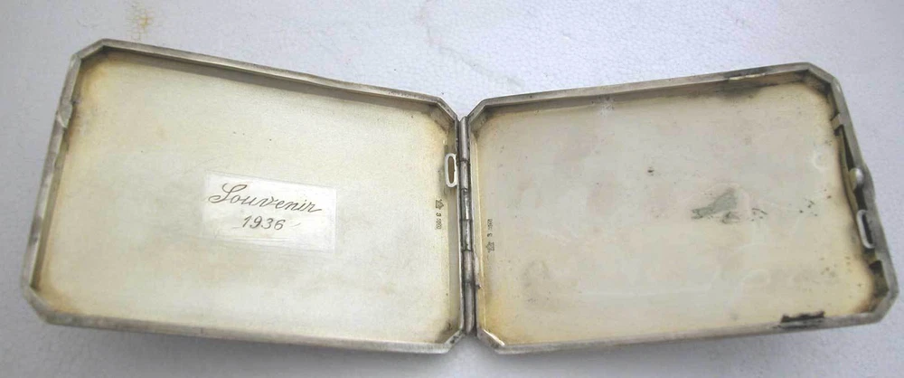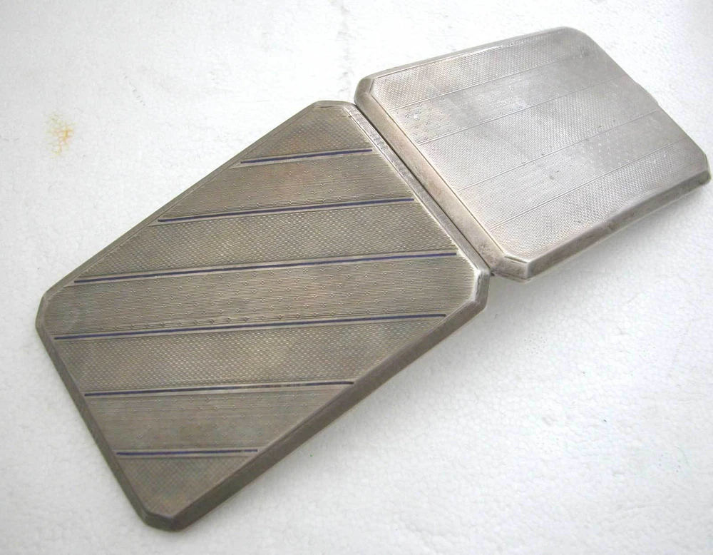 HERE OFFERED FOR SALE THIS FINE ART DECO RECTANGULAR SOLID SILVER CIGARETTE CASE. CASE WITH GEOMETRICAL PATTERN. IN FRONT AND BLUE ENAMEL LINES . IT IS 11 CM (4.4") LONG ,7.7 CM (3.1") WIDE AND 1 CM (0.4") THICK. WEIGHT IS 146.5 GRAMS .IT IS HALLMARKED WITH THE NUMBER 800 FOR THE SILVER AND THE NUMBER 3 ALSO A KETTLE FOR THE MAKER . THERE IS ALSO A DEDICATION ENGRAVED INSIDE "SOUVENIR 1936" .CONDITION - GOOD SOME MINOR IMPERFECTIONS. BUYER WILL PAY $15.00 FOR INSURED REGISTERED AIR-MAIL AND HANDLING. I ACCEPT PAYMENT BY PAYPAL. inkFrog Analytics