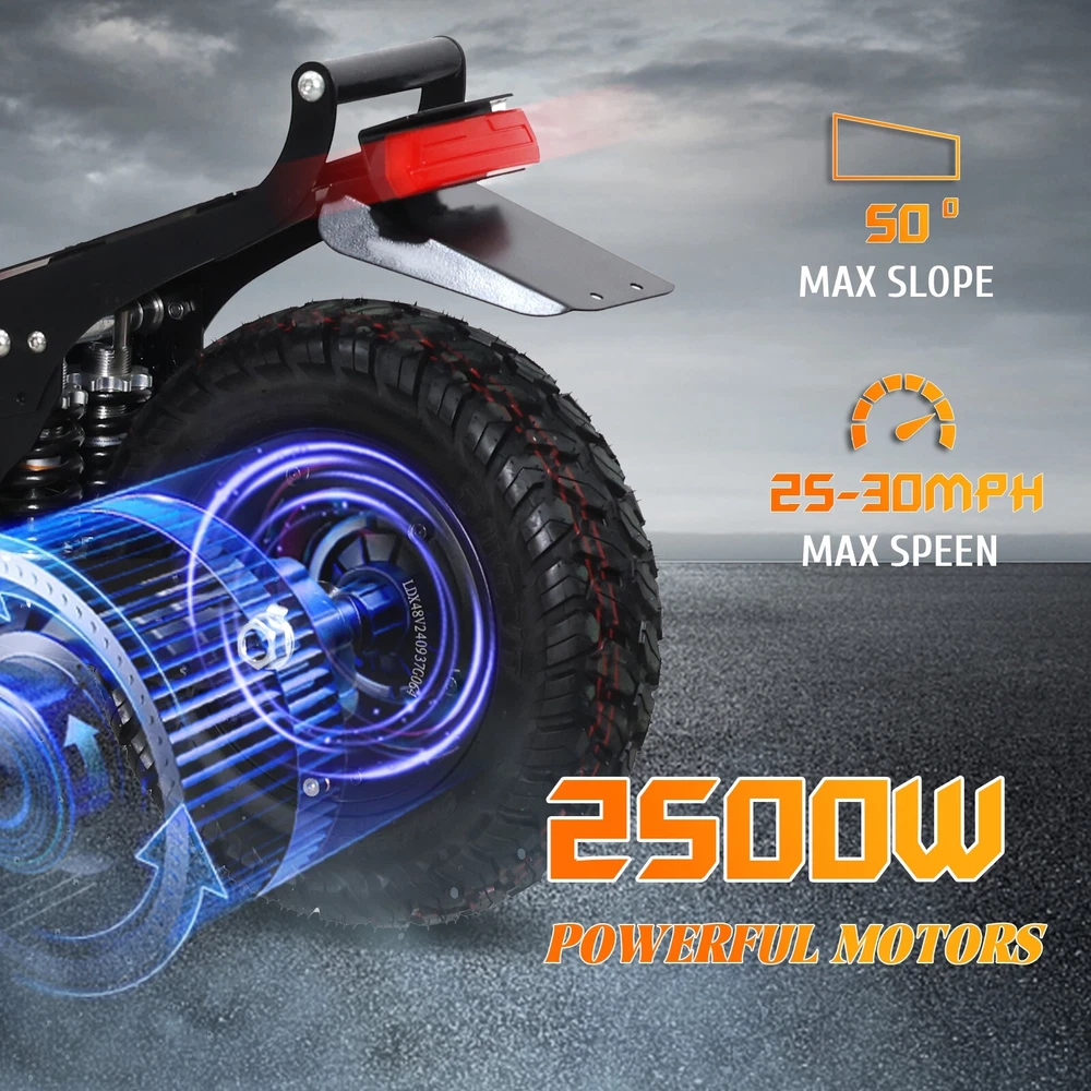 Disclaimer: Our merchandise is certified to the UL 2849 standard and supporting documentation is available upon request. Q30 parameters Front and rear shock absorber type: spring shock absorber Motor parameters: 48v2500w single motor Battery: 48V16AH Anti-theft type: key lock Front and rear brake type: disc brake USB charging mode (separate/instrument) large instrument (charging time 6-8 hours) Tire size: 11-inch off-road vacuum Maximum speed: 25-30MPH Endurance: 25-35MPH Taillight: taillight + driving light + turn signal Climbing angle: 25-35° Headlight configuration/horn: four-eye light + horn Acceleration gear: 3 gears Fender: adjustable fender + extension board Load: 265 lb Gross weight: 77 lb Packing size: 50 × 10.6 × 20.1 inches