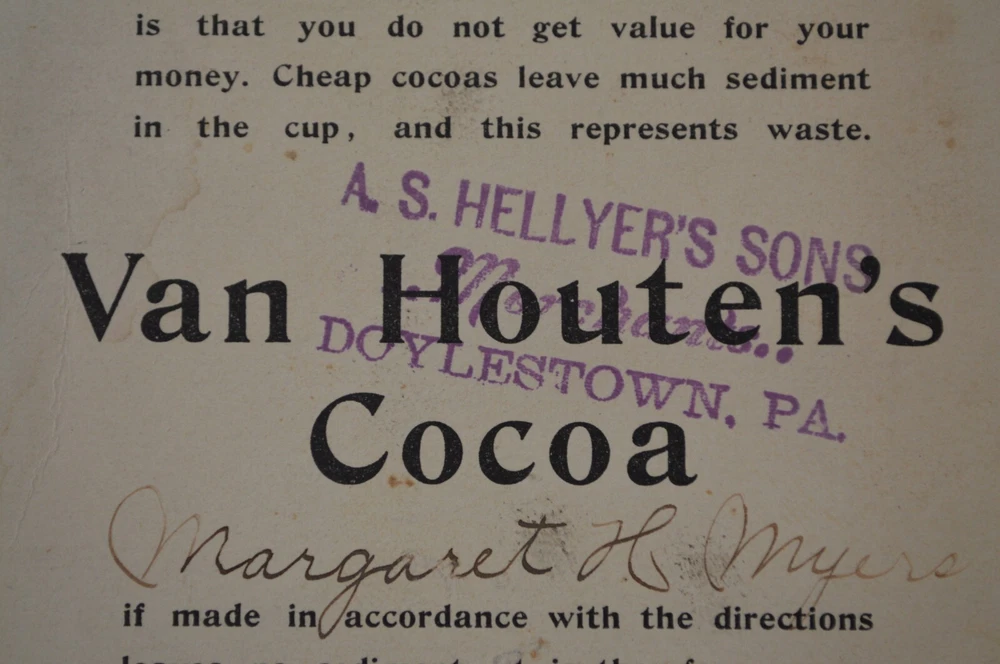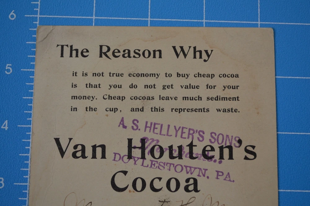 Description: A.S. Hellyer's Sons Doylestown Bucks County PA Trade Card for Van Houten's Cocoa. Old, but undated. Questions and offers welcome. Please review entire listing (including condition, title, pictures, description, and terms) before committing to purchase this listing. Before agreeing to purchase this listing, make your own determination on condition of the item(s) being offered in this listing. Pictures are part of the description and are provided to help illustrate condition. Since descriptions and opinions of condition can vary, seller provides prospective buyers with the ability to request more information and additional pictures before the close of this listing. When in doubt, please contact Taggart Neveling Books Ephemera, LLC "the seller" through eBay before you bid or agree to purchase this listing. This helps ensure a smooth transaction, one where Taggart Neveling Books Ephemera, LLC gets a sale and the buyer gets the item(s) they want to purchase. Condition & Disclosure of All Faults: All items appearing in this listing are pre-owned and are sold "AS-IS" and "WITH ALL FAULTS." No warranties, express or implied, are made in connection with this listing. Additionally, all other warranties not specifically listed above, are also disclaimed. Since the seller, Taggart Neveling Books Ephemera, LLC, does not provide any warranties with this listing, to the fullest extent allowed by law no sale shall be deemed invalid. A written description and uploaded pictures are offered to help provide a general idea of condition. Pictures are part of the description, but may not show every defect or flaw of an item or collection of items. The written description offered in this listing may not state every single defect or flaw in condition associated with item or items offered in this listing. However, Taggart Neveling Books Ephemera, LLC "the seller" offers potential buyers the ability to submit questions before agreeing to purchase this listing. Buyer agrees that a failure to exercise this option is not sufficient cause to initiate a return. Since Taggart Neveling Books Ephemera, LLC offers potential buyers the ability to submit questions before agreeing to purchase this listing, by bidding or agreeing to purchase this listing, buyer agrees seller has provided sufficient legal disclosure of all defects and faults, even if such defects and faults are not specifically identified in the written description or shown in the uploaded images. All statements and descriptions about age, authenticity, condition, fitness for a particular purpose, or origin of items offered in this listing, as well as those made in response to questions about this listing, reflect the opinion of the seller and are NOT offered as statements of fact. By bidding or agreeing to purchase this listing, the buyer agrees that to the fullest extent allowed by applicable law, Taggart Neveling Books Ephemera, LLC "the seller" will not be liable for any defect, error, or omission in this listing. By bidding or agreeing to purchase this listing buyer agrees to have performed all due diligence beforehand. By bidding or agreeing to purchase this listing buyer acknowledges the fact that some or all of the items offered in this listing may require cleaning, conservation, or repair. By bidding or agreeing to purchase this listing, buyer agrees ALL SALES ARE FINAL. NO REFUNDS. NO PARTIAL REFUNDS. NO RETURNS. NO EXCHANGES. Digital Photos and on Screen Viewing: Cameras and computers sometimes display colors differently. Colors, when viewed on a computer screen, can be lighter or darker than the actual item(s) that is being photographed. Please keep this in mind when you place your bid. Please also note: No display props or materials (tape measures, stands, or other items that may be used to help display a listing) are included. Taggart Neveling Books Ephemera, LLC welcomes questions, but asks all potential buyers to submit questions at least one day before the close of this listing. This helps ensure there will be enough time to respond to questions before the close of the listing. Payment Policy: Payment is due within two days of the close of a listing. If a listing remains unpaid for three or more days the issue will be reported to eBay. Failure to pay for an item in a timely fashion may result in a buyer being blocked from both current and future listings offered under this user ID. Sales Tax, Use Tax, Other Taxes: Since tax laws vary by state, you may be responsible for remitting sales or use tax to the appropriate state agency. The bidder, by bidding, agrees that if any sales or use tax (or any other tax) is due on the item(s) purchased, it is to be paid and remitted to the appropriate agency by the buyer and not the seller. Please note that eBay has largely automated this process. However, if there is any error in eBay's collection or the calculation of tax due, the buyer agrees, to the fullest extent allowed by law, to pay the correct amount to the appropriate agency and to not hold the seller responsible for covering any additional amount of tax due. Shipping Policy: Shipping Cost for this listing (Within Continental US): Item will ship for $4.95, with tracking, to continental US. Please note: No in-person pickups or deliveries are offered with this listing. Delivery for this listing will only be made via USPS mail. In listings without free shipping offered, total shipping cost includes all aspects of shipping, such as packing materials, time to pack the listing(s), time and expense incurred to get the listing(s) to the post office, and lastly postage. Postage is just one aspect of shipping cost. Please keep this in mind if you happen to see an instance where the shipping cost charged was higher than the postage cost. Time to Ship: All orders will ship within five business days. This means your order will ship, once it is paid for, within five business days. Additionally, orders will be tracked and tracking information will be 