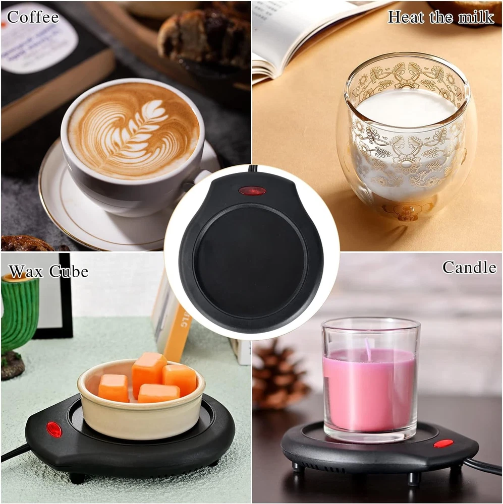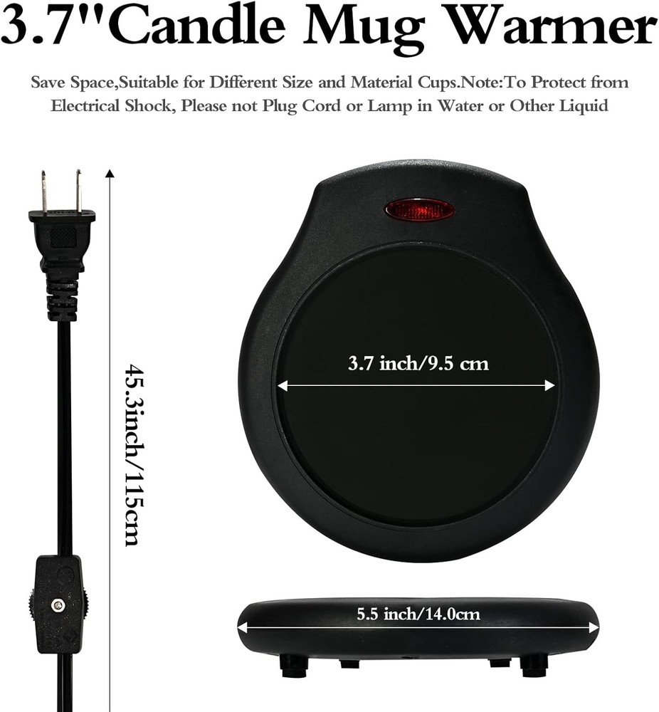 ASAWASA 2Pcs Candle Warmer Plate and Mug for Large Jar, New Balck Description Features: 【Enjoy Fragrance and Warmth】:ASAWASA WAX Mleter is made of high quality plastic.It has 17w power,The maximum temperature of the surface iron sheet can reach 130-150 ℃. You can put the candle jar on the heating plate, turn on the switch, It usually takes 2-4 hours to melt the candle jar. If you want to smell the fragrance immediately, it is recommended to light the candle jar and melt it. Then, after the candle is blown out, place it in a heat preservation plate to heat it. 【Portable,Lightweight & Multiple Uses】:3.5 inch diameter,weighs only 0.33 lbs.fit in home,kitchen and office to heat coffee,tea,milk,soup,cocoa, wax cubes and candles.(Note:It is recommended to use flat cups and containers for more uniform heating) 【Safe and Easy to Clean】:This product comes with a 40-inch cord and a switch,stable heating temperature, can effectively avoid fire, smoke and indoor pollution.Cleaning is very convenient and quick, just wipe it off.(Note:Only use for glass, ceramic or metal mugs) 【Decor & Gift】:Minimalist style design,match with various styles of mugs or containers perfectly.It’s also a wonferful gift for family, friends and colleagues,show your care and love on Mother's Day,Birthday,Valentine's Day,Thanksgiving and Christmas. 【100% Satisfactory Customer Service】:If you have any problems with the candle mug warmer, simply contact our customer service. We offer a risk-free 30-day return & replacement. Product Details: Item Weight: 12.32 ounces Capacity: 300 Milliliters Number of Trays: 1 Voltage: 1.2E+2 Volts (AC) Wattage: 17 watts Upper Temperature Rating: 1.5E+2 Degrees Celsius Manufacturer: ASAWASA Product Dimensions: 5.51 x 3.7 x 1.03 inches Item Weight: 12.3 ounces Item model number: 0 Batteries required: No Color: New Balck Material: Plastic Brand: ASAWASA Product Dimensions: 5.51"L x 3.7"W x 1.03"H Power Source: Corded Electric Handling We will ship all orders within 1 business day of payment. Delivery We Do Not Ship Outside of the Continental US. Return Policy All items qualify for returns within 30 days of receipt. Buyer is responsible for return shipping on any item that is not damaged. Feedback We take our reputation seriously, we buy and sell online, so we understand the value of trust. If you are unsatisfied with your order, please contact us and we will work with you to resolve it to your satisfaction.