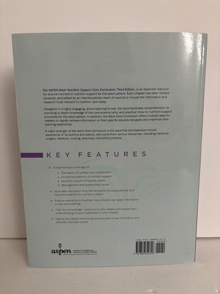 Publication Name:Aspen Adult Nutrition Support Core CurriculumItem Weight:67 OzItem Width:8.3 inPublication Year:2017Format:Trade PaperbackPublisher:American Society for Parenteral & Enteral NutritionISBN:9781889622316Item Height:0.8 inNumber of Pages:845 PagesSubject Area:Medicalgtin13:9781889622316Language:EnglishItem Length:10.7 inSubject:GeneralType:TextbookAuthor:Linda M. Lord, Charles M. Mueller