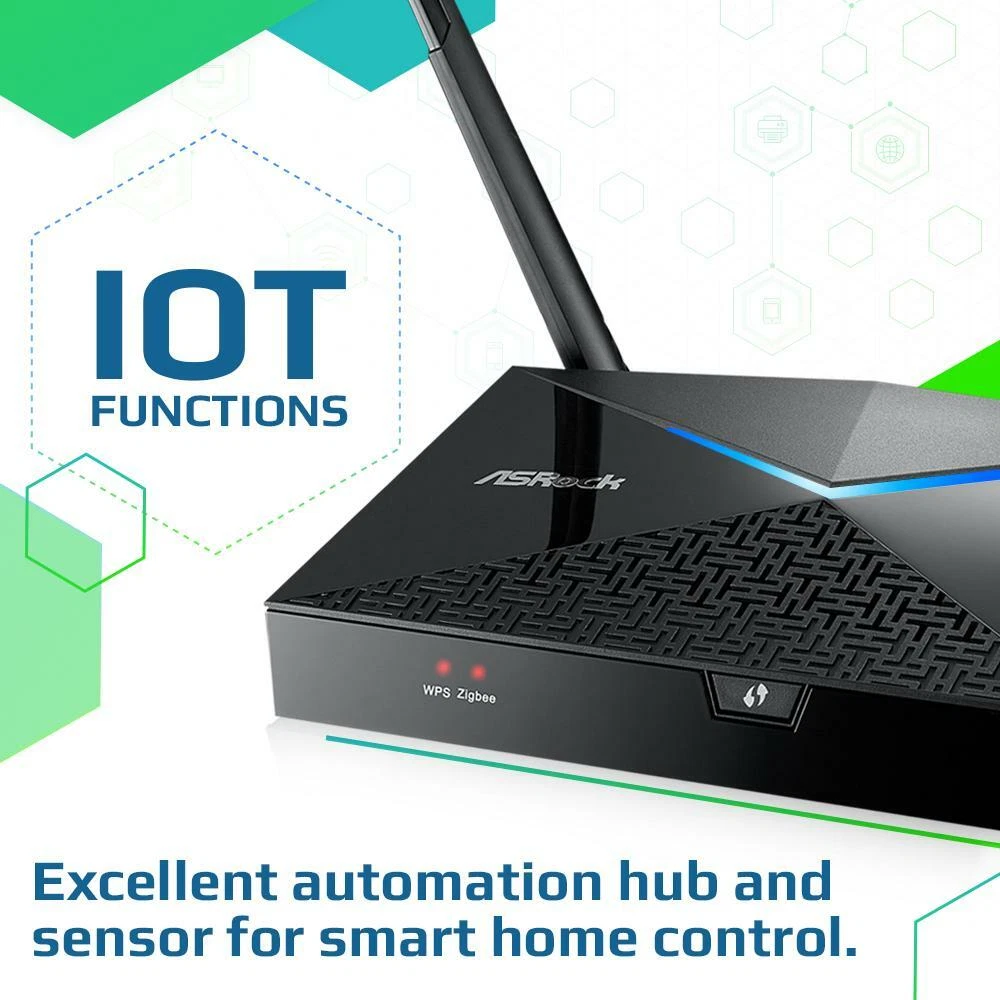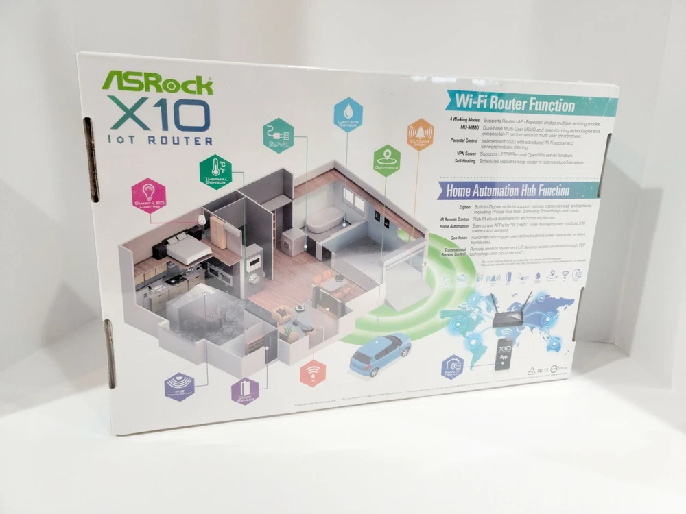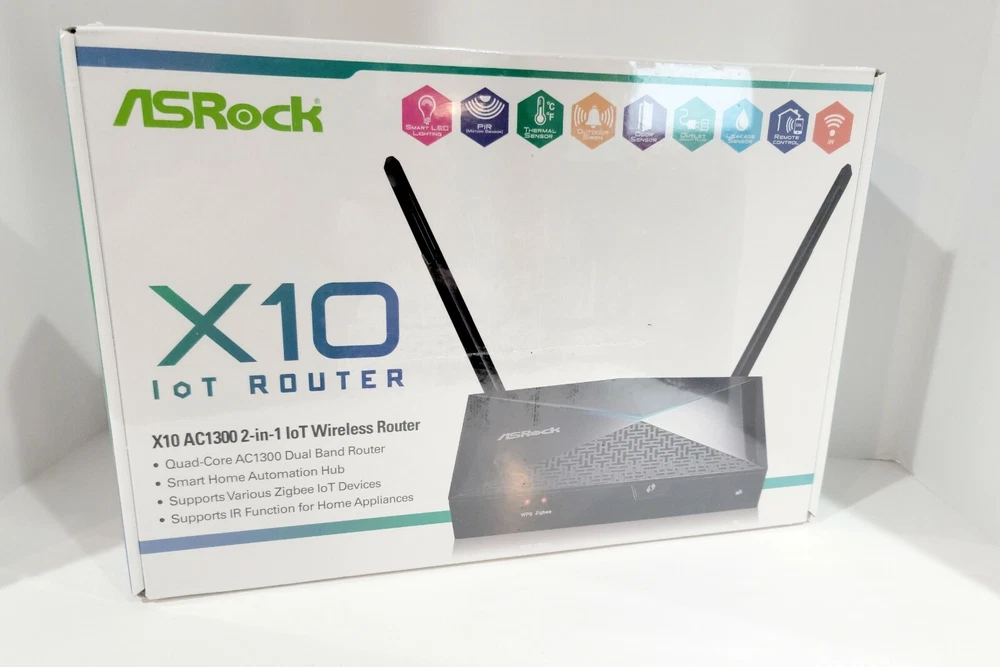 Features 11ac WiFi Router combines universal IoT HUB (2.4G/5GHz WiFi, Zigbee, Infrared) Single APP to manager multiple X10, multiple sensors & Philips HUE with cross control. (If-Then Rules, Scenes can be defined by user) Containing 3 different Cloud services (P2P with AES128 Encryption, IoT, Infrared support list database) Transnational Remote Control which can provide more flexible and convenience user experience. (IoT control, Storage upload/download) Package Contents ASRock AC1300 IoT Wireless Router Router Quick Installation Guide Power Adapter RJ-45 Ethernet Cable Hardware Parameters 802.11a/b/g/n/ac Wireless Standard Qualcomm Quad-Core A7 Processor 400Mbps 2.4GHz + 867Mbps 5GHz Speed External 5 dBi High Gain Antennas (WiFi) x 2 Gigabit WAN Port x 1, LAN Port x 4 USB 3.0 Port x 1, USB 2.0 Port x 1 for Storage IR Learning and List Mode Remote Control Zigbee Radio for IoT Applications Software Features WiFi protected access WPA/WPA2-AES IoT remote control through APP Supports MU-MIMO and beamforming L2TP/IPSec and OpenVPN VPN server support Parental control for children protection Guest SSID network access Periodically reboot self-healing function IoT Geo-fence automatically active USB data access System Requirement Microsoft Windows 7, 8, 10 iOS 8.1 or later Android 4.2 or later Dimensions 210 x 137.51 x 43 mm (w/o Antenna) 210 x 160.51 x 186.72 mm (w Antenna) Weight 440 g Wireless Standard 802.11a/b/g/n/ac Frequency Band 2.4GHz, 5GHz Simultaneous WAN Ethernet Port 1 x RJ45 10/100/1000 WAN Port LAN Ethernet Ports 4 x RJ45 10/100/1000 WAN Port USB Port USB 3.0 x1, USB 2.0 x1 Wireless Speed 2.4GHz: 500 Mbps 5GHz: 800 Mbps Wireless Security WPA, WPA2,Mixed, WPS Wireless Antennas 2 x internal high performance antennas 1 x sub-giga antenna (option) Power Source Output: 12V DC / 1.5A Power Source 1 Year Operating temperature 0° to 40° (32° to 104° F) Operating humidity 90% maximum relative humidity, noncondensing Certification FCC, CE, VCCI, IC, BSMI Product Details Brand: ASRock SKU: B074PXNRFQ Model: X10 MPN: X10 EAN: 4717677330922