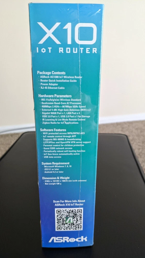 Maximum LAN Data Rate:1000 MbpsPorts:Ethernet (RJ-45), USB 3.0, USB 2.0Number of LAN Ports:4Brand:ASRockColor:BlackType:IoT Wireless RouterModel:ASRock IoT Wireless Router X10Maximum Wireless Data Rate:867 MbpsConnectivity:Wireless, Wireless (Wi-Fi), Wireless-Wi-Fi 802.11ac