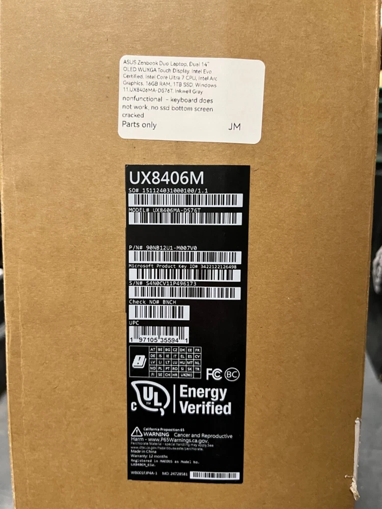 Parts, in original packaging Tested- nonfunctional, keyboard does not work, no ssd, and bottom screen cracked.