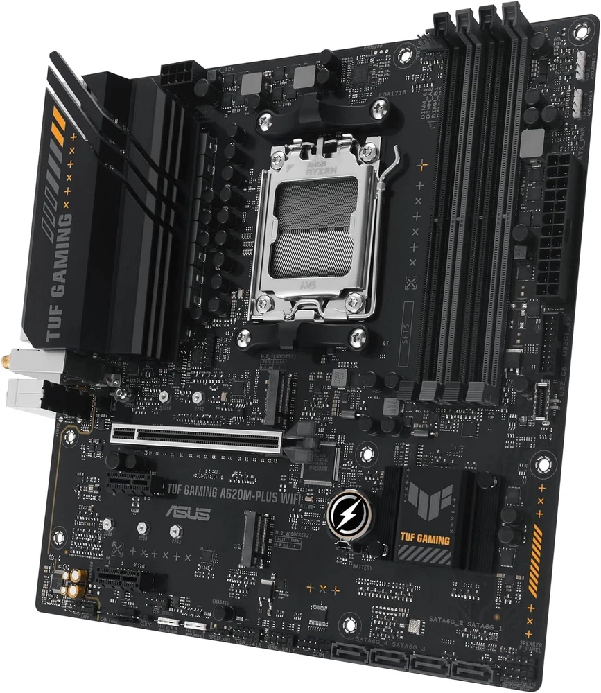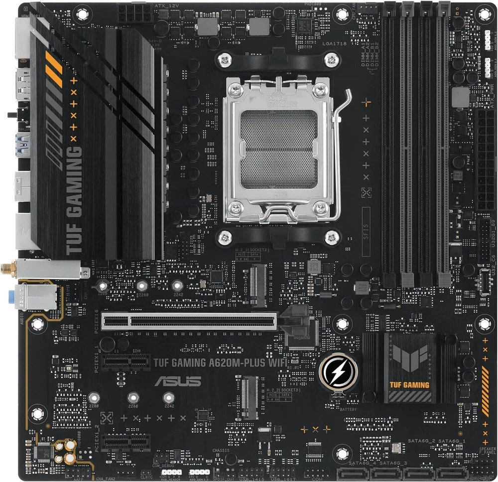 Further Details Title: ASUS TUF GAMING A620M-PLUS WIFI, AMD, MATX, 4DDR5, DP, HDMI Condition: New Brand: ASUS Series: TUF GAMING A620M-PLUS WIFI Form Factor: Micro ATX Compatible With: Personal Computer Type: Motherboards MPN: 0M-PLUS WIFI Item Weight: 1 kgg Model: TUF GAMING A620M-PLUS WIFI Comprehensive controls form the foundation of the ASUS TUF GAMING series. The TUF GAMING A620 motherboard packs flexible tools to tune every aspect of your system, enabling performance tweaks to perfectly match the way you work to maximize productivity. With upgraded power delivery and comprehensive cooling options to fuel AMD's CPUs, plus support for faster memory and storage, TUF GAMING A620 motherboards are the perfect foundation for your next high-core-count AMD battle rig. The TUF GAMING line offers easy setup for all builders. The TUF GAMING Alliance ecosystem grants compatibility, while Armoury Crate has Fan Xpert 2+, hardware info, Two-Way AI Noise Cancelation, RGB options and peripheral settings. This platform has intuitive tools to build and optimize dream rigs. TUF GAMING A620 motherboards provide a feature-packed high-performance gaming package, with ultrafast networking for smoother online gameplay, pristine audio with positional cues for FPS Gaming, and onboard RGB lighting that syncs with attached gear to personalize your gaming atmosphere. Missing Information? Please contact us if any details are missing and where possible we will add the information to our listing.