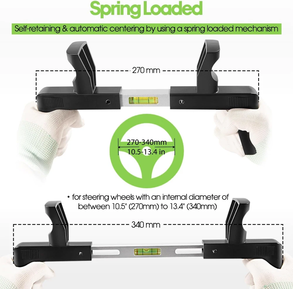 ATD-3100 Steering Wheel Level Alignment Tool 270mm-340mm for Passenger Cars Vans Features: Wide Application - This Steering Wheel Level Alignment Tool fits for steering wheels with an internal diameter of between 10.5" (270mm) to 13.4" (340mm), ideally suitable for passenger cars, vans and trucks. A must-have tool to level the steering wheel accurately and quickly Accurate Alignment - The Steering Wheel Level tool is a sturdy and simple tool, used to level the steering wheel before locking into position, prior to checking/adjusting the front wheel alignment. Ideal for use with 4-Wheel Laser Aligners such as Model No. GA70. Steering Wheel Holder to hold steering wheel in level position Jaga-tools In Search of Excellence! ATD-3100 Steering Wheel Level Alignment Tool 270mm-340mm for Passenger Cars Vans ATD-3100 Steering Wheel Level Alignment Tool 270mm-340mm for Passenger Cars Vans Features: Wide Application - This Steering Wheel Level Alignment Tool fits for steering wheels with an internal diameter of between 10.5" (270mm) to 13.4" (340mm), ideally suitable for passenger cars, vans and trucks. A must-have tool to level the steering wheel accurately and quickly Accurate Alignment - The Steering Wheel Level tool is a sturdy and simple tool, used to level the steering wheel before locking into position, prior to checking/adjusting the front wheel alignment. Ideal for use with 4-Wheel Laser Aligners such as Model No. GA70. Steering Wheel Holder to hold steering wheel in level position Spring Loaded - Featured a level bubble to show horizontal position. Self-retaining and automatic centering by using a spring loaded mechanism. The Steering Wheel Level Alignment Tool is held in place by springs that push the outside edges of the bubble level toward the edge of the steering wheel, adjustable for different diameter wheels Effortless Installation - Clamp onto the steering wheel before undertaking tracking or front-end wheel alignment. For optimal use in the assembly and disassembly of steering wheels, large clamping range. Fast and accurate alignment of the steering wheel during the wheel alignment Built To Last - Crafted from top-quality plastic and steel, for rustproof, high strength, deformation protection. All tools are fully selected & tested to provide stable performance and high reliability Description Package included: Steering Wheel Level Alignment Tool Item Specifics Brand JT-Motor Type Steering Wheel Level Alignment Tool Suit Passenger Cars, Vans & Trucks Material Steel Warranty 1 Year Manufacturer Part Number ATD-3100 Including Steering Wheel Level Alignment Tool Color Black silver Custom Bundle No Number of pieces 1 Payment Returns Jaga-tools In Search of Excellence! DESCRIPTION PAYMENT SHIPPING RETURN POLICY ATD-3100 Steering Wheel Level Alignment Tool 270mm-340mm for Passenger Cars Vans ATD-3100 Steering Wheel Level Alignment Tool 270mm-340mm for Passenger Cars Vans Features: Wide Application - This Steering Wheel Level Alignment Tool fits for steering wheels with an internal diameter of between 10.5" (270mm) to 13.4" (340mm), ideally suitable for passenger cars, vans and trucks. A must-have tool to level the steering wheel accurately and quickly Accurate Alignment - The Steering Wheel Level tool is a sturdy and simple tool, used to level the steering wheel before locking into position, prior to checking/adjusting the front wheel alignment. Ideal for use with 4-Wheel Laser Aligners such as Model No. GA70. Steering Wheel Holder to hold steering wheel in level position Spring Loaded - Featured a level bubble to show horizontal position. Self-retaining and automatic centering by using a spring loaded mechanism. The Steering Wheel Level Alignment Tool is held in place by springs that push the outside edges of the bubble level toward the edge of the steering wheel, adjustable for different diameter wheels Effortless Installation - Clamp onto the steering wheel before undertaking tracking or front-end wheel alignment. For optimal use in the assembly and disassembly of steering wheels, large clamping range. Fast and accurate alignment of the steering wheel during the wheel alignment Built To Last - Crafted from top-quality plastic and steel, for rustproof, high strength, deformation protection. All tools are fully selected & tested to provide stable performance and high reliability Description Package included: Steering Wheel Level Alignment Tool Payment Returns All rights reserved.
