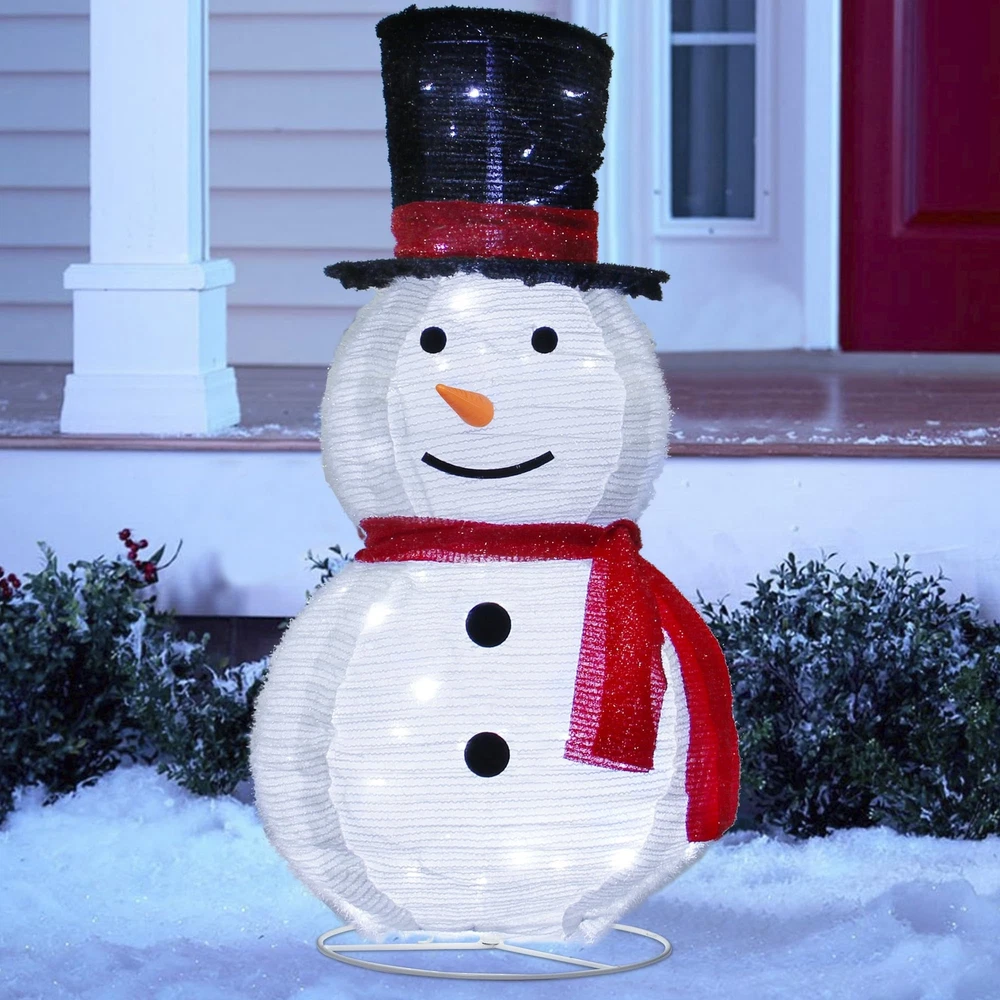 ⛄ PREMIUM QUALITY: This outdoor lighted snowman is made of a durable metal frame and covered in hand-sewn tinsel fabrics for a lovely look. ⛄ CUTE SNOWMAN: Our 3 foot light up snowman with a black top hat and drapes down a red scarf, carrot nose and black buttons, adorable design adds your Christmas and winter great fun, is the perfect Christmas decoration to greet family and this holiday season. ⛄ 60 PRE-LIT LED LIGHTS: This outdoor snowman decorations features 60 cool white LED lights, create a glowing nighttime display, plug in design for easy use, will brighten up your Christmas decor by creating an attractive focal point in your yard or porch. ⛄ EASY ASSEMBLE AND STORAGE: This snowman yard decoration with collapsible design for quick, easy set up and space saving storage, perfect for a small place, no tools or specialized skills are required, please refer to the instructions for detailed installation. ⛄ COLLAPSIBLE CHRISTMAS DECORATIONS: This Christmas Snowman come in a nice box that can be a Christmas gift for your family and friends, it can be used to decor your office, the living room, dining room or entryway. Great for Christmas Themed Party, Christmas Indoor and Outdoor Decorations, or Christmas yard Decoration!