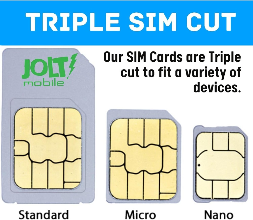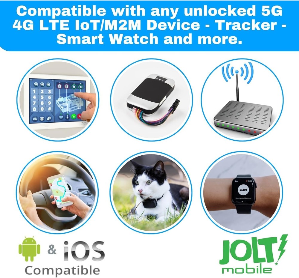 EBAY SHOP | FEEDBACK | NEWSLETTER | FAQ | CONTACT US CATEGORIES SMART WATCH SIM TRACKER SIM PREPAID SIM ALARM SIM ROLLOVER PLAN LOW COST PLAN 1 YEAR PLAN TOP VALUE PLAN ALARM SYSTEM SHIPPING WHY CHOOSE US! Jolt Mobile IoT Starter SIM Card - AT&T 5G 4G LTE Description Activate with any of Jolt Mobile’s affordable nationwide wireless service plans. SIM supports majority of AT&T compatible 5G 4G LTE GSM IoT Smartwatches, Trackers, Alarm Security System, Routers and other related IoT devices. 3 in 1 Triple Cut SIM card that includes standard-sized SIM, a Micro-sized SIM or a Nano-sized SIM card to fit any device. Punch out the Size you need. No Contract. No Activation Fees. Cancel anytime. Jolt Mobile service will work within the UNITED STATES ONLY. EASY ACTIVATION: A valid credit card is needed at activation. 3 EASY steps. You can also call us for assistance. Available 7 days a week LIVE CUSTOMER SUPPORT when you call our toll-free number. Jolt Mobile offers its services through subscription plans. Stay connected to AT&T’s secure IoT nationwide network, specifically designed to maximize your device performance. Jolt Mobile recommends using 5G 4G or newer devices for better service. To check coverage: JOLTiotmap To activate: activateJOLT To Refill: refillJOLT Our prepaid SIM card can be used with AT&T or any unlocked 5G 4G LTE GSM device such as but not limited to: Android Smart Watches GSM Smartwatches Smartwatch for kids Smart Watch for Seniors Smartwatch for Special Needs SOS Smart Wristband Pet trackers Vehicle / Car Trackers Trail and Game Cameras for hunting Live Streaming Cameras Solar Powered Cameras 4G Routers / Modems / WiFi / MiFi / Hotspots Outdoor Surveillance Camera Android Tablets, Apple iPad Mini/Pro/Air Series Any Unlocked GSM Device NOTE: After SIM activation, it might take up to 24-hours for the GPRS and data settings to sync and update with your device. Make sure you turned on the power in your device, in a good reception area. Jolt Mobile offers its services through subscription plans which auto-renew every 30 days. Service begins as soon as you activate your service. You’ll be charged the rate stated at the time of purchase, every month, until you cancel. There is No Contract. Cancellations can be made any time. TERMS AND CONDITIONS PORTING CANCELLATIONS / REFUNDS SHIPPING / PAYMENTS CONTACT US TERMS AND CONDITION By purchasing this item and following activation, you will receive 30 days of wireless service from Jolt Mobile. In this offering, you will receive a SIM card and an instructional flyer. This 30-day AT&T plan can be activated once on the Nation's fastest-growing wireless networks on which Jolt Mobile provides service as long as the device is compatible with that network. Jolt Mobile utilizes the best network in America for talk, text, and data service. Please review the coverage map at Joltiotmap site to ensure that you reside in an area where service is provided on your device. You likely do, but you will want to verify. Activate service via Activatejolt . Jolt Mobile offers a wireless service (Voice, Text, Data) on its own SIM Cards/Plans. Once you receive our Jolt Mobile SIM card, you can activate it with a new number (activation instructions provided on the SIM card kit); the new number will be assigned to that SIM card (the plan cycle will start from the time you first activate it) and you can start using it on your GSM-based device (GPS tracker, Smart Watch, Alarm, etc). If you already have a GPS tracker / SmartWatch / Alarm SIM card with an active number assigned to it with another company Enterprise, Corporate, and Affiliate Accounts are available - online account management portal and APIs to manage multiple SIM cards within a single account and one main airtime balance. When you are running low on your credits, a notification message and an email will be sent to you. You will also receive a notification that your service will expire on the last day of your service term. You will be notified to refill your account with additional service(s) should you exhaust any allotment for either voice or text or when your service term expires. You must utilize a compatible device to use Jolt Mobile. Any device currently active under a contract that has been suspended for non-payment or reported lost or stolen may be ineligible for use with this service. Additional exclusions may apply. Jolt Mobile offers its services through subscription plans which auto-renew every 30 days. Service begins as soon as you activate your service. You'll be charged the rate stated at the time of purchase, every month until you cancel. There is No Contract; Cancellations can be made at any time by contacting customer support. A valid credit card is required to cover overages in case you exceed the applicable Voice, SMS, and Data limits. To avoid overage charges, you should purchase the appropriate plan for your anticipated needs. We do not ship items outside of the USA or to Freight Forwarders. Service plans that are sold to Freight Forwarders will be canceled and refunded. PORTING * Not Available CANCELLATION AND REFUNDS We want you to be delighted with your purchase of this prepaid service. If you are not satisfied with your service and it is within 14 days of receiving your starter kit, we will refund your purchase in full. If you do not contact us to cancel the plan within this 14 day period, or if you consume more than 30 minutes, 30 texts or 30MB of data, your purchase will be considered buyer"s remorse and you will no longer qualify for a refund. SHIPPING AND PAYMENTS Standard shipping takes 3 to 7 business days (1 day handling time + 1-5 days transit time). ** Please note: at eBay, order processing and shipments take place Monday through Friday and are not processed during the weekends. Orders received after Friday at 12PM PST will be processed the next business day. We accept PayPal payments during checkout. Immediate payment is also required for all transactions, meani