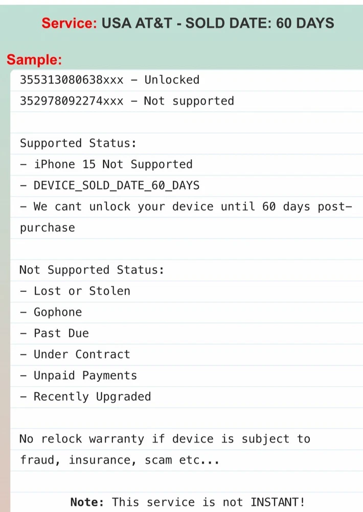 A non-refundable $5 service processing fee will apply if the unlock attempt is unsuccessful. It is the buyer’s responsibility to review the list of unsupported phones before making a purchase. Full refunds will only be provided if the error code encountered is not listed. Please ensure you verify the status of the device you wish to unlock prior to proceeding. AT&T USA - UNLOCK FOR STATUS imei DEVICE SOLD DATE 60 DAYS ⌛ Time: 0-3 Days Unlock Service for Android devices and Apple iPhone 6S to 14 models locked to AT&T USA purchased last 60 days. Before placing order buy other listing: USA AT&T UNLOCK & STATUS info to make sure status is: DEVICE SOLD DATE 60 DAYS. Service: USA AT&T - SOLD DATE: 60 DAYS Sample: 355313080638xxx - Unlocked 352978092274xxx - Not supported Supported Status: - iPhone 15/16 Not Supported - DEVICE_SOLD_DATE_60_DAYS - We cant unlock your device until 60 days post-purchase Not Supported Status: - Lost or Stolen - Gophone - Past Due - Under Contract - Unpaid Payments - Recently Upgraded No relock warranty if device is subject to fraud, insurance, scam etc... Note: This service is not INSTANT!