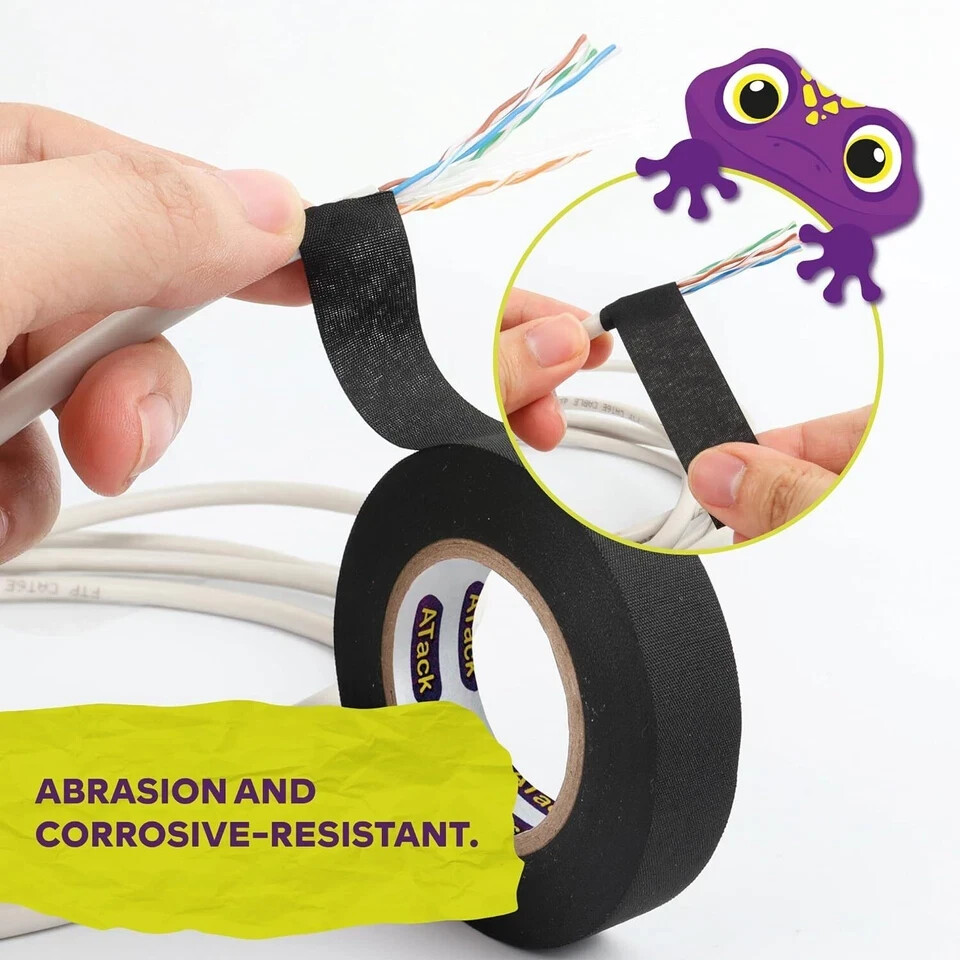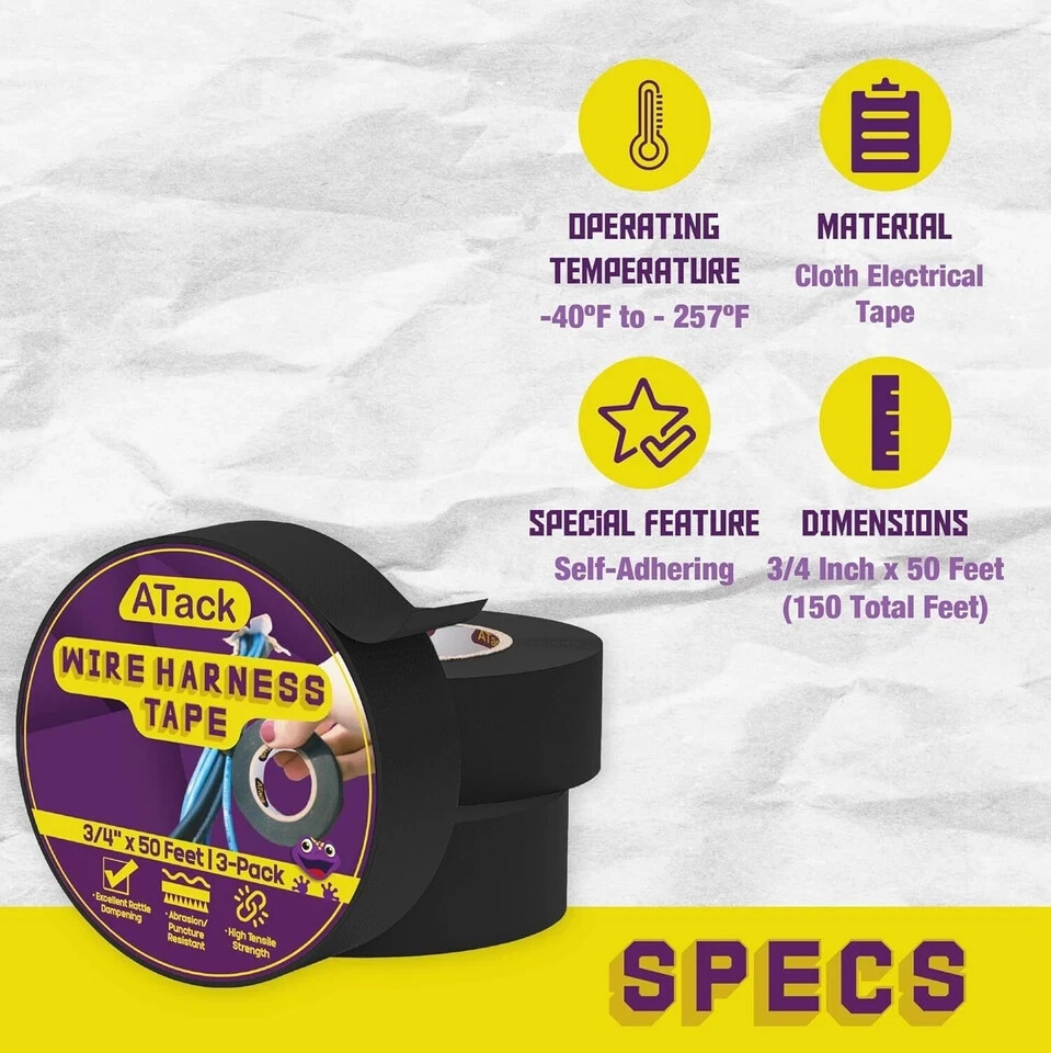 Color: Black Number of Items: 3 Special Feature: Self-Adhering Surface Recommendation: Cloth TRUSTED BY PROFESSIONALS. Protect your automotive wirings with this OEM-grade black cloth electrical tape. Most professionals trust this wire loom tape because of its excellent sound and rattle dampening performance. EASY TO TEAR BY HAND. This wire harness tape is easy to use and tear by hand. Achieve that neat and professional automotive wire bundling with this ATack high temp electrical tape. It also tears cleanly for both perpendicular and parallel cuts along with the roll. RESIST PUNCTURES, ABRASION, AND CORROSION. With its bi-dimensional fiber weave, this black cloth tape will keep your cable in its pristine condition even for a long time. There is no need to worry about loose tools that may puncture and damage your wires. STAYS INTACT AND DOES NOT LEAVE STICKY RESIDUES. This 3/4 inch wire loom tape is textile-based and won't leave any gooey residues on your wires even if used for years. It doesn't melt or ooze out even if exposed to high heat and humidity. HEAVY-DUTY AND FLEXIBLE. This automotive wire loom tape lessens coil whining and can insulate up to 69kV and operate at temperatures of -40℉ - 257℉. Its thick cloth body dampens sharp and knocking sounds, making it the best choice if you are aiming for better acoustics. It's the perfect heat proof wiring loom cover tape for automotive engines, circuit maintenance, and speaker loom bundling. Messy wiring everywhere - in your auto, in the sound studio? It's time to use the most reliable automotive wire tape! The ATack Wire Harness Tape is an OEM-grade cloth wire loom tape that's excellent in sound and rattle professionals also choose this automotive wiring tape for circuit maintenance, speaker loom bundling, and automotive engines. Here's why you should switch too:1. This automotive wire car tape is super easy to use, install, and handle. Just wrap the tape on the wire and tear it gently by hand.2. No to gooey residues when using the high temp wire harness tape. You can trust this brand to protect your wirings from residues even in high heat and high humidity environments.3. Expect strong adhesion from this heavy-duty cloth speaker wire tape. It is rigid but flexible and prevents tape from curling AND REACH COMPLIANT. The ATack heat resistant wire loom tape got you covered when it comes to safety! This wire harness wrap tape delivers risk-free adhesion and maintenance. It is waterproof and weatherproof, meaning it can protect your wires against water, spills, oil, dust, dirt, and other harmful substances that may corrode the wire.STRONG ADHESION. This wire protection tape provides strong adhesion and doesn't easily break. It's an automotive wiring harness tape with a carbon-weave backing that gives rigidity and strength. Still, it's also flexible, preventing the tape from curling unnecessarily on itself, allowing you to bundle and wrap hard to reach cables quickly.