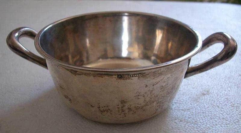 HERE OFFERED FOR SALE THIS ANTIQUE SOLID SILVER AUSTRO HUNGARIAN SMALL SAUCEPAN. IT HAS 2 HANDLES . MADE WITH CLEAN LINES . DIAMETER IS 12.5 CM (5 ") AND IT IS 5.5 CM (2.2") HIGH.WEIGHT IS 197.5 GRAMS (6.3 OZ). CONDITION-A FEW DENTS ON BOTTOM .IT IS HALLMARKED WITH THE AUSTRIAN FLOWER AND HEAD IN THE MIDDLE AND REINER FOR THE MAKER . WE ALSO HAVE ON SIDE OF SAUCEPAN THE ENGRAVING " AU 35 " . BUYER WILL PAY $25.00 FOR INSURED REGISTERED AIR-MAIL AND HANDLING. I ACCEPT PAYMENT BY PAYPAL