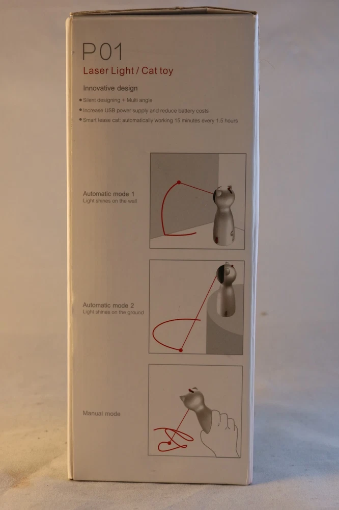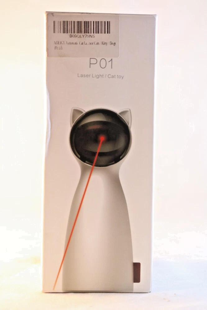 The product is an automated interactive laser toy designed for cats or dogs. It is an indoor electronic toy with three modes of operation. The brand is CA&T, and the model number is P01. The unit is manufactured by umosis in China. The toy is white in color and is designed to be interactive. The product dimensions are 3 x 3 x 7.5 inches, and it weighs 8.15 ounces. Item is new in original packaging. According to research it's a fun toy for cats or dogs although to me it looks like it's geared more towards cats but play is play and fun is fun.