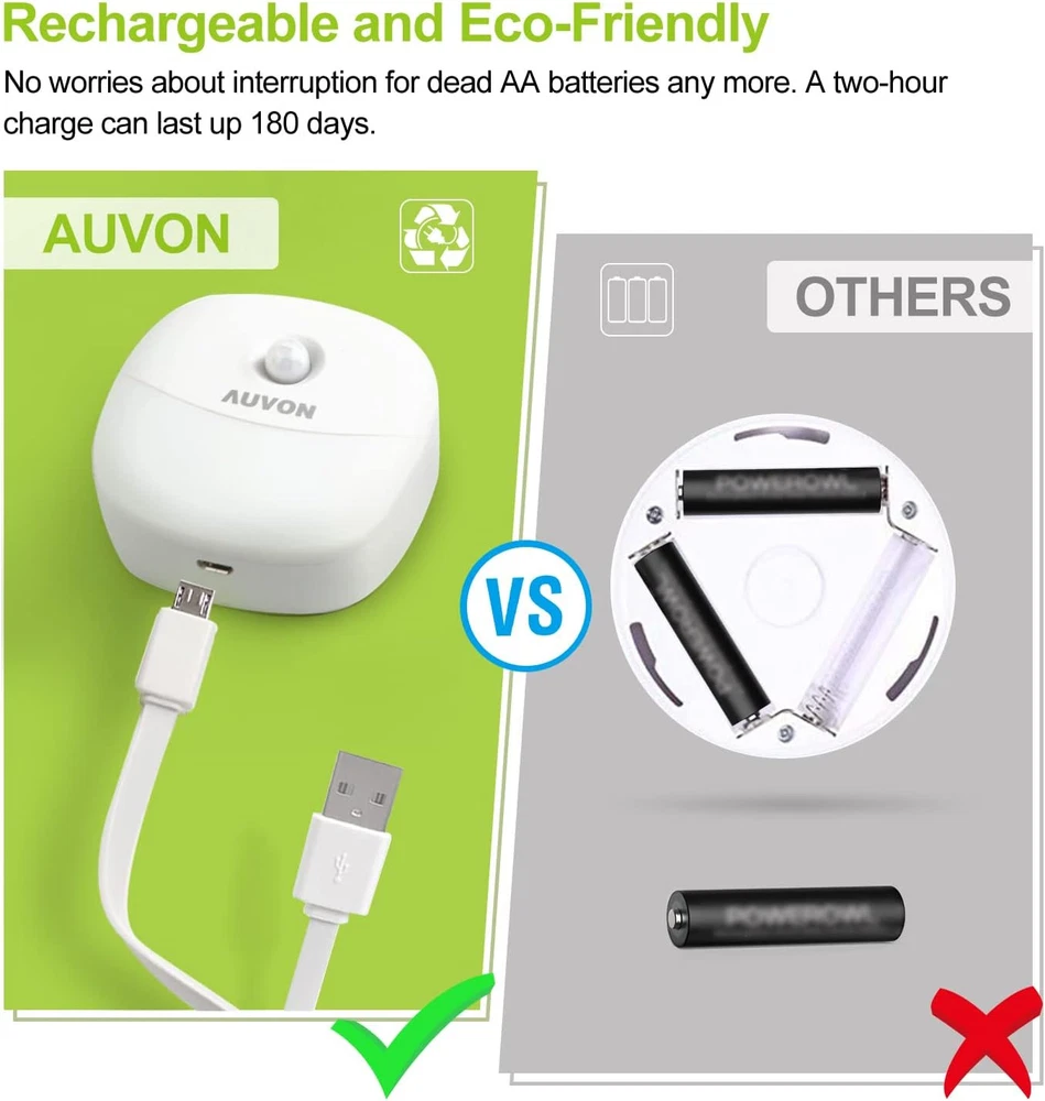 AUVON Rechargeable Battery Night Light, Mini with Motion 2 Pack, A-Warm white Product Details Finish Type: Lacquered Base Material: Plastic Product Dimensions: 2.2"D x 2.2"W x 1.1"H Lamp Type: Night Light Shade Color: White Shade Material: Plastic Switch Type: Push Button Style: Stick on Brand: AUVON Color: A-Warm white Special Feature: Motion Sensor and Dusk to Dawn Sensor Light Source Type: LED Material: Plastic Room Type: Kids Room Recommended Uses For Product: anywhere Power Source: Battery Powered Shape: Round Controller Type: Push Button Number of Light Sources: 2 Connectivity Technology: USB Included Components: 2 * Nightlights Is Waterproof: False Mounting Type: Wall Mount Number of Items: 2 Lighting Method: Adjustable Control Method: Touch Indoor/Outdoor Usage: Outdoor Specific Uses For Product: Stairs, Young children's fear of darkness, Nursing mothers' late-night visits Water Resistance Level: Not Water Resistant Installation Type: Stick on Number of Pieces: 2 Voltage: 5 Volts Brightness: 12 Lumen Is Cordless?: Yes Size: 2 Pack Manufacturer: AUVON Part Number: AUVON Item Weight: 4.2 ounces Item model number: A5128 Batteries: 1 Lithium Polymer batteries required. (included) Is Discontinued By Manufacturer: No Finish types: Lacquered Special Features: Motion Sensor and Dusk to Dawn Sensor Batteries Included?: Yes Batteries Required?: Yes Color Temperature: 2700 Kelvin Is Discontinued By Manufacturer : No Product Dimensions : 2.2 x 2.2 x 1.1 inches; 4.23 ounces Item model number : A5128 Batteries : 1 Lithium Polymer batteries required. (included) Manufacturer : AUVON Finish Type: Lacquered Base Material: Plastic Product Dimensions: 2.2"D x 2.2"W x 1.1"H Lamp Type: Night Light Shade Color: White Living Smart with Mini Motion Sensor Night Lights. Many AUVON customers use them as a visual aid for stairs and other potential obstacles or hazards. These mini led nightlights are also chosen for young children who are afraid of nightmare and darkness, as well as nursing mothers making late-night visits to their infant’s room. 2nd Gen Rechargeable Night Light. No worries about buying and changing non-recyclable AAA batteries frequently. A two-hour charge for this rechargeable battery night light can last up to 180 days when choosing Auto+Medium Mode. It's with a magnetic strip for mounting in addition to double-sided adhesive pads for places with limited electricity access. As it can stand on any flat surfaces, you could place it wherever you love for lighting the way. Passive Infrared Technology. It uses an expensive passive infrared motion sensor to detect movement within 3-5 meters for automatic turn-on, and will automatically turn off after 20 seconds of no movement. 5 Useful Modes. 2 Brightness Modes and 3 Lighting Modes are included for a battery night light. You can choose the desired brightness from the high or medium by simply pressing a button on the top of it while choosing lighting modes from AUTO, ON or OFF for different occasions and provide you the best using experience.