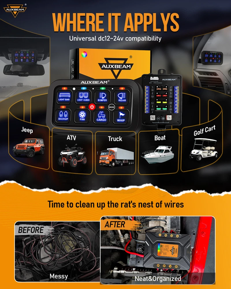Automatic adjustment: Back light brightness automatic dimmable To Control: Brake Light, Front Fog Light, Headlight, Fog/Driving Light gtin13: Does not apply Universal Fitment: Yes Fitment: for Truck, Boat, Car, Bus, Off-road, Powersports, Marine Features: Dustproof, LED Light Type: 8 Gang RGB Switch Panel Waterproof rating: IP65 Rated voltage: 12V 20A / 24V 10A Brand: AUXBEAM UPC: Does not apply Manufacturer Part Number: 8 Gang RGB Switch Panel Set Operating at 12 Volts: max power rating of 720W Model: TOGGLE/ MOMENTARY/ PULSED MODE Switch operation: On-Off Working voltage: DC 12-24V Operating temperature: -40°C -, 105°C Operating at 24 Volts: max power rating of 1400W Control: 8-Gang two-sided outlet switch panel. Placement on Vehicle: Door, Dashboard, Center Console Max current: 60A Fitment 2: ATV, UTV, SUV, Side by Side, SxS, Heavy-duty machines