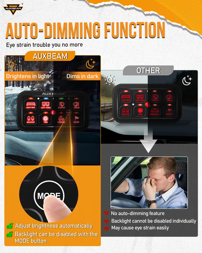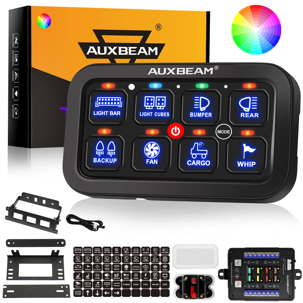 qazws_72 Welcome Product Description RB80 Series RGB switch panel is now available! ★Upgraded Functions: ✔ RGB back light - Unlimited color options match dash lighting and vehicle ✔ 3 mode setting - Toggle/ Momentary/ Pulsed ✔Manual backlit off - Turn off the back light when it's daytime or when it's not necessary ✔ DIY switch panel - Use the provided 60pcs switch labels to indicate what’s connected to that switch. ✔ 10FT wiring harness - Extend from 9FT to 10FT ✔ Waterproof cover - Protect the switch panel from rain & snow weather or water Specification: Voltage Input: DC 12-24V Max Current: 60A Rated Voltage: 12V 20A / 24V 10A Max Power: 720W/12V, 1400W/24V Waterproof Rating: IP65 Operating Temperature: -40°C ~105℃/-40℉~221℉ Features: ▶RB80 RGB Switch Panel 8-Gang two-sided outlet switch panel. It allows you to control up to 8 different LED lights or devices. Meet all your electrical needs. 3 modes setting. Each switch has 3 kinds of light status, different indicator status represents different working modes. RED- Toggle, Constant light mode (Great for things like fog lights or driving. ) BLUE- Momentary, Press & hold the button to turn on, then release the button to turn off, just like pressing the horn button. GREEN- Pulsed, Flash mode. Press the switch once and the device will flash on/flash off, continuing until the switch is pressed again. RGB back light color. Adjust back light color and brightness to match your vehicle. Back light brightness automatic dimmable. Automatic adjustment according to the brightness variation of the environment. Customize your own switch panel with 60 universal stickers . Use the provided switch labels to indicate what’s connected to that switch. Universal fitment. Widely use for Truck, Boat, Car, Bus, Off-road, Powersports, Marine, ATV, UTV, SUV, Side by Side, SxS, Heavy-duty machines, etc. Waterproof IP65 , high sensitivity, stability and strong anti-interference ability Easy Installation. No complicated wiring, no need to cut a big hole in your vehicle. Plug & play wiring harness can connect the LED lights or accessories easily. With 2 types of mounting brackets, you can mount the panel in the best location for your vehicle, such as the dash panel, center console, overhead sunglasses holder, etc. Packing Included: 1 x 8 Gang Switch Panel Set Product Display Payment We accept PayPal via eBay Secure Check-Out only. Payment is expected within 7 days of auction close. Unpaid Items will be forfeited per eBay . Immediate payment needs to be processed for items with Add to Cart option so that any promotional discounts can be applied to your order immediately. Shipping Notice: 1 .We do everything we can to ship your orders out as soon as possible. 2. Shipping and Handling: We process orders within one business day after the payment was clear. ---For domestic economic shipping, It normally takes 2-8 days for delivery. We may ship your order(s) from different warehouses for expedited delivery as we utilize alternative warehouses across the Continental United States.You may upgrade to UPS 3-day Selected which delivery time is typically 1-3 business days. Please be noted that, this service is more recommended for Monday-Thursday orders. Orders on Friday may be processed on following Monday by UPS, according to UPS's policy. ---For International Orders, items may be shipped from our warehouse in south China. Both are the same products and same warranty. Duties and taxes may apply. Please check with your country's custom and eBay policy for more information. Returns Our 30-day Satisfaction Guarantee assures our customers that they will receive all orders promptly and exactly as described. In addition, it allows customers to return new and unused products in their original factory condition for any reason within 30 days from the date of purchase. 1. All returns must be pre-approved by us and have a return merchandise authorization(RMA) number. Unauthorized returns will not be accepted. 2. Buyers are responsible for appropriate packing, returning shipping cost, insurance and returning the item in "new" condition. Used items will not be accepted for return. 3. We will replace the returning item with an identical item, issue a full store credit or a full refund. Feedback 1. We appreciate your business and strived to improve our customer service and our commitment to quality. 2. We will leave a positive feedback immediately after payment is received. We appreciate a positive feedback as much as you do. 3. If for some reason there is any issue with the purchase, please contact us prior to leaving feedback, and we will be glad to work with you to have it resolved. Thank you for visiting my store!