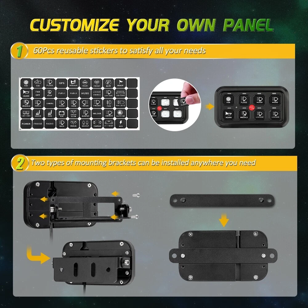 smafay Welcome Description The New RGB switch panel is now available! We do some big upgrades on switch panel! The latest system can be operated via switch panel or smartphone. It’s not limited to just controlling the “ON/OFF” of the LED Lights or electrical devices. Change the color and lighting modes to have fun programming with Auxbeam latest RGB switch panel! Upgraded Functions: ★ RGB -Unlimited color options match dash lighting and vehicle ★ 3 mode setting - Toggle/ Momentary/ Pulsed ★ Bluetooth APP control - Access to accessories no matter whether you are in the vehicle ★ Group setting - Set up a group via APP to control 2 or more lights at the same time ★ DIY switch panel - 60pcs stickers/ 200 default icons/ phone album photos Specification: Working voltage: DC 12-24V Max current: 60A Rated voltage: 12V 20A / 24V 10A Operating at 12 Volts: max power rating of 720W Operating at 24 Volts: max power rating of 1200W Switch operation: On-Off Operating temperature: -40°C - +105°C Waterproof rating: IP65 Features: 8-Gang one-sided outlet switch panel. It allows you to control up to 8 different LED lights or devices. Command all your vehicle accessories by the tap of your finger. 2 control methods - Switch panel & Bluetooth APP, work synchronously. Built-in Bluetooth module allows you to program and control the system anytime & anywhere. 3 modes setting. Each switch has 3 kinds of light status, different indicator status represents different working modes. RED-Toggle, Constant light mode BLUE-Momentary, Press & hold the button to turn on, then release the button to turn off GREEN-Pulsed, Flash mode RGB color. Adjust color and brightness to match your vehicle. brightness automatic dimmable. Automatic adjustment according to the brightness variation of the environment. Customize your own switch panel with 60 universal stickers. DIY button icon on APP. 200 default icons or photo from phone album. Setup group. Manage multiple accessories in your custom groups. Set up 2 or more accessories in a group and control them at the same time. Universal fitment. Widely use for Truck, Boat, Car, Bus, Off-road, Powersports, Marine, ATV, UTV, SUV, Heavy-duty machines, etc. Waterproof IP65, high sensitivity, stability and strong anti-interference ability Easy Installation. No complicated wiring, no need to cut a big hole in your vehicle. Plug & play wiring harness can connect the LED lights or accessories easily. Two types of mounting brackets, you can install anywhere you need, such as the dash panel, center console, overhead sunglasses holder, etc. Bluetooth Connection Requirements: Compatible with IOS & Android devices IOS 9.0 or newer version, Android 4.5 newer version Download the “Switch panel” app from Apple store or Google Play Store (free download). Scan QR code on the instructions. Package Included: 1 Set of 8 Gang RGB Switch Panel (all necessary hardware and wiring harness is included) Installation Instructions Guideline for connecting the red, yellow and white control cables: * The red cable connects the master switch power cable to the ACC. If you want to light up the LED lamps before the car start-up, please connect the recommended because the higher the power is, the more the power of the battery will be consumed. Product Display Payment & Shipping We accept Ebay Payment. Payment should be completed within 7 days of auction closing, or Unpaid Dispute will be filed . If you can not pay in time, please contact us. All items will be shipped out within 48 hours after your payment is verified. Return & Replacement 1. Our items come with a Three-month or One-year warranty. We shall pay much attention to your order and will do our best to solve any problems in a professional business manner. 2. If you are dissatisfied with our items, please contact us for return address within 30 days upon receipt of the delivery. The item must be returned with the original package for refund or exchange. Before you return, please check twice to confirm the item not work and contact our customer service representative, let us know the detailed problem or send us some pictures for confirmation. Feedback 1. Dear buyers, we appreciate your business, if you are satisfied with our service, please leave us a positive feedback and 5 scores DSR . Your recognition will make us more confident to develop business and serve you better. 2. Our goal is to make sure you are a happy buyer and pleasant shopping with us. If you have any questions, please contact us for a resolution firstly . Our working time is (GMT+8) Monday to Friday, 9:00-18:00. We will respond your email as soon as we can . 3. We understand the concerns and frustrations you might have, and will do our best to resolve the issues. Please give us the opportunity to resolve any problem. Thank you for visiting my store!