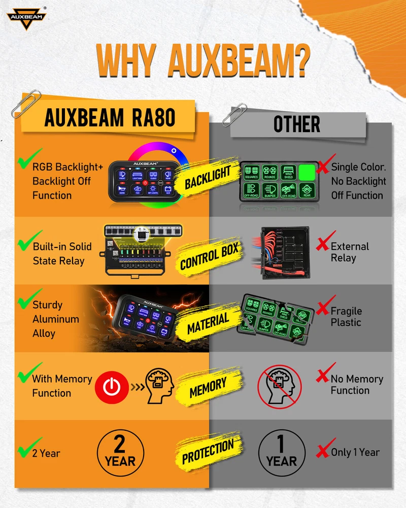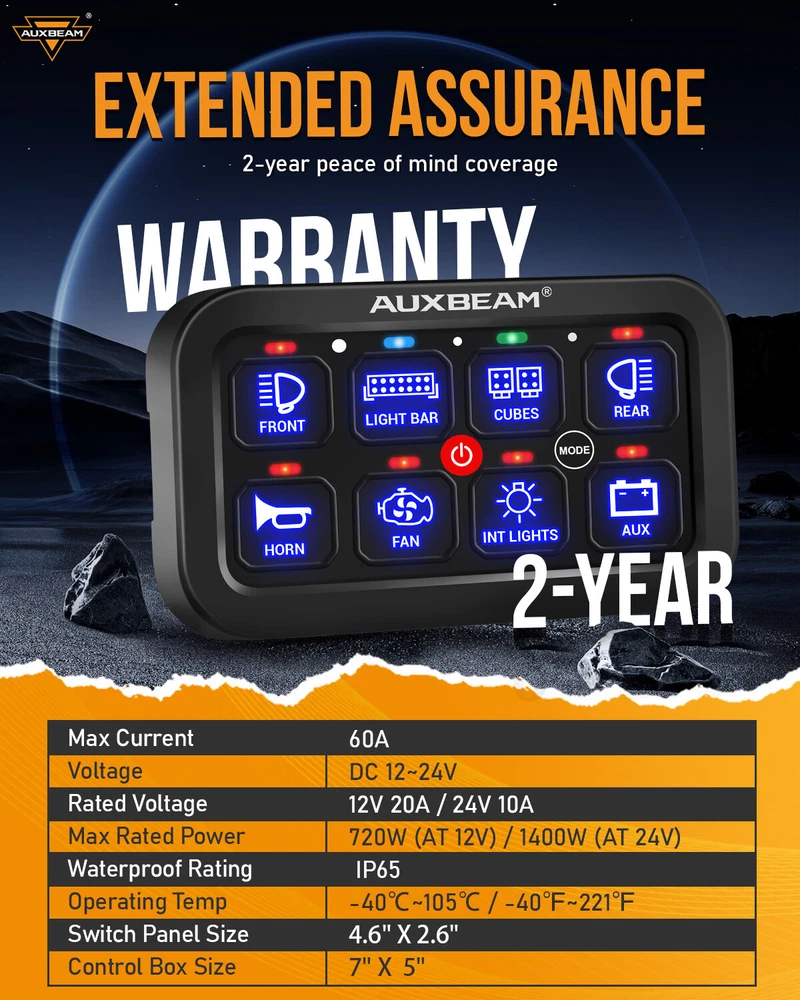 vernavali Welcome Product Description RA80 Series RGB switch panel is now available! ★Upgraded Functions: ✔ RGB back light - Unlimited color options match dash lighting and vehicle ✔ 3 mode setting - Toggle/ Momentary/ Pulsed ✔Manual backlit off - Turn off the back light when it's daytime or when it's not necessary ✔ DIY switch panel - Use the provided 60pcs switch labels to indicate what’s connected to that switch. ✔ 10FT wiring harness - Extend from 9FT to 10FT ✔ Waterproof cover - Protect the switch panel from rain & snow weather or water Specification: Voltage Input: DC 12-24V Max Current: 60A Rated Voltage: 12V 20A / 24V 10A Max Power: 720W/12V, 1400W/24V Waterproof Rating: IP65 Operating Temperature: -40°C ~105℃/-40℉~221℉ Features: ▶RA80 RGB Switch Panel 8-Gang one-sided outlet switch panel. It allows you to control up to 8 different LED lights or devices. Meet all your electrical needs. 3 modes setting. Each switch has 3 kinds of light status, different indicator status represents different working modes. RED -Toggle, Constant light mode (Great for things like fog lights or driving. ) BLUE -Momentary, Press & hold the button to turn on, then release the button to turn off, just like pressing the horn button. GREEN -Pulsed, Flash mode. Press the switch once and the device will flash on/flash off, continuing until the switch is pressed again. RGB back light color. Adjust back light color and brightness to match your vehicle. Back light brightness automatic dimmable. Automatic adjustment according to the brightness variation of the environment. Customize your own switch panel with 60 universal stickers . Use the provided switch labels to indicate what’s connected to that switch. Universal fitment. Widely use for Truck, Boat, Car, Bus, Off-road, Powersports, Marine, ATV, UTV, SUV, Side by Side, SxS, Heavy-duty machines, etc. Waterproof IP65 , high sensitivity, stability and strong anti-interference ability Easy Installation. No complicated wiring, no need to cut a big hole in your vehicle. Plug & play wiring harness can connect the LED lights or accessories easily. With 2 types of mounting brackets, you can mount the panel in the best location for your vehicle, such as the dash panel, center console, overhead sunglasses holder, etc. Packing Included: 1 x 8 Gang RGB Switch Panel Set Product Display Payment We accept PayPal via eBay Secure Check-Out only. Payment is expected within 7 days of auction close. Unpaid Items will be forfeited per eBay . Immediate payment needs to be processed for items with Add to Cart option so that any promotional discounts can be applied to your order immediately. Shipping Notice: 1 .We do everything we can to ship your orders out as soon as possible. 2. Shipping and Handling: We process orders within one business day after the payment was clear. ---For domestic economic shipping, It normally takes 2-8 days for delivery. We may ship your order(s) from different warehouses for expedited delivery as we utilize alternative warehouses across the Continental United States.You may upgrade to UPS 3-day Selected which delivery time is typically 1-3 business days. Please be noted that, this service is more recommended for Monday-Thursday orders. Orders on Friday may be processed on following Monday by UPS, according to UPS's policy. ---For International Orders, items may be shipped from our warehouse in south China. Both are the same products and same warranty. Duties and taxes may apply. Please check with your country's custom and eBay policy for more information. Returns Our 30-day Satisfaction Guarantee assures our customers that they will receive all orders promptly and exactly as described. In addition, it allows customers to return new and unused products in their original factory condition for any reason within 30 days from the date of purchase. 1. All returns must be pre-approved by Rbigdoggy and have a return merchandise authorization(RMA) number. Unauthorized returns will not be accepted. 2. Buyers are responsible for appropriate packing, returning shipping cost, insurance and returning the item in "new" condition. Used items will not be accepted for return. 3. We will replace the returning item with an identical item, issue a full store credit or a full refund. The sole and exclusive maximum liability to Rbigdoggy arising from any product sold on Rbigdoggy ebay account shall be the price of the product ordered. Feedback 1. We appreciate your business and strived to improve our customer service and our commitment to quality. 2. We will leave a positive feedback immediately after payment is received. We appreciate a positive feedback as much as you do. 3. If for some reason there is any issue with the purchase, please contact us prior to leaving feedback, and we will be glad to work with you to have it resolved. Thank you for visiting my store!