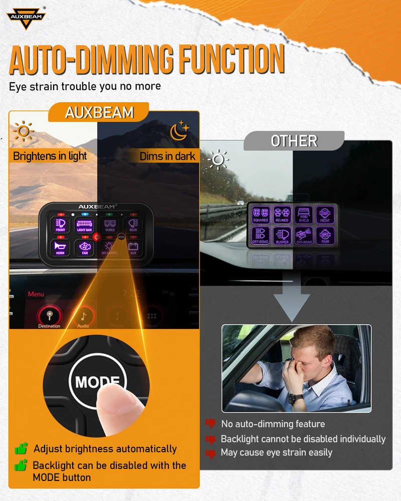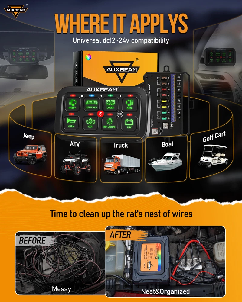 Type: 8 Gang RGB Switch Panel Operating at 24 Volts: max power rating of 1400W To Control: Brake Light, Front Fog Light, Headlight, Fog/Driving Light Operating at 12 Volts: max power rating of 720W Automatic adjustment: Back light brightness automatic dimmable Control: 8-Gang one-sided outlet switch panel. Manufacturer Part Number: 8 Gang RGB Switch Panel Set Waterproof rating: IP65 Universal Fitment: Yes Model: TOGGLE/ MOMENTARY/ PULSED MODE Max current: 60A Brand: AUXBEAM Features: Dustproof, LED Light Fitment 2: ATV, UTV, SUV, Side by Side, SxS, Heavy-duty machines Placement on Vehicle: Door, Dashboard, Center Console Switch operation: On-Off Working voltage: DC 12-24V Fitment: for Truck, Boat, Car, Bus, Off-road, Powersports, Marine gtin13: Does not apply Rated voltage: 12V 20A / 24V 10A Operating temperature: -40°C -, 105°C UPC: Does not apply