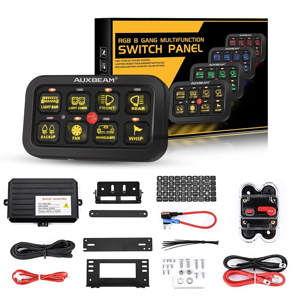 smafay Welcome Description The New RGB switch panel is now available! We do some big upgrades on switch panel! The latest system can be operated via switch panel or smartphone. It’s not limited to just controlling the “ON/OFF” of the LED Lights or electrical devices. Change the color and lighting modes to have fun programming with Auxbeam latest RGB switch panel! Upgraded Functions: ★ RGB -Unlimited color options match dash lighting and vehicle ★ 3 mode setting - Toggle/ Momentary/ Pulsed ★ Bluetooth APP control - Access to accessories no matter whether you are in the vehicle ★ Group setting - Set up a group via APP to control 2 or more lights at the same time ★ DIY switch panel - 60pcs stickers/ 200 default icons/ phone album photos Specification: Working voltage: DC 12-24V Max current: 60A Rated voltage: 12V 20A / 24V 10A Operating at 12 Volts: max power rating of 720W Operating at 24 Volts: max power rating of 1200W Switch operation: On-Off Operating temperature: -40°C - +105°C Waterproof rating: IP65 Features: 8-Gang one-sided outlet switch panel. It allows you to control up to 8 different LED lights or devices. Command all your vehicle accessories by the tap of your finger. 2 control methods - Switch panel & Bluetooth APP, work synchronously. Built-in Bluetooth module allows you to program and control the system anytime & anywhere. 3 modes setting. Each switch has 3 kinds of light status, different indicator status represents different working modes. RED-Toggle, Constant light mode BLUE-Momentary, Press & hold the button to turn on, then release the button to turn off GREEN-Pulsed, Flash mode RGB color. Adjust color and brightness to match your vehicle. brightness automatic dimmable. Automatic adjustment according to the brightness variation of the environment. Customize your own switch panel with 60 universal stickers. DIY button icon on APP. 200 default icons or photo from phone album. Setup group. Manage multiple accessories in your custom groups. Set up 2 or more accessories in a group and control them at the same time. Universal fitment. Widely use for Truck, Boat, Car, Bus, Off-road, Powersports, Marine, ATV, UTV, SUV, Heavy-duty machines, etc. Waterproof IP65, high sensitivity, stability and strong anti-interference ability Easy Installation. No complicated wiring, no need to cut a big hole in your vehicle. Plug & play wiring harness can connect the LED lights or accessories easily. Two types of mounting brackets, you can install anywhere you need, such as the dash panel, center console, overhead sunglasses holder, etc. Bluetooth Connection Requirements: Compatible with IOS & Android devices IOS 9.0 or newer version, Android 4.5 newer version Download the “Switch panel” app from Apple store or Google Play Store (free download). Scan QR code on the instructions. Package Included: 1 Set of 8 Gang RGB Switch Panel (all necessary hardware and wiring harness is included) Installation Instructions Guideline for connecting the red, yellow and white control cables: * The red cable connects the master switch power cable to the ACC. If you want to light up the LED lamps before the car start-up, please connect the recommended because the higher the power is, the more the power of the battery will be consumed. Product Display Payment & Shipping We accept Ebay Payment. Payment should be completed within 7 days of auction closing, or Unpaid Dispute will be filed . If you can not pay in time, please contact us. All items will be shipped out within 48 hours after your payment is verified. Return & Replacement 1. Our items come with a Three-month or One-year warranty. We shall pay much attention to your order and will do our best to solve any problems in a professional business manner. 2. If you are dissatisfied with our items, please contact us for return address within 30 days upon receipt of the delivery. The item must be returned with the original package for refund or exchange. Before you return, please check twice to confirm the item not work and contact our customer service representative, let us know the detailed problem or send us some pictures for confirmation. Feedback 1. Dear buyers, we appreciate your business, if you are satisfied with our service, please leave us a positive feedback and 5 scores DSR . Your recognition will make us more confident to develop business and serve you better. 2. Our goal is to make sure you are a happy buyer and pleasant shopping with us. If you have any questions, please contact us for a resolution firstly . Our working time is (GMT+8) Monday to Friday, 9:00-18:00. We will respond your email as soon as we can . 3. We understand the concerns and frustrations you might have, and will do our best to resolve the issues. Please give us the opportunity to resolve any problem. Thank you for visiting my store!