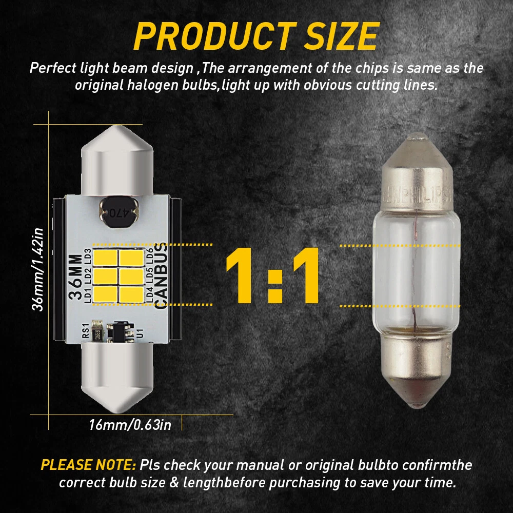 Feature: 1. Perfect light beam design: The arrangement of the chips is same as the original halogen bulbs, light up with obvious cutting lines. 2. 3020 LED Chip: Special Customized 3020 High Brightness LED Chips. High Brightness, low consumption. LED chips arranged in dense, light more focus. 3. CANBUS ERROR FREE: High quality Electronic component. High precision fiber circuit board for longer lifespan. Built-in intelligent IC Driver for optimal current flow and performance. 4. Wide Voltage design: Ensures Canbus error free for most vehicles. 5. Aviation Aluminium Cover: The big Aluminum back extend the heat dissipation surfacce protect the bulb melt from high teperature. AUXITO 6418 C5W 36MM Festoon LED Plate License Tag Bulb Light Bright White K Feature: 1. Perfect light beam design: The arrangement of the chips is same as the original halogen bulbs, light up with obvious cutting lines. 2. 3020 LED Chip: Special Customized 3020 High Brightness LED Chips. High Brightness, low consumption. LED chips arranged in dense, light more focus. 3. CANBUS ERROR FREE: High quality Electronic component. High precision fiber circuit board for longer lifespan. Built-in intelligent IC Driver for optimal current flow and performance. 4. Wide Voltage design: Ensures Canbus error free for most vehicles. 5. Aviation Aluminium Cover: The big Aluminum back extend the heat dissipation surfacce protect the bulb melt from high teperature. Specification: Brand:AUXITO Item Specifics Brand AUXITO Lighting Technology LED Suitable For Trunk Light,Map Light,License Plate Light Number of Bulbs 2 Type LED Interior Light Bulbs OE/OEM Part Number AUXITO-36MM Color Temperature 6000K Wattage 3.6W/Bulb Voltage 9-16V Lumens 360LM/Bulb Interchange Part Number 36MM 6641 6418 6461 Bulb Type 36mm 3423 3425 6411 6418 6423 6461 DE3425 C5W Color White MPN AUXITO-36MM Lighting Type Dome/Map/Door/Trunk/Vanity Mirror Lights Technology LED Placement on Vehicle Front Manufacturer Warranty 1 Year Festoon Bulb Type 36MM To Fit Trunk Light,Map Light,License Plate Light Package includes 2x LED bulbs It also fits many other cars As long as your bulb type is the same with this Bulb Fitment Code 36MM Ballast Included Yes Light Color Clear Fitment Type Direct Replacement Beam Type Dome/Map/Trunk /License Plate/Vanity Lights Purpose Entry Lighting Features CANbus Compatible Payment 1. We can only accept payment from PayPal. 2. Please keep the consistency of Paypal address and ebay address. Shipping 1. All items will be shipped in 12 hours after receiving your payment . 2. We ship this item to US only via USPS first class mail. It usually takes 3-5 working days to deliver. Returns 1. We offer 30 days return policy. 2. Please contact us within 30 days from the date you receive your package if you have any questions with the products . 3. Refund will be sent after we got your returned package. 4. All returned items should be in the original packaging with tracking number. Contact Us We work from Monday - Saturday 9:00AM - 6:00PM, but we will reply once we get your message. There will be delay on response if you send message or E-Mail on Sunday. DESCRIPTION PAYMENT SHIPPING RETURN POLICY CONTACT US Shop Category Store Home Other Hot Item 1set Control Knob Speed Fan Heater A/C For Jeep Wrangler TJ 99-06 5011218AA USD 9.99 For 2002-2008 Dodge Chrysler Stereo Car Radio Wiring Harness Adapter USD 11.59 Door Latch Cables LH+RH Front For 2007-2013 Chevy Silverado 1500 2500 HD 3500 HD USD 17.99 Rear Left or Right Outside Door Handle for 2010-2016 Toyota 4Runner Lexus GX460 USD 14.99 Universal Car Windshield Wiper Squirter Washer Nozzle Spray Jet Kit Fluid Hose T USD 9.99 New List Item Auto Transmission Filter Kit Fit 2007-18 Oil Pan Nissan Gasket Rogue Altima Juke USD 17.09 Fits 2007-2011 Honda CR-V CRV Window Visors Vent Sun Shade Rain Guards Deflector USD 34.19 Folding License Plate Tag Bracket Taillight Holder Fit ATV Dirt Bike Motorcycle USD 9.49 Tail Light Lamp w/Bulbs Replacement Right Passenger Side For 2009-18 Dodge Ram USD 41.79 Right Passenger Side Mirror W/ Glass Electric Heated For 2011-2021 Dodge Charger USD 17.09 Excellent Delivery AUXITO 6418 C5W 36MM Festoon LED Plate License Tag Bulb Light Bright White K Feature: 1. Perfect light beam design: The arrangement of the chips is same as the original halogen bulbs, light up with obvious cutting lines. 2. 3020 LED Chip: Special Customized 3020 High Brightness LED Chips. High Brightness, low consumption. LED chips arranged in dense, light more focus. 3. CANBUS ERROR FREE: High quality Electronic component. High precision fiber circuit board for longer lifespan. Built-in intelligent IC Driver for optimal current flow and performance. 4. Wide Voltage design: Ensures Canbus error free for most vehicles. 5. Aviation Aluminium Cover: The big Aluminum back extend the heat dissipation surfacce protect the bulb melt from high teperature. Specification: Brand:AUXITO Payment Shipping Returns Contact Us 1. We can only accept payment from PayPal. 2. Please keep the consistency of Paypal address and ebay address. 1. All items will be shipped in 12 hours after receiving your payment . 2. We ship this item to US only via USPS first class mail. It usually takes 3-5 working days to deliver. 1. We offer 30 days return policy. 2. Please contact us within 30 days from the date you receive your package if you have any questions with the products . 3. Refund will be sent after we got your returned package. 4. All returned items should be in the original packaging with tracking number. We work from Monday - Saturday 9:00AM - 6:00PM, but we will reply once we get your message. There will be delay on response if you send message or E-Mail on Sunday. All rights reserved. On Nov 12, 2024 at 20:51:04 PST, seller added the following information: