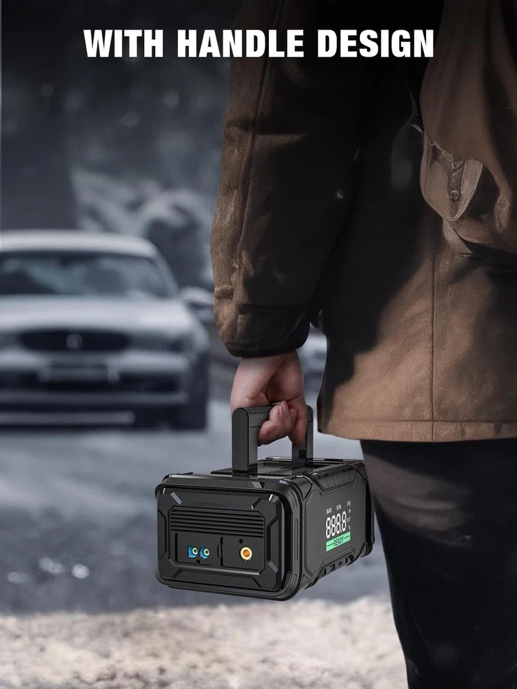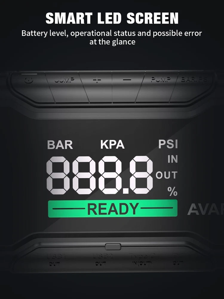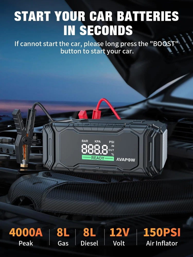 AVAPOW Car Battery Jump Starter 4000A Peak with Air Compressor, 12V 150PSI Portable Jumpstart with Force Start Function, Portable Starters for Up to 8L Gas 8L Diesel Engine, PD 60W Fast Charging Product Details Brand: AVAPOW Product Dimensions: 5.12"D x 3.85"W x 9.56"H Item Weight: 1.76 Kilograms Amperage: 4000 Amps Peak Output Current: 4000 Amps Manufacturer: DONGGUAN CARPOWER NEW ENERGY CO. ,LTD Item Weight: 3.87 pounds Batteries: 1 Lithium Ion batteries required. (included) Manufacturer Part Number: AP6 Brand: AVAPOW Product Dimensions: 5.12"D x 3.85"W x 9.56"H Item Weight: 1.76 Kilograms Amperage: 4000 Amps Peak Output Current: 4000 Amps Battery Cell CompositionVoltage: Lithium12 Volts Vehicle Service TypeBattery Capacity: All of the above22000 Amp Hours POWERFUL STARTING CAPABILITY - AVAPOW AP6 jump starter boasts a robust starting capability, ensuring a safe and reliable jump start for your car battery. With 4000 peak amps, this battery jumper starter suitable for vehicles with engines up to 8.0L Gas/8.0L Diesel, and can deliver up to 50 jump starts on a single charge. 60W IN/OUT Fast Charging Jump Starter - AVAPOW car jump starter employs 60W USB-C IN/OUT fast charging technology, enabling the jump starter's battery pack to go from 0% to 100% in just 1.5 hours. Additionally, this car battery jump starter can swiftly power up your laptop. Designed for a standby time of approximately 24 months, this jump starter is always ready to assist you, ensuring you're prepared for any situation. (45W wall charger not included) THE OUTSTANDING AIR COMPRESSOR - The AVAPOW AP6 portable jump starter features a robust 150 PSI digital compressor, offering precise tire inflation with an automatic shut-off function and a dedicated nozzle. This makes it an essential companion to jump-starting cables in any automotive toolkit. SMART LARGE DISPLAY - The AVAPOW jump starter with air compressor Boasting a 3.3-inch LCD intelligent screen, this portable jump starters is incredibly user-friendly. It offers real-time monitoring and displays crucial information such as operational status, battery level, and potential errors. This intuitive interface provides you with a clear understanding of the car jump starter's battery pack at a glance. SECURE CLAMP DESIGN - The AVAPOW car jumper features a cleverly designed cable with eight protective functions, including spark-proof technology. This means it won't produce sparks even if connected incorrectly, ensuring added safety during use.