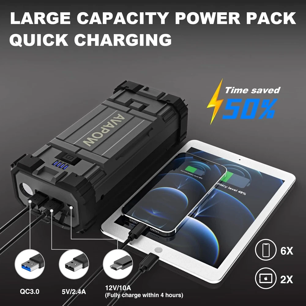 AVAPOW Jump Starter 2000A Peak Portable Battery Jump Starter for Car with Dual USB Quick Charge 3.0(Up to 8.0L Gas or 6.5L Diesel),12V Jump Box,Compact Lithium Car Power Pack Product Details Brand: AVAPOW Product Dimensions: 7.28"D x 3.54"W x 1.57"H Item Weight: 1.3 Pounds Amperage: 2000 Amps Peak Output Current: 2000 Amps Cable Length: 26 Inches Manufacturer: Shenzhen Crosstech Co., LtdAVAPOW Item Weight: 1.25 pounds Item model number: A18 Batteries: 4 Lithium Ion batteries required. (included) Is Discontinued By Manufacturer: No Manufacturer Part Number: A18 Brand: AVAPOW Product Dimensions: 7.28"D x 3.54"W x 1.57"H Item Weight: 1.3 Pounds Amperage: 2000 Amps Peak Output Current: 2000 Amps Battery Cell CompositionVoltage: Lithium Ion12 Volts Vehicle Service TypeBattery Capacity: Passenger Car18000 Milliamp Hours PORTABLE & POWERFUL BATTERY STARTER - With 2000A peak current,this AVAPOW A18 car jump starter can start up to 8L gasoline engines or 6.5L diesel engines in seconds- up to 40 jump starts on a single full charge.Suitable for all car, truck, motorcycle, boat, RV or tractor ATVs, UTVs, lawnmowers, snowmobiles, etc,meanwhile this jump pack is ultra lightweight and portable. INTELLIGENT SAFETY PROTECTION - The portable jump box for vehicles works with intelligent jumper clamp which provides 8 safety protections to ensure it's safe to use,including Reverse Polarity Protection,Short Circuit Protection,High-Temperature Protection,Low-Temperature Protection,High-Voltage Protection,Low-Voltage Protection,Timeout Protection and etc DUAL USB QUICK CHARGE - This jump starter battery pack is also a portable car power pack with high capacity.This car battery charger jump starter is equipped 2 usb output ports including one quicking charging(5V/3A 9V/2A 12V/1.5A). It can save your 50% time when you charge your cellphones, tablets, Kindles or digital cameras. MULTIFUNCTIONAL LED LIGHT - The car battery jump starter is equipped with 3 modes of LED light(Lighting/ Flash/ SOS)and easily convert lighting modes by switching the power button.Ultra bright light can help you start the car more conveniently at night, strobe and sos mode can act as a lifeguard in emergency situations. PACKAGE CONTENT - 1 X AVAPOW A18 portable car Jumper,1 X smart jumper cables,1 X USB Type-C Charging Cable,1 X High-value EVA Protection Case,1 X User manual in 5 languages,and professional & 24-hour online after-sales team for your any issue. NOTE - The 2023 upgraded jumper cable can start your low voltage battery