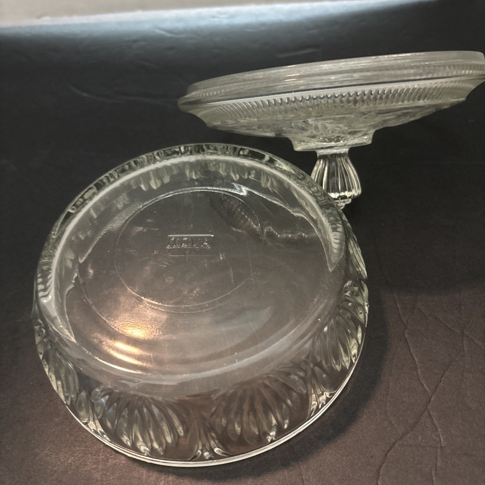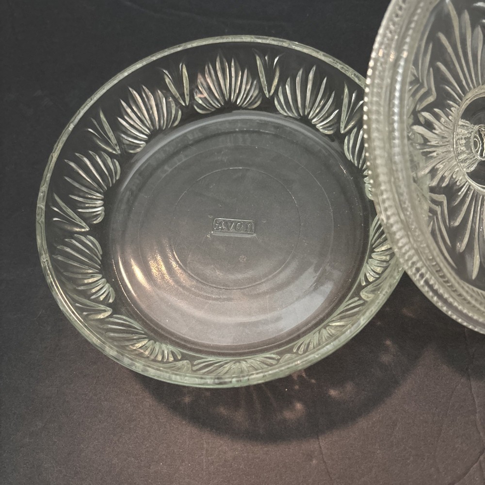 The AVON Clear Pressed Glass Covered Candy Dish is a vintage decorative collectible that showcases a Victorian style design. Made of clear pressed glass, this candy dish features a cover that adds to its charm. Ideal for storing candy or trinkets, this original Avon piece is a unique and elegant addition to any home decor collection. There is a little rough spot. See photo.