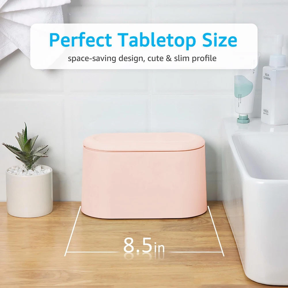 AYADA Mini Trash Can with Lid, Press-Type with Removable Inner Plastic Small Garbage Can Little Tiny Waste Basket Compact Covered Closable Trash Bin, Desk Countertop Office Kids Oval Rectangle (Pink) 【Desktop Trash Can with Lid】 The new mini trash bin with lid can effectively reduce the spread of odors and isolate fruit flies. Beautiful hidden trash bag and fresh color design, it can even become the perfect decoration for your desktop! 【Easy to Use】Automatic pop-up top lid, one touch open. 7-inch widened trash caliber, double buckles on the side can easily fix the garbage bag. The narrow shape is more suitable for being placed against the wall without occupying your desktop space. 【Quality Materials】Strong and durable polypropylene materials and high-quality alloy spring, rounded edges without any sharp parts, long-term use is not easy to deform. 【Multipurpose】 Suitable for desks, coffee tables, dressing tables, bedside tables, etc. It can also store cosmetics and toiletries to keep your tabletop neat. 【Customer Satisfaction】 We promise you every quality mini trash can and friendly customer service. If you found the mini trash bin you received is defective or any problem in using, please feel free to contact us. Specifications: Material: Polypropylene plastic Size: 8.7x4.3x5.1 in Net weight: 0.6 lb Volume: about 1.5 liters Color: Pink Shipping We offer FREE shipping on all orders! We use a selection of shipping services such as UPS, FedEx, USPS etc. We only ship to the lower 48 states, no APO/FPO addresses or PO Boxes allowed. Local pickups and combined shipping options are not provided at this time. Return You can return a product for up to 30 days from the date you purchased it. Any product you return must be in the same condition you received it and in the original packaging. Please keep the receipt. Payment We accept payment by any of the following methods: PayPal Please pay as soon as possible after winning an auction, as that will allow us to post your item to you sooner! Feedback Customer satisfaction is very important to us. If you have any problem with your order, please contact us and we will do our best to make you satisfied. Contact Us If you have any queries, please contact us via ebay. We usually respond within 24 hours on weekdays. Please visit our eBay store to check out other items for sale! Thank you for shopping at our store.